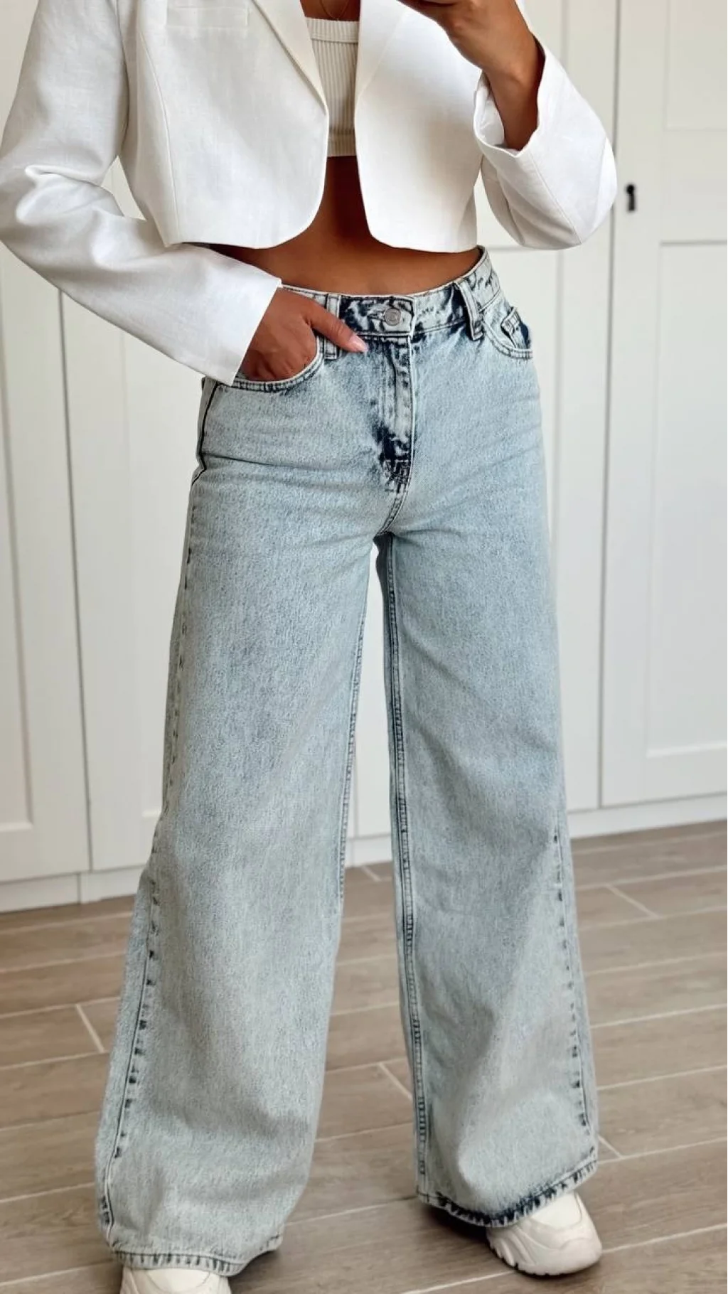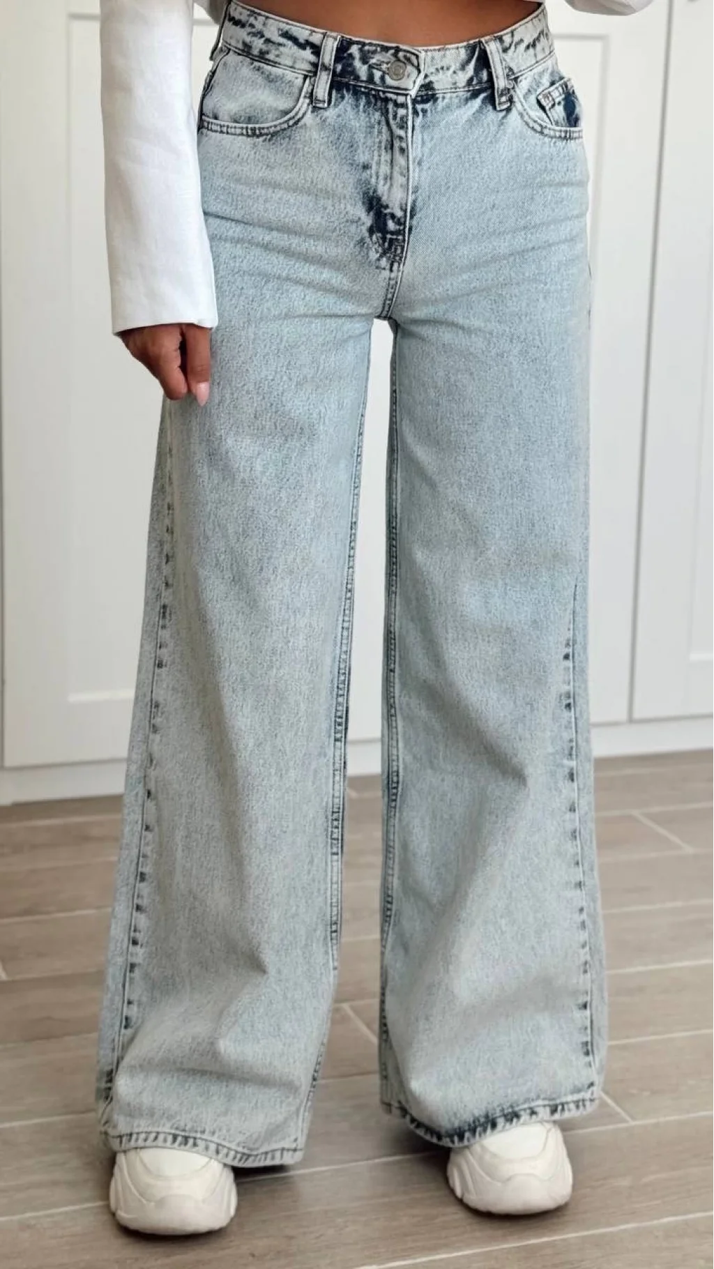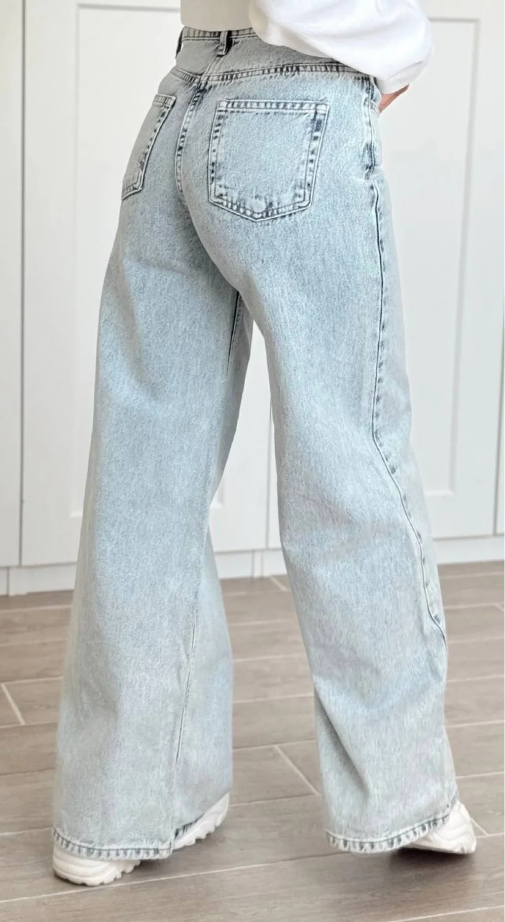 YÜKSEK BEL, ÖNÜ FERMUARLI, GENİŞ PAÇA, METAL DÜĞMELİ, BEŞ CEPLİ JEAN