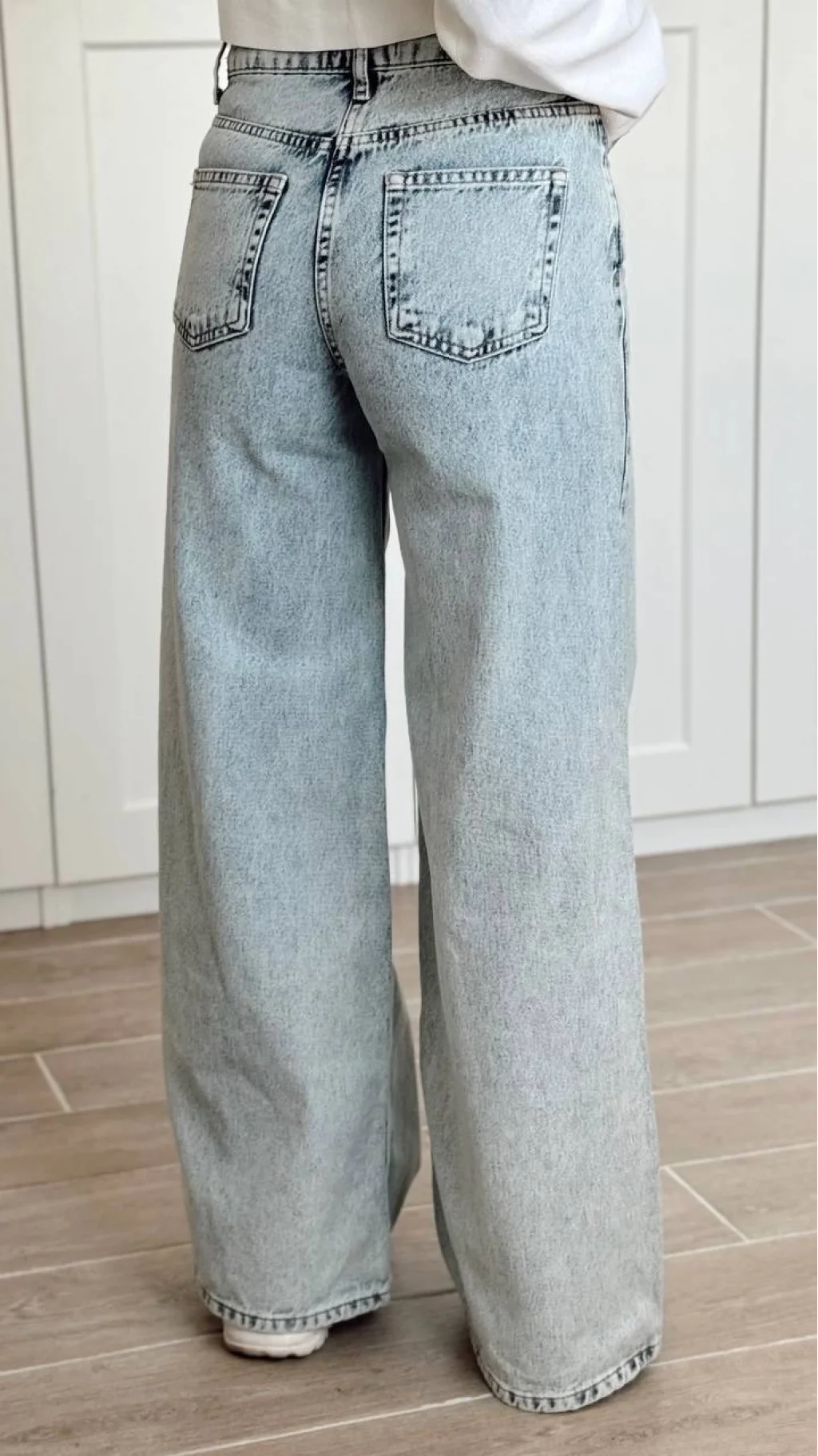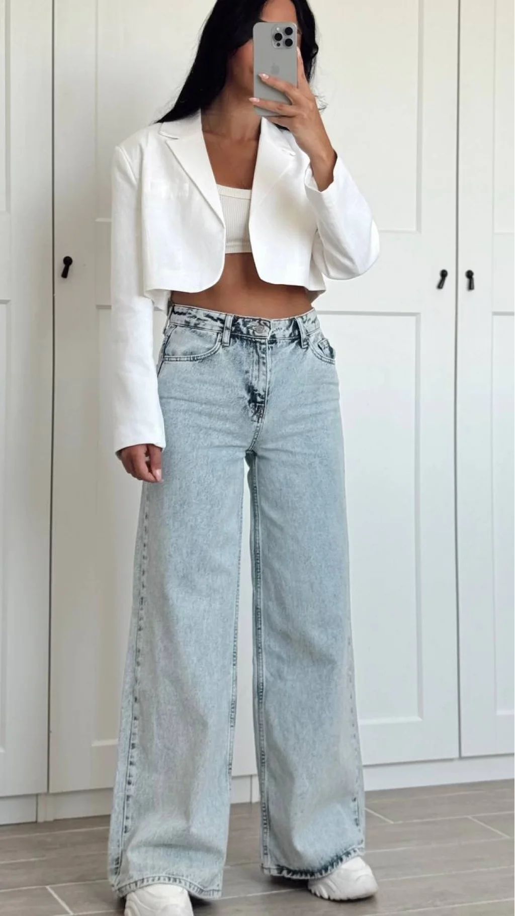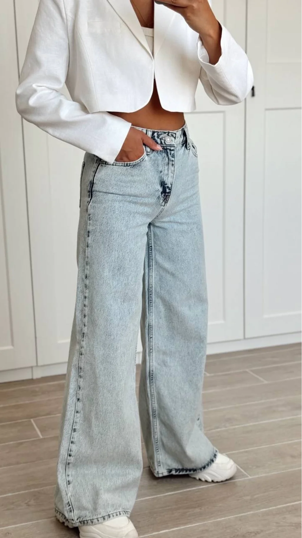 YÜKSEK BEL, ÖNÜ FERMUARLI, GENİŞ PAÇA, METAL DÜĞMELİ, BEŞ CEPLİ JEAN