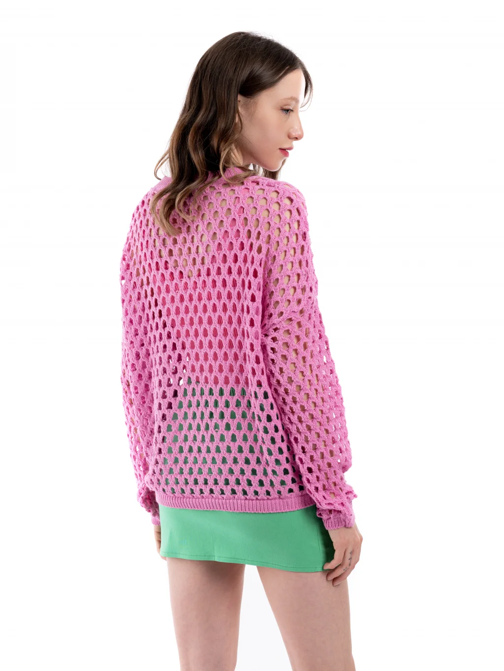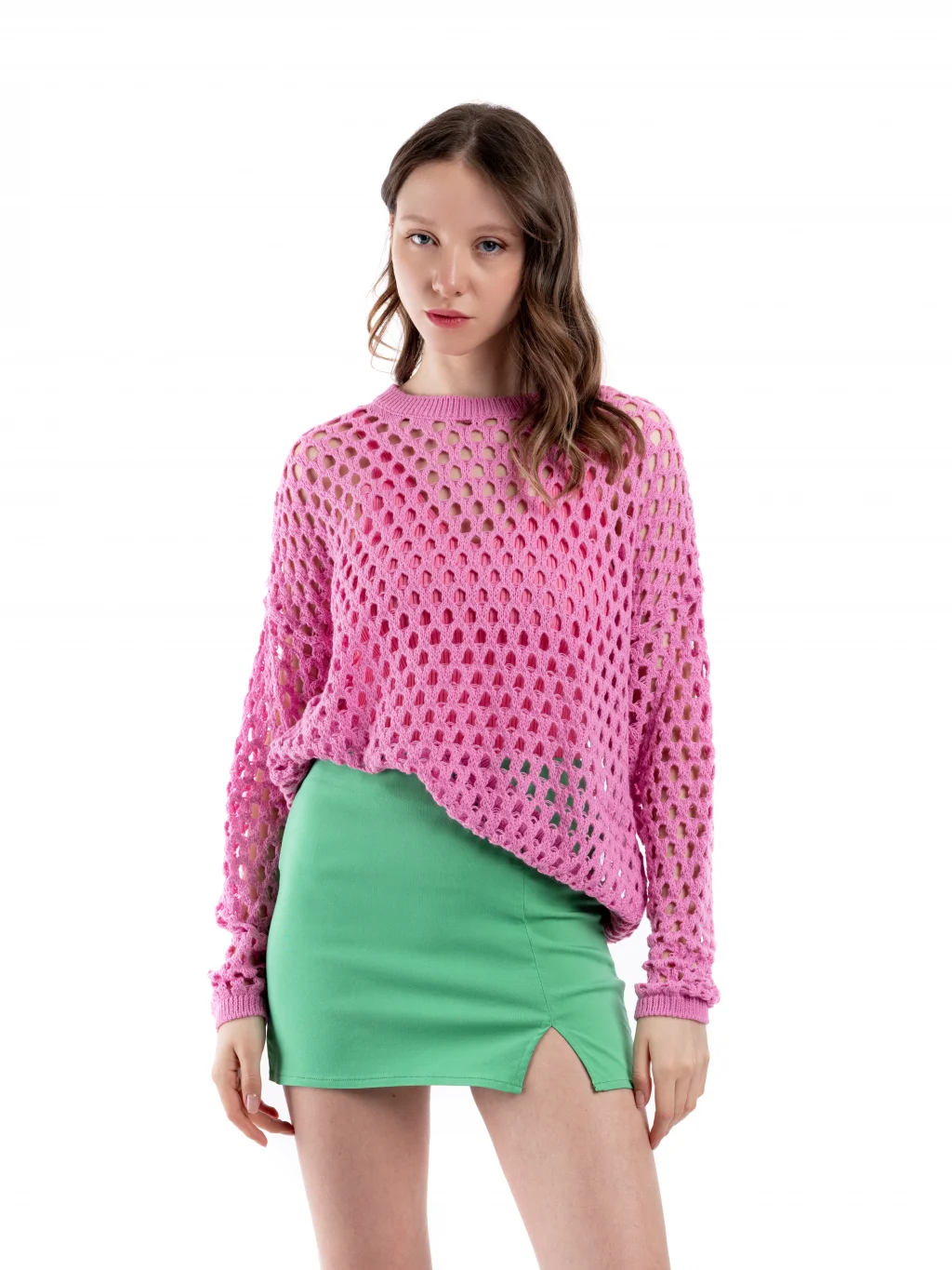Sıfır yaka, uzun kollu, rahat kesim, ajurlu ince triko.