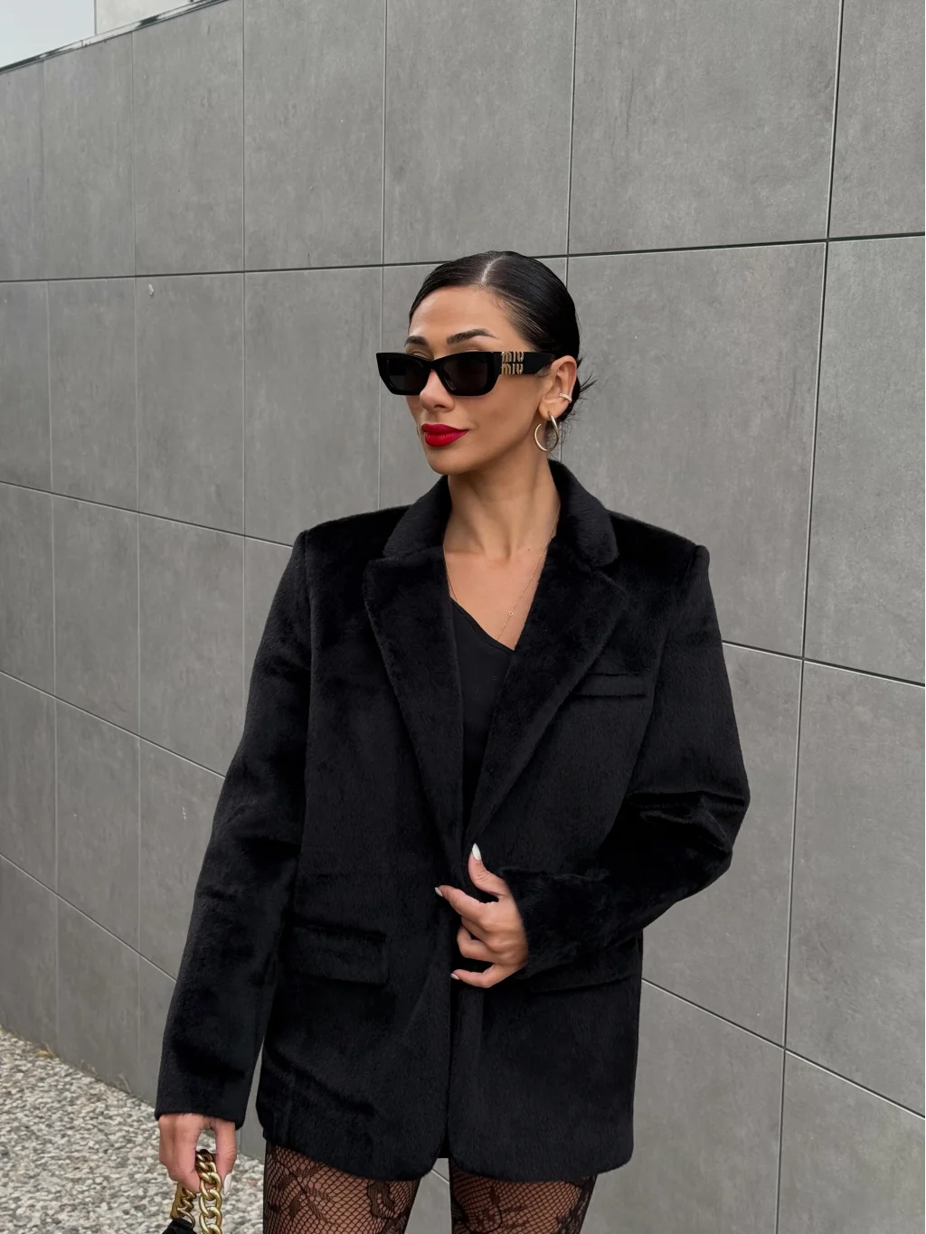Alpaka Doku Kemerli Siyah Peluş Ceket