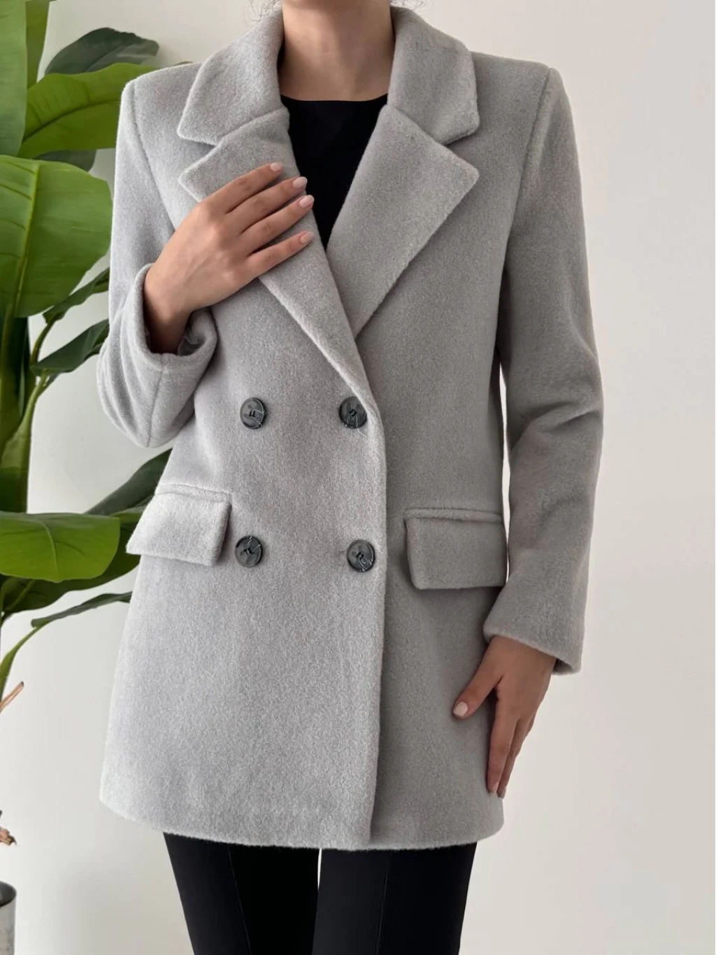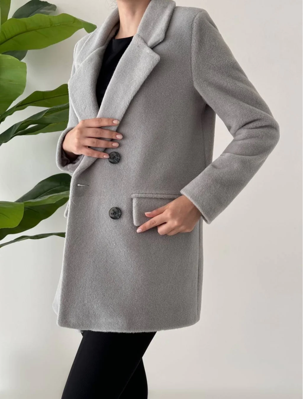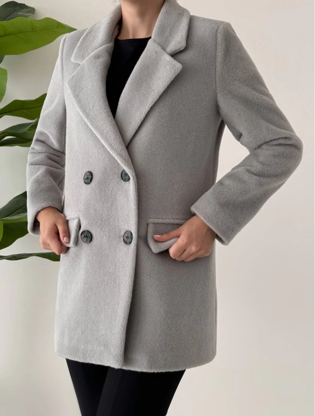 İÇ ASTARLI DÜĞME KAPAMALI ANGORA DOKULU GRİ KISA KABAN