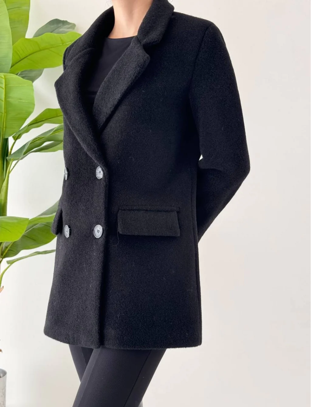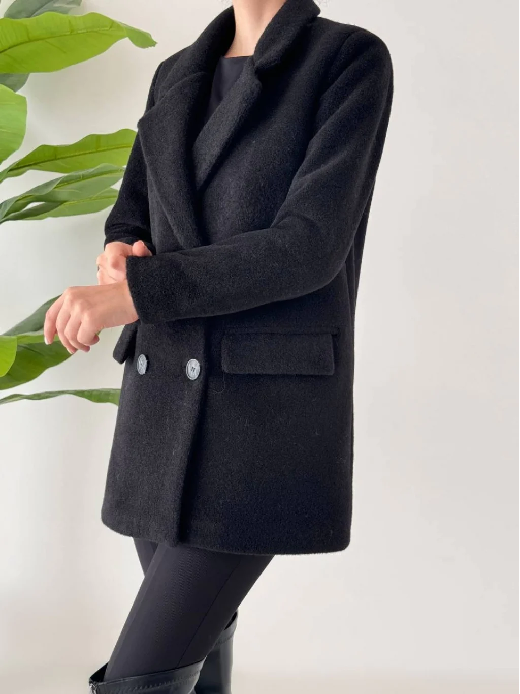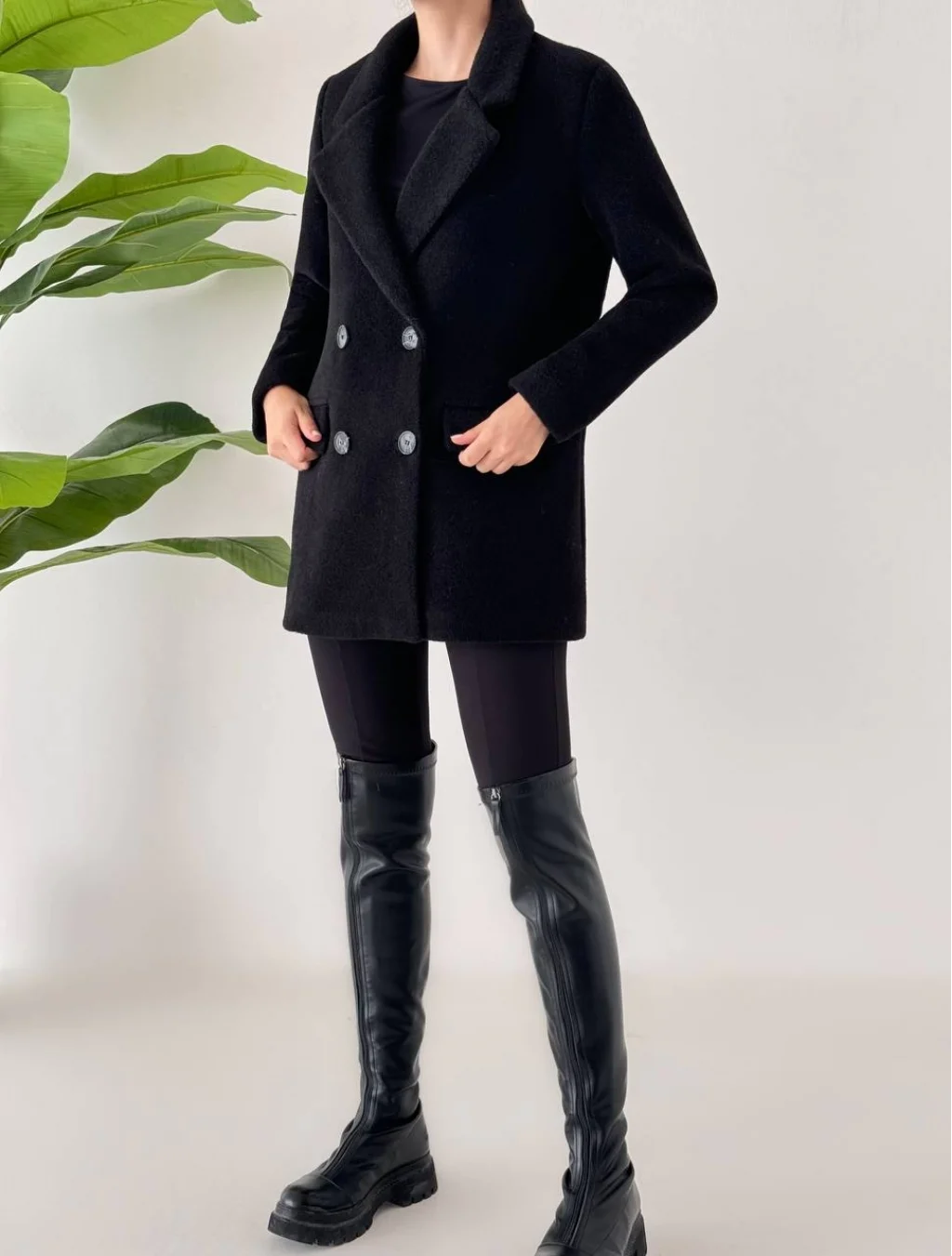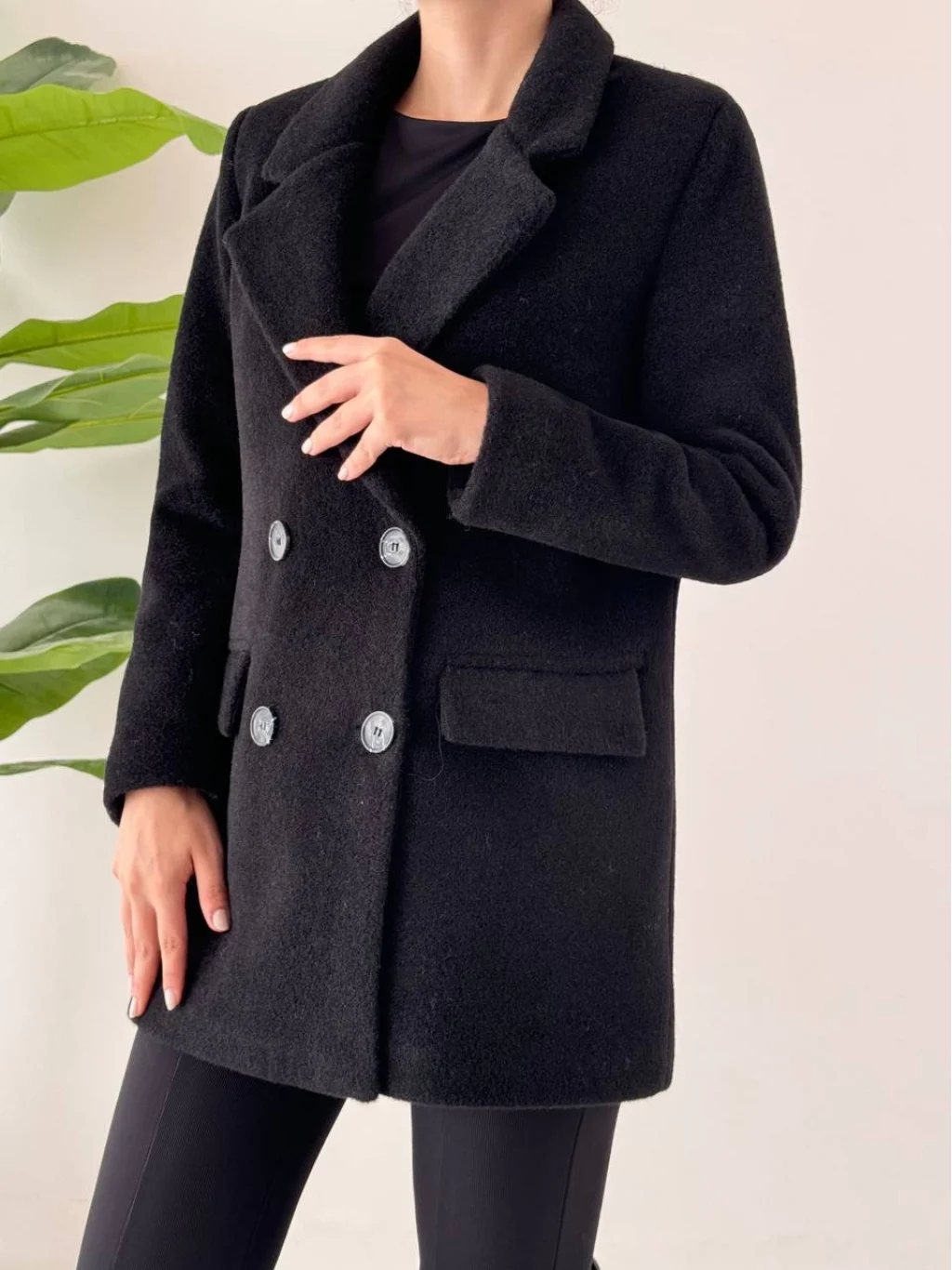 İÇ ASTARLI DÜĞME KAPAMALI ANGORA DOKULU SİYAH KISA KABAN