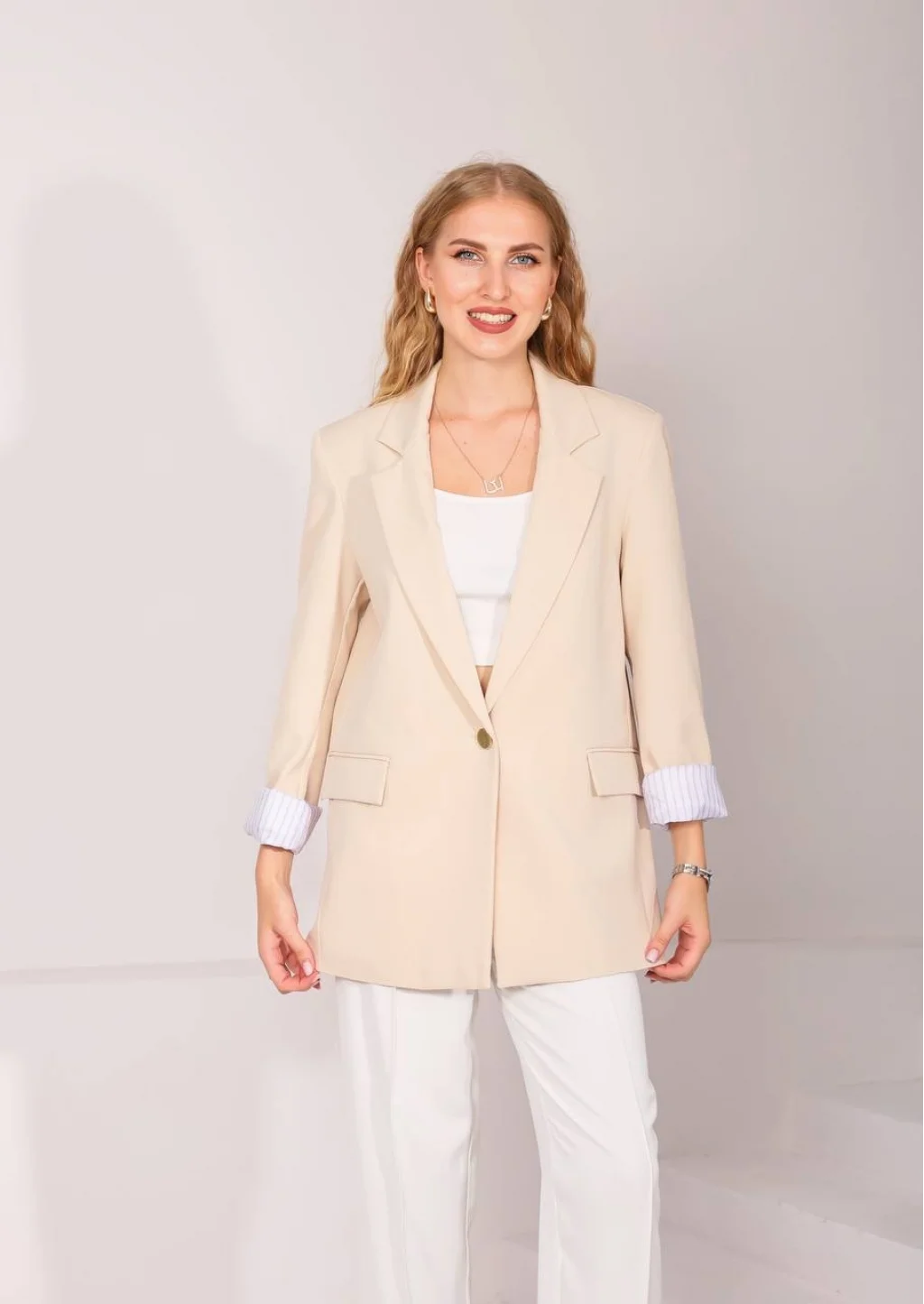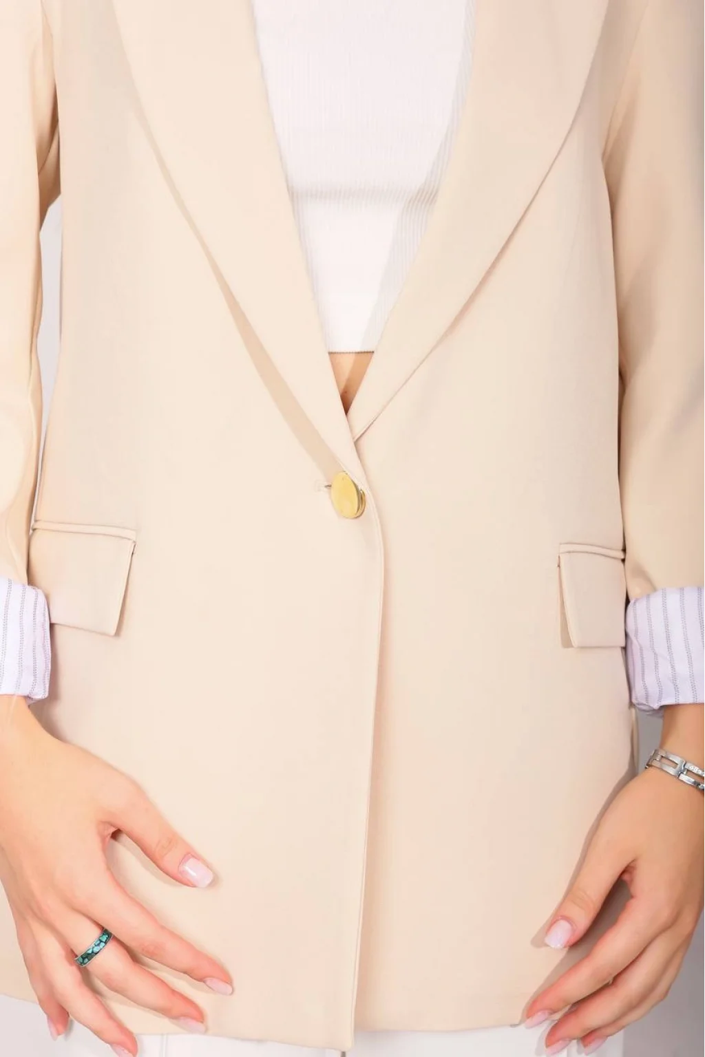 • MYRA Astarı Garnili Blazer Ceket, şıklığınızı tamamlayacak Taş rengiyle öne çıkıyor.