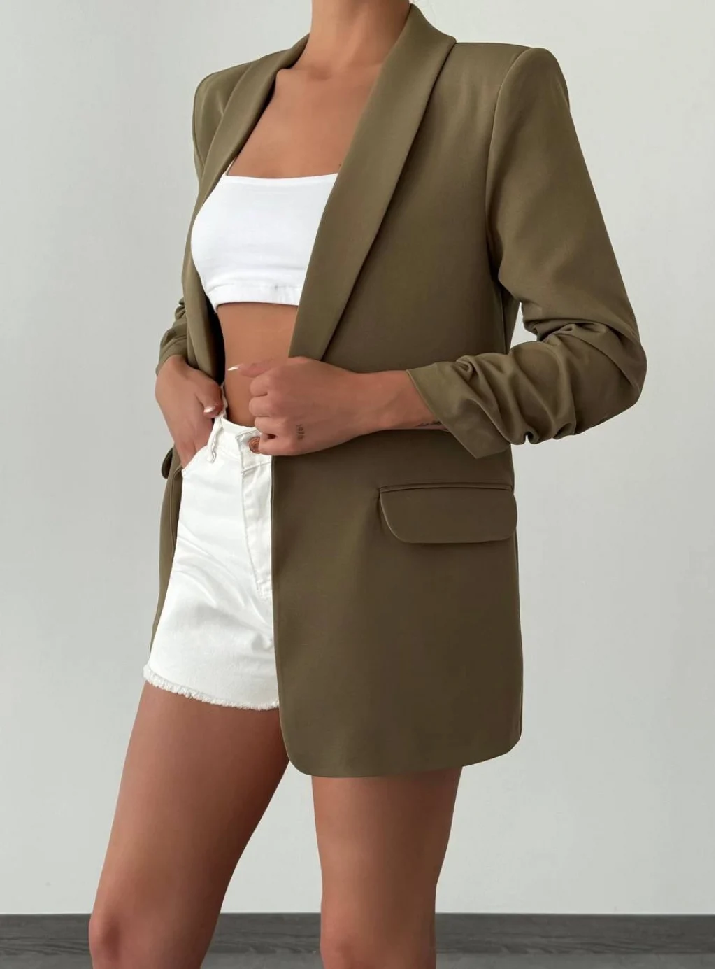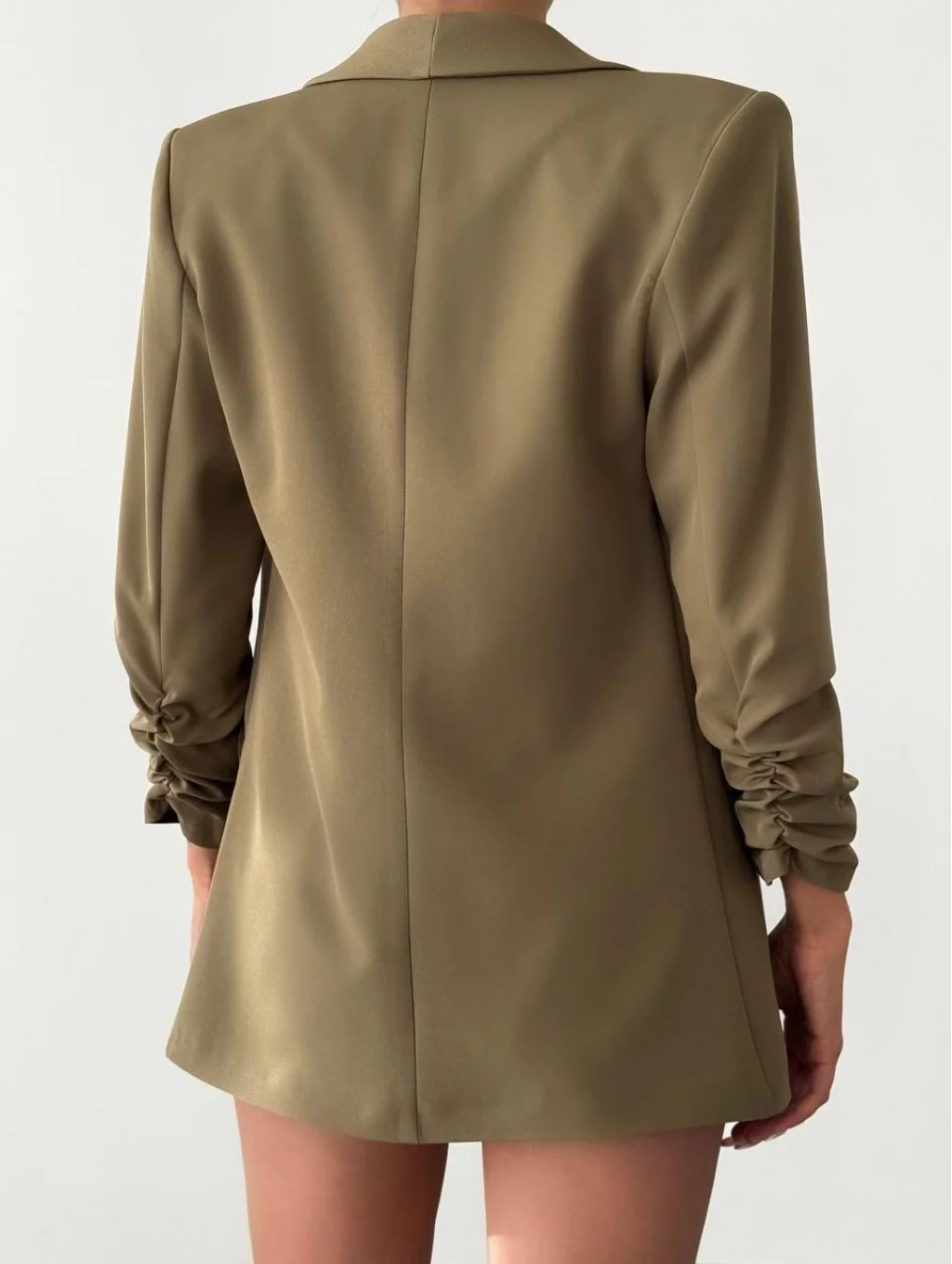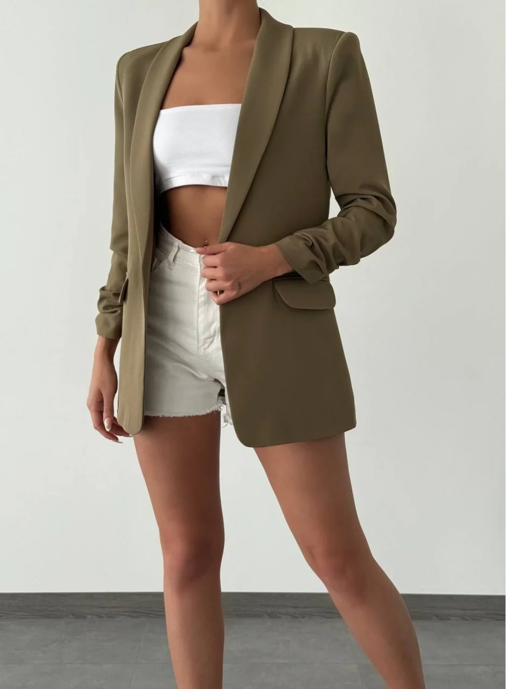 Atlas Kumaş Astarlı Büzgü Kol Tam Kalıp Blazer Ceket Haki