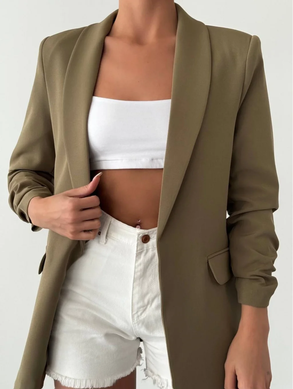 Bu muhteşem Atlas Kumaş Fırfırlı Kol Detayı Tam Kalıp Haki Blazer Ceket ile tarzınızı ortaya koyun. Hafif, nefes alabilen bir kumaştan üretilen ve kollarında zarif bir fırfırlı detaya sahip olan bu blazer ceket, sizi rahat ettirirken şeklinizi düzleştirmek için tasarlanmıştır. Kişiye özel uyum ve zamansız siluet, her seferinde zahmetsizce şık görünmenizi sağlar.