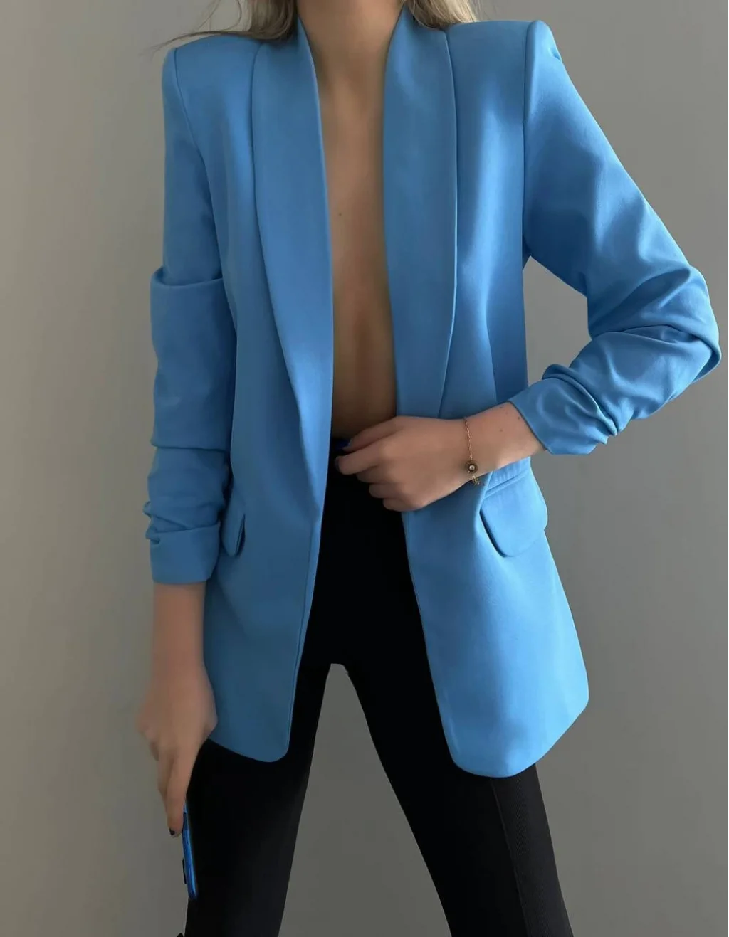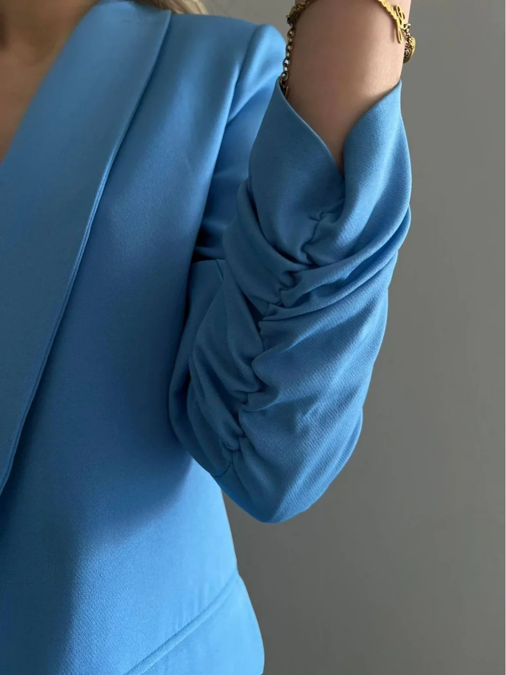Atlas Kumaş Astarlı Büzgü Kol Tam Kalıp Blazer Ceket Mavi