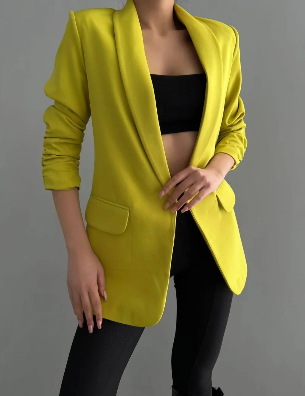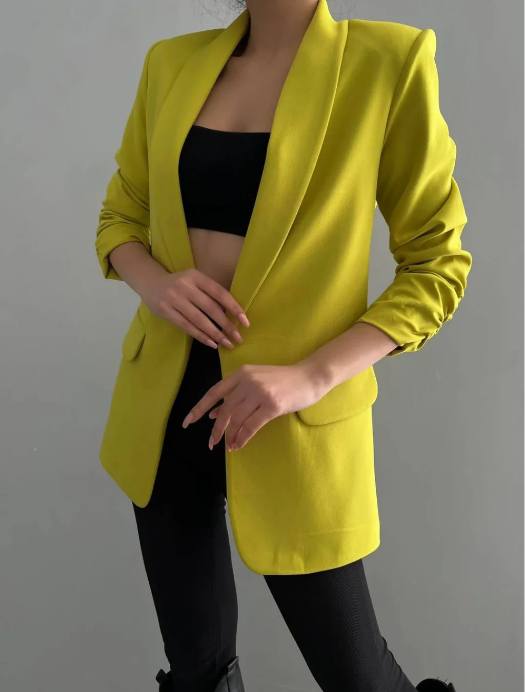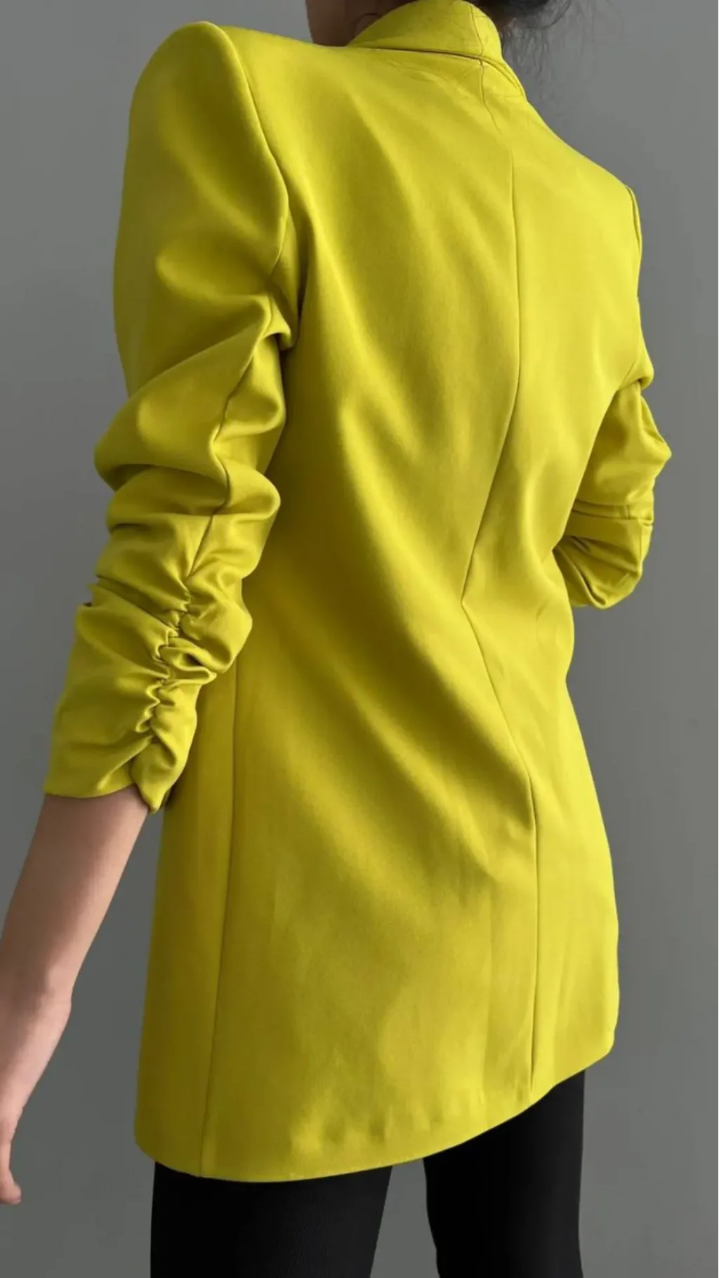 Atlas Kumaş Astarlı Büzgü Kol Tam Kalıp Hardal Blazer Ceket