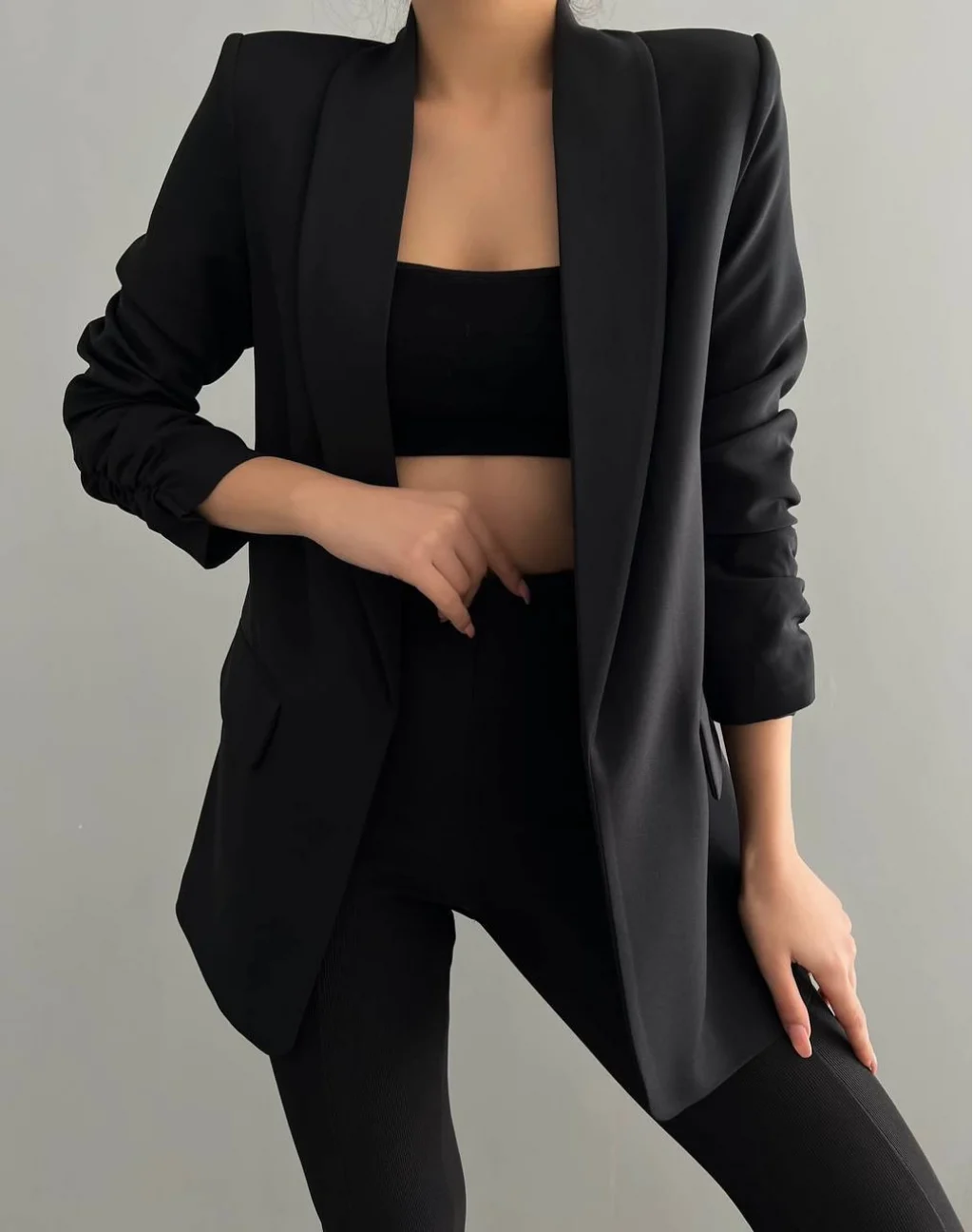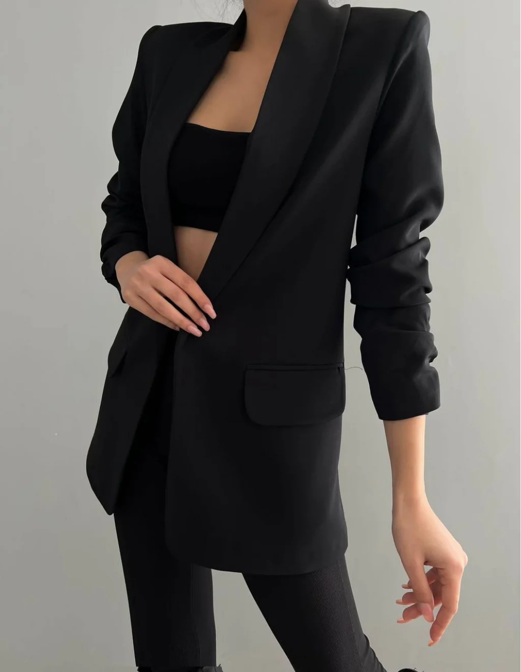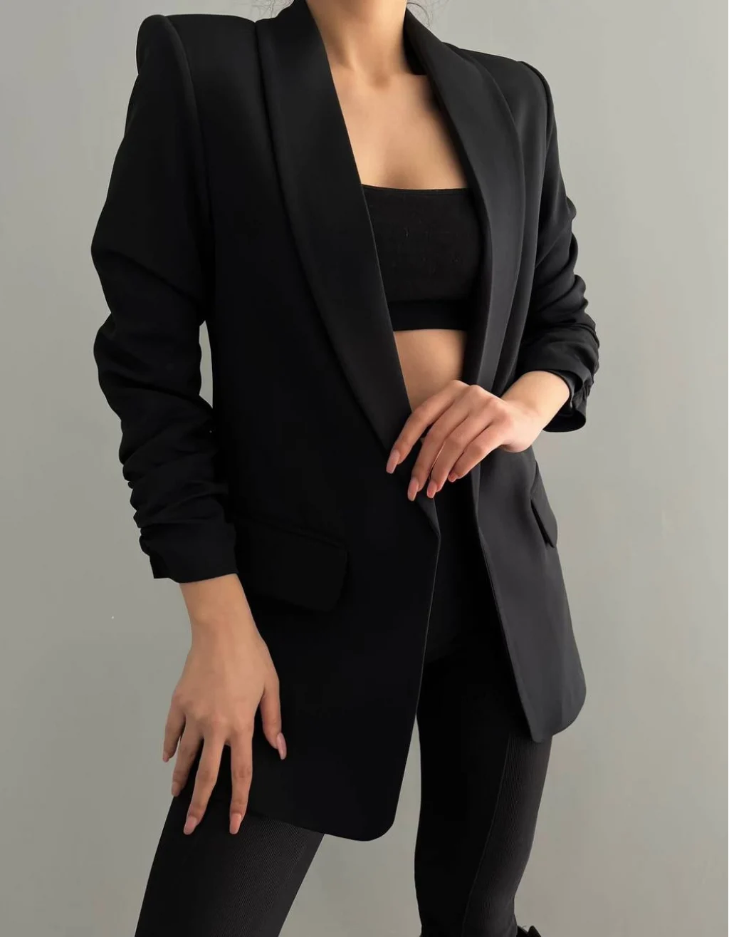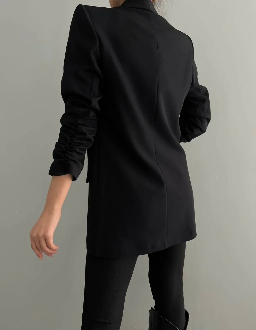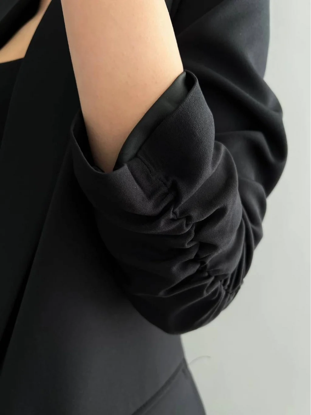 Atlas Kumaş Büzgü Kol Tam Kalıp Siyah Blazer Ceket