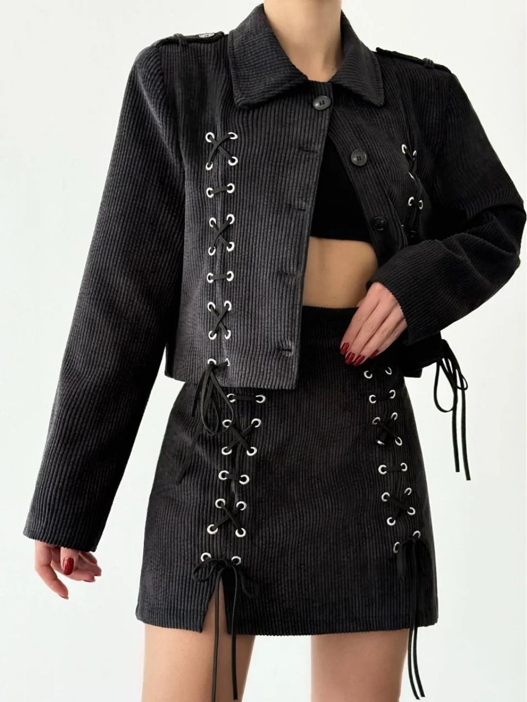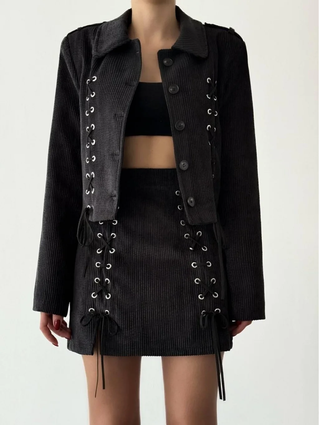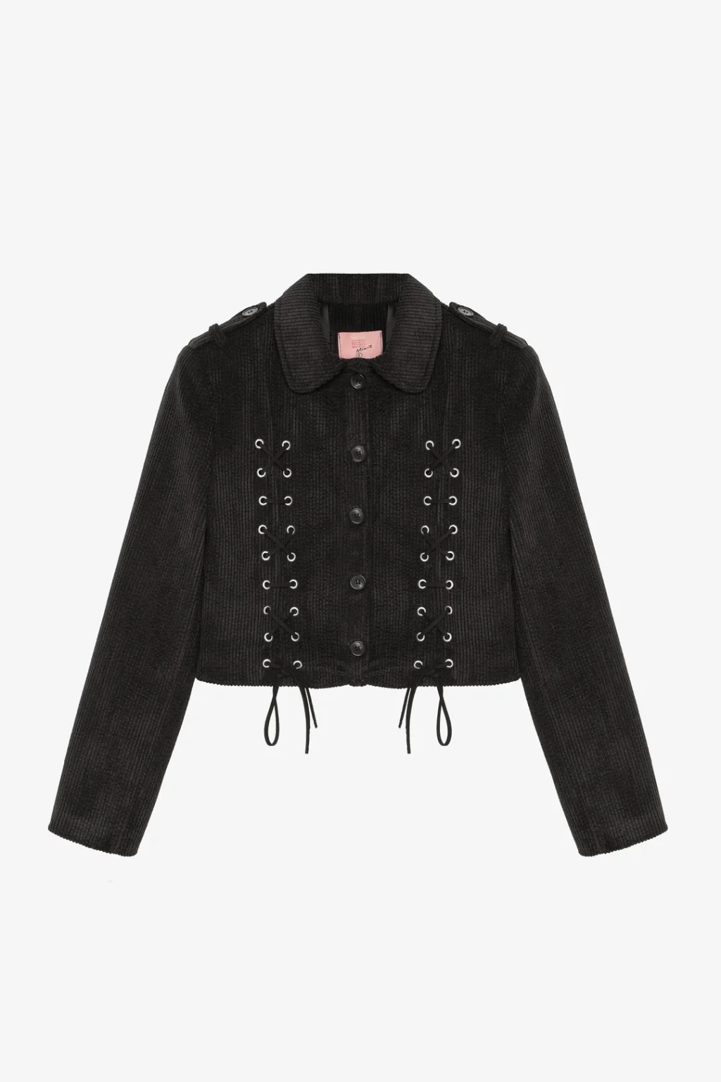 Bağcıklı Kadife Fitilli Siyah Ceket