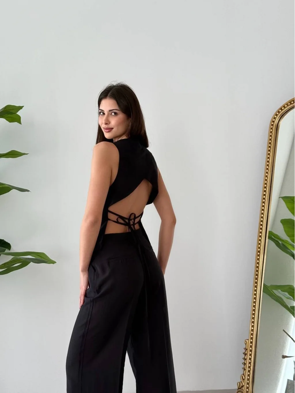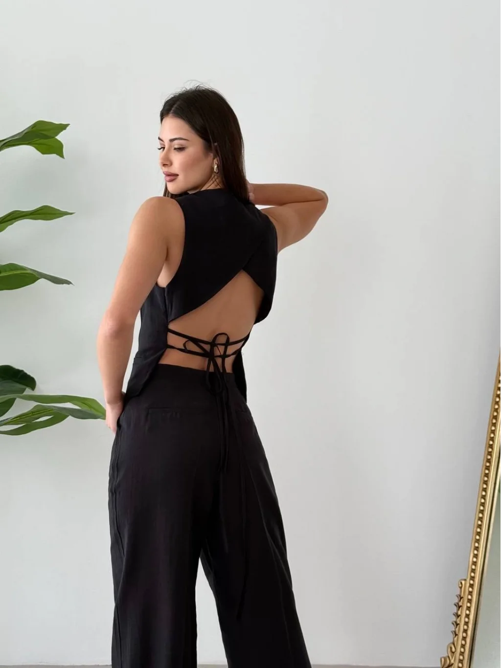 Bağcıklı Sırtı Açık Keten Yelek Pantolon Takım-Siyah
