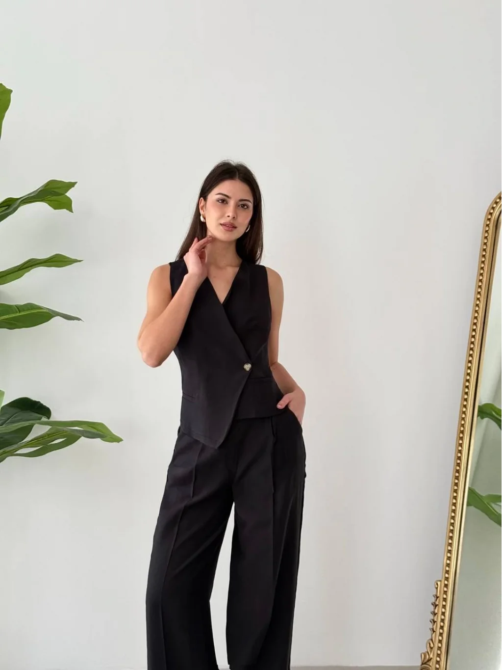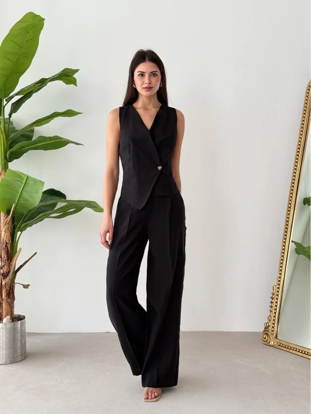 Bağcıklı Sırtı Açık Keten Siyah Yelek Pantolon Takım