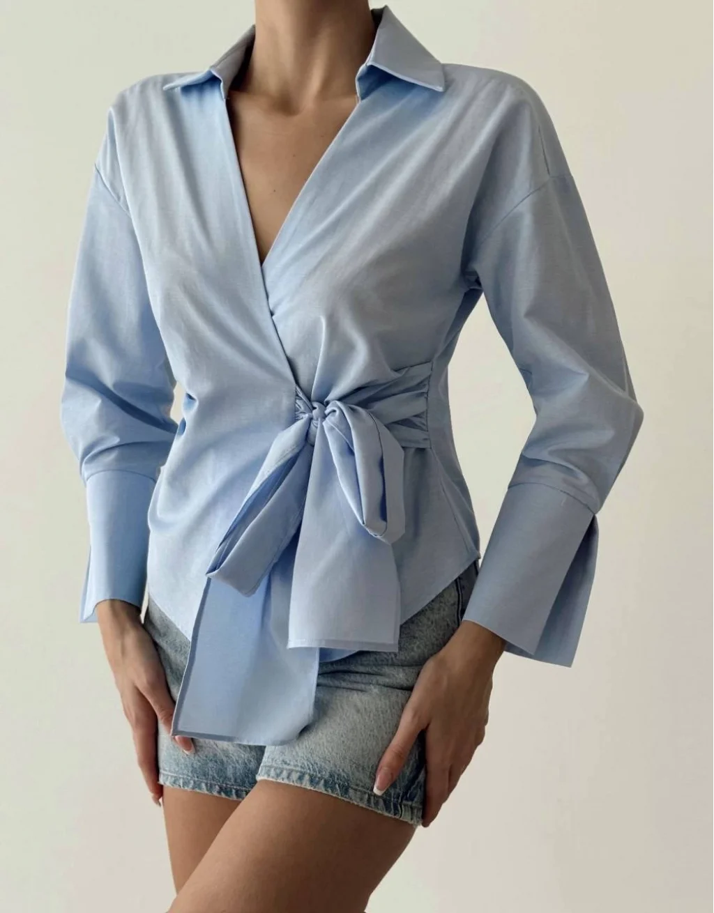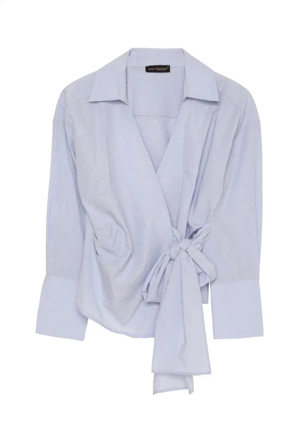 önden bağlamalı, kruvaze yaka, uzun kollu, manşet detaylı, modern ve şık görünüm sunan klasİk kesİm bluz.