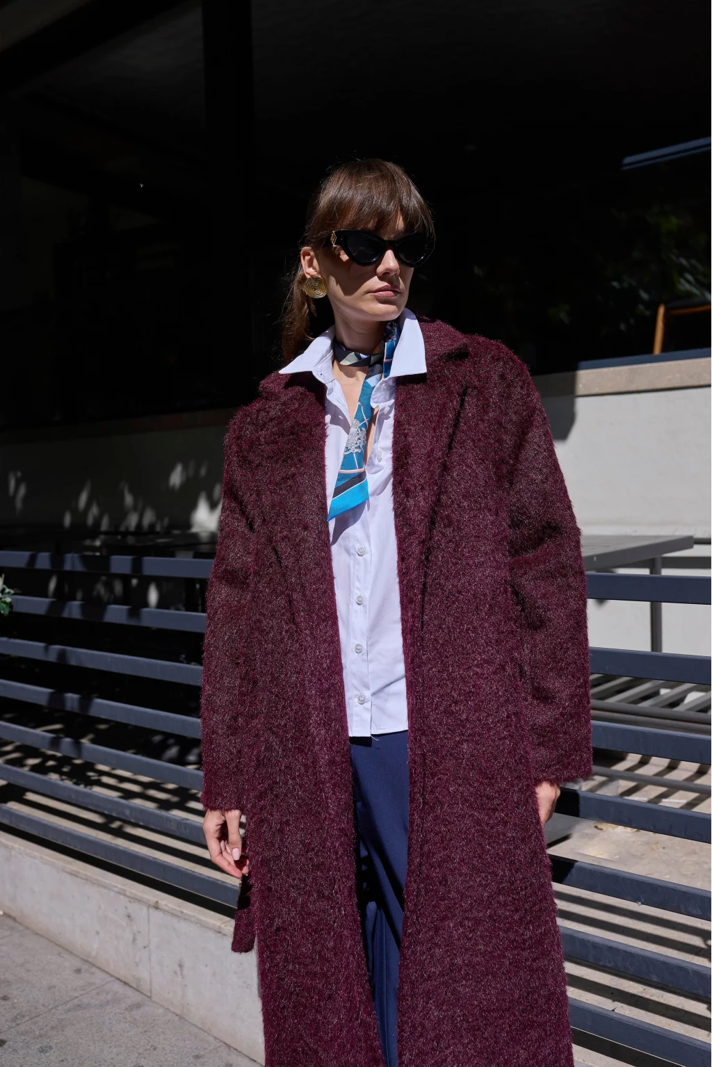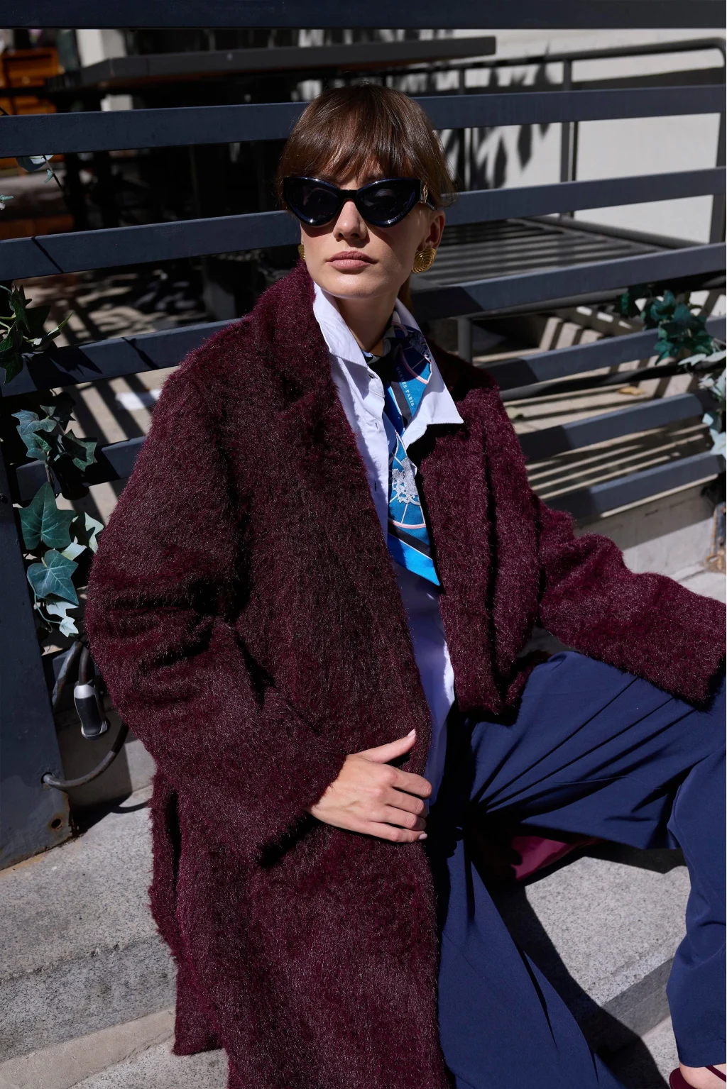 • MYRA'nın bağlamalı tüy dokulu mürdüm kabanı, yalın şıklığıyla dikkat çekiyor.