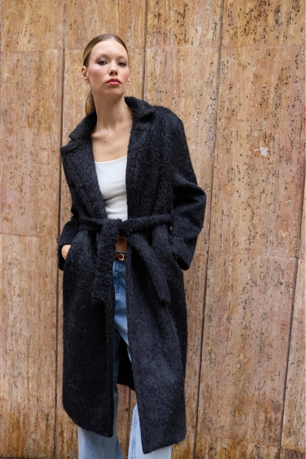 MYRA'nın bağlamalı tüy dokulu siyah kürk kabanı, yalın şıklığıyla dikkat çekiyor.