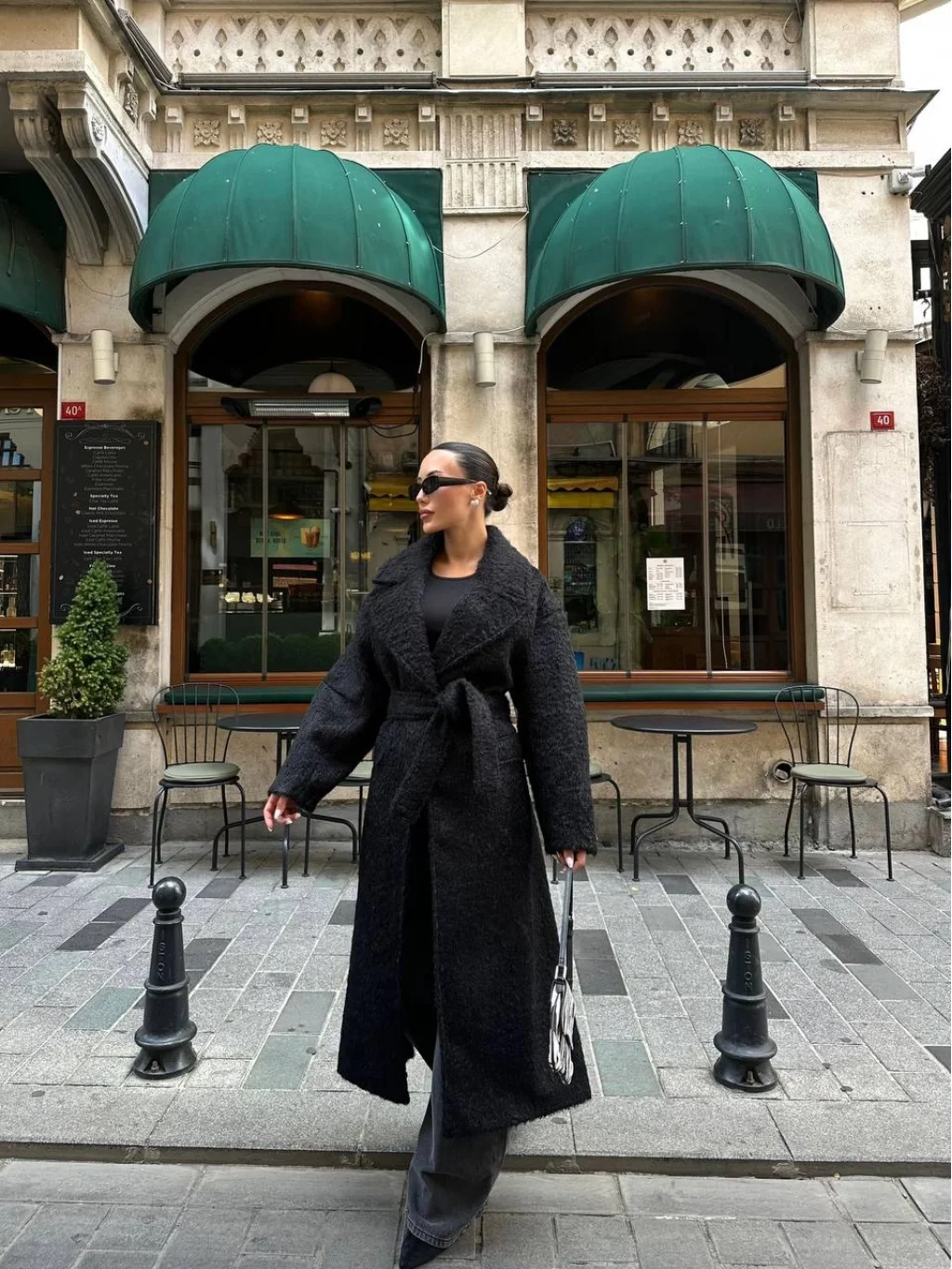 MYRA'nın siyah renkli bağlamalı tüy dokulu yün kabanı, şıklığı ve sıcaklığı bir arada sunuyor.