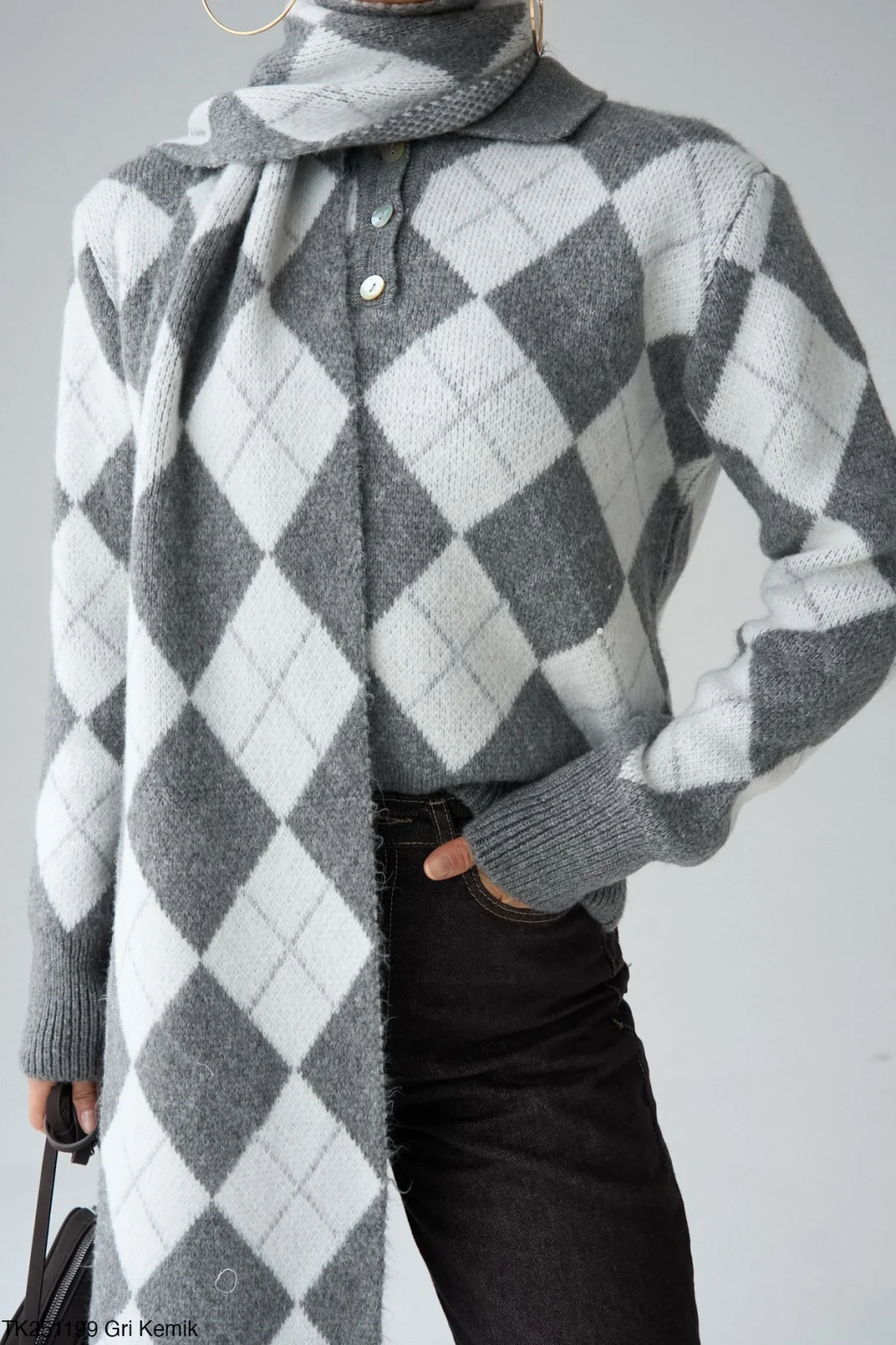 • MYRA Baklava Desen Atkılı Gri Kazak, şıklığı ve sıcaklığı bir araya getiriyor.