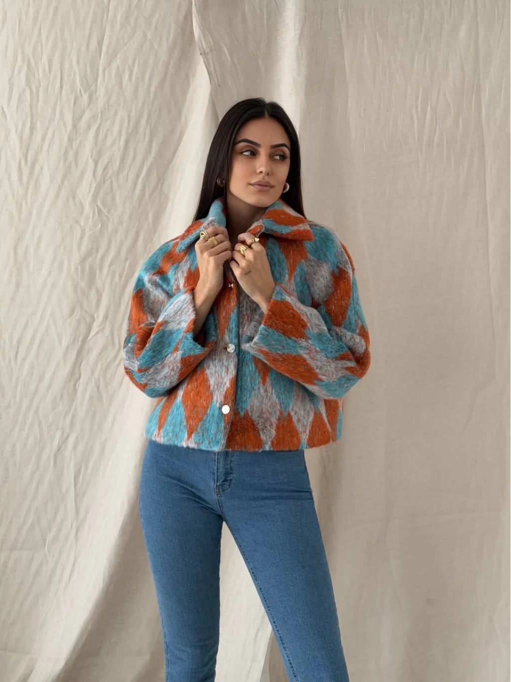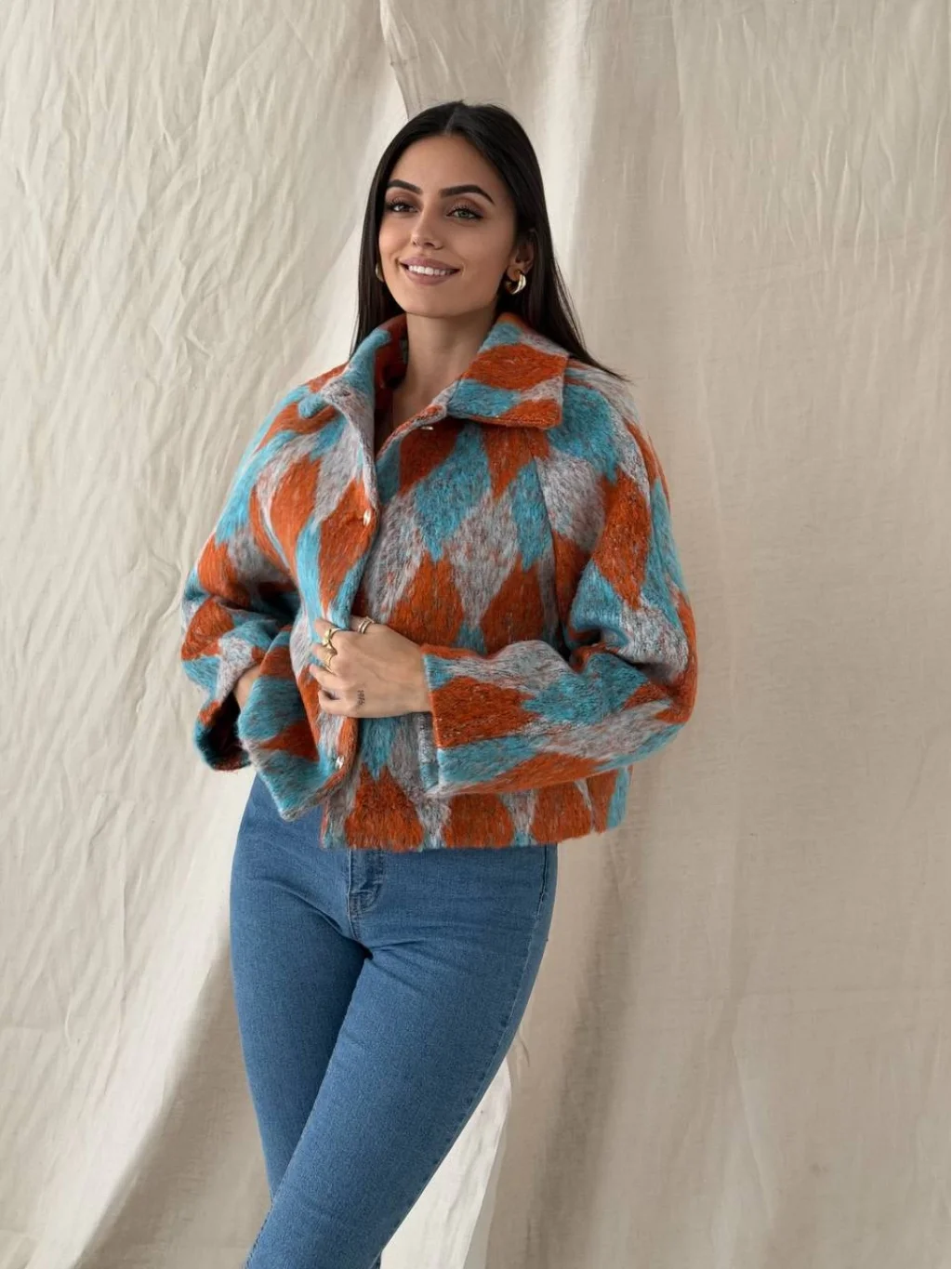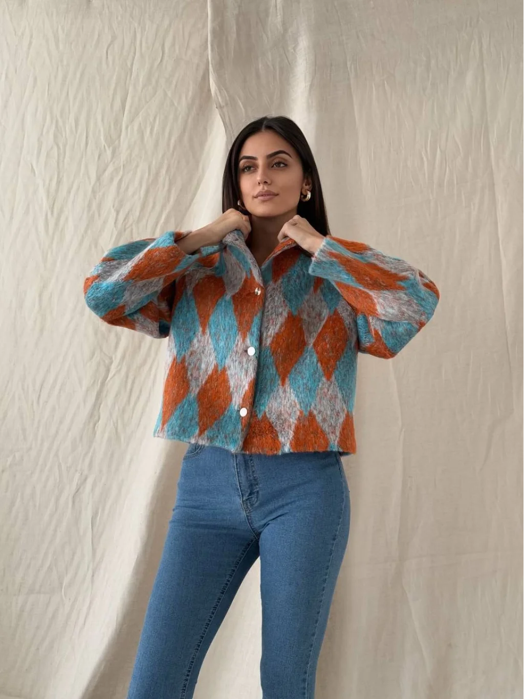 Baklava Desen Jakar Ceket Turuncu Mavi