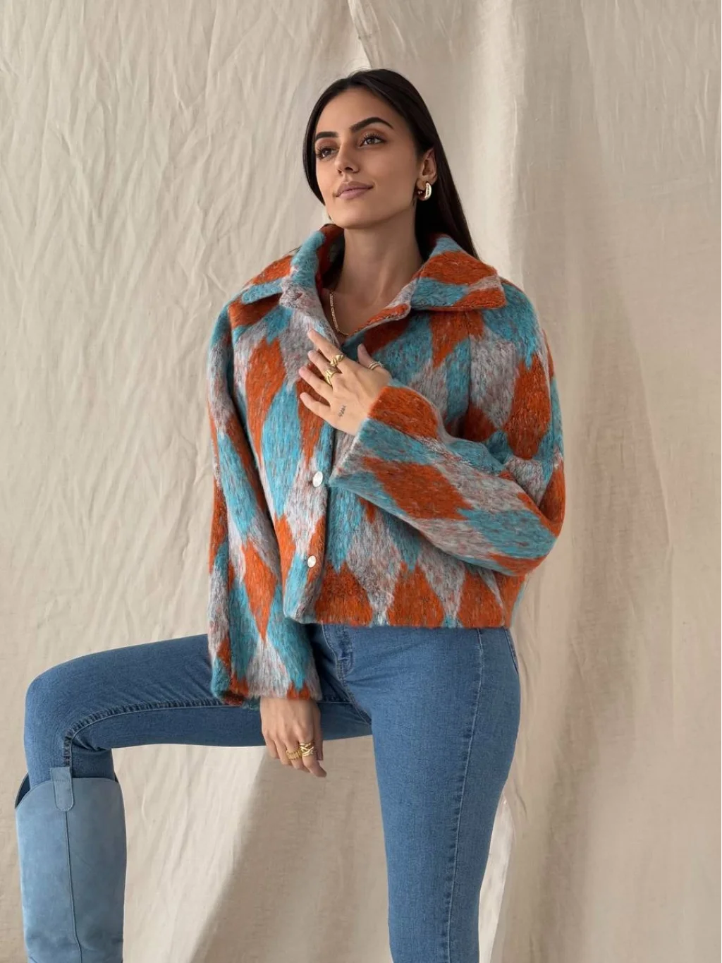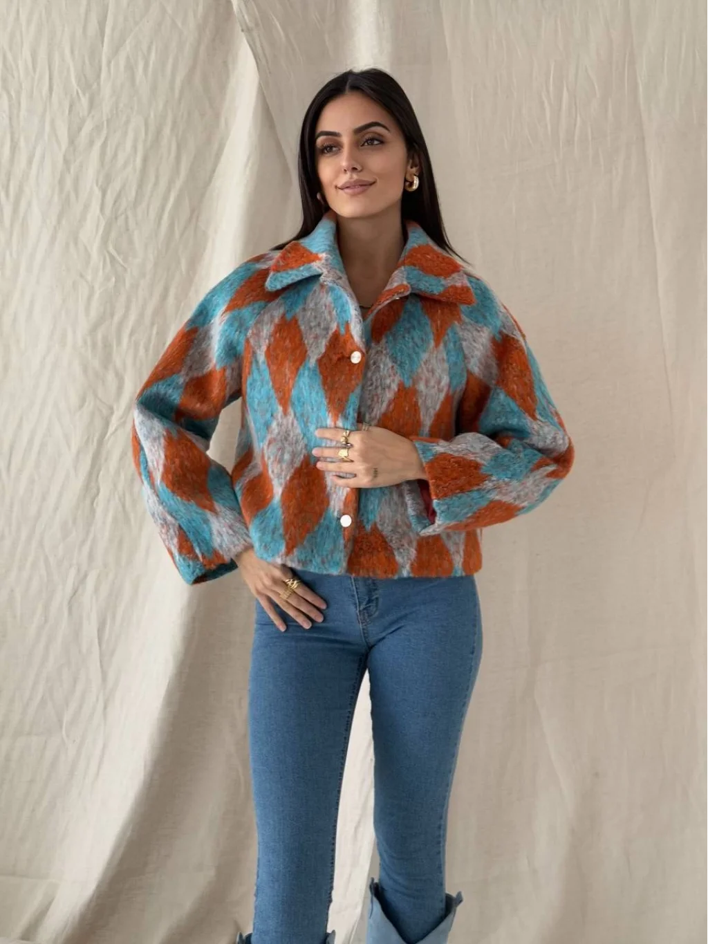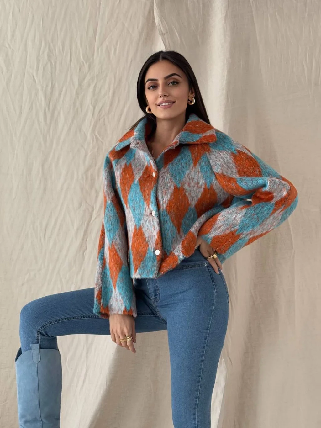 Baklava Desen Jakar Ceket Turuncu Mavi