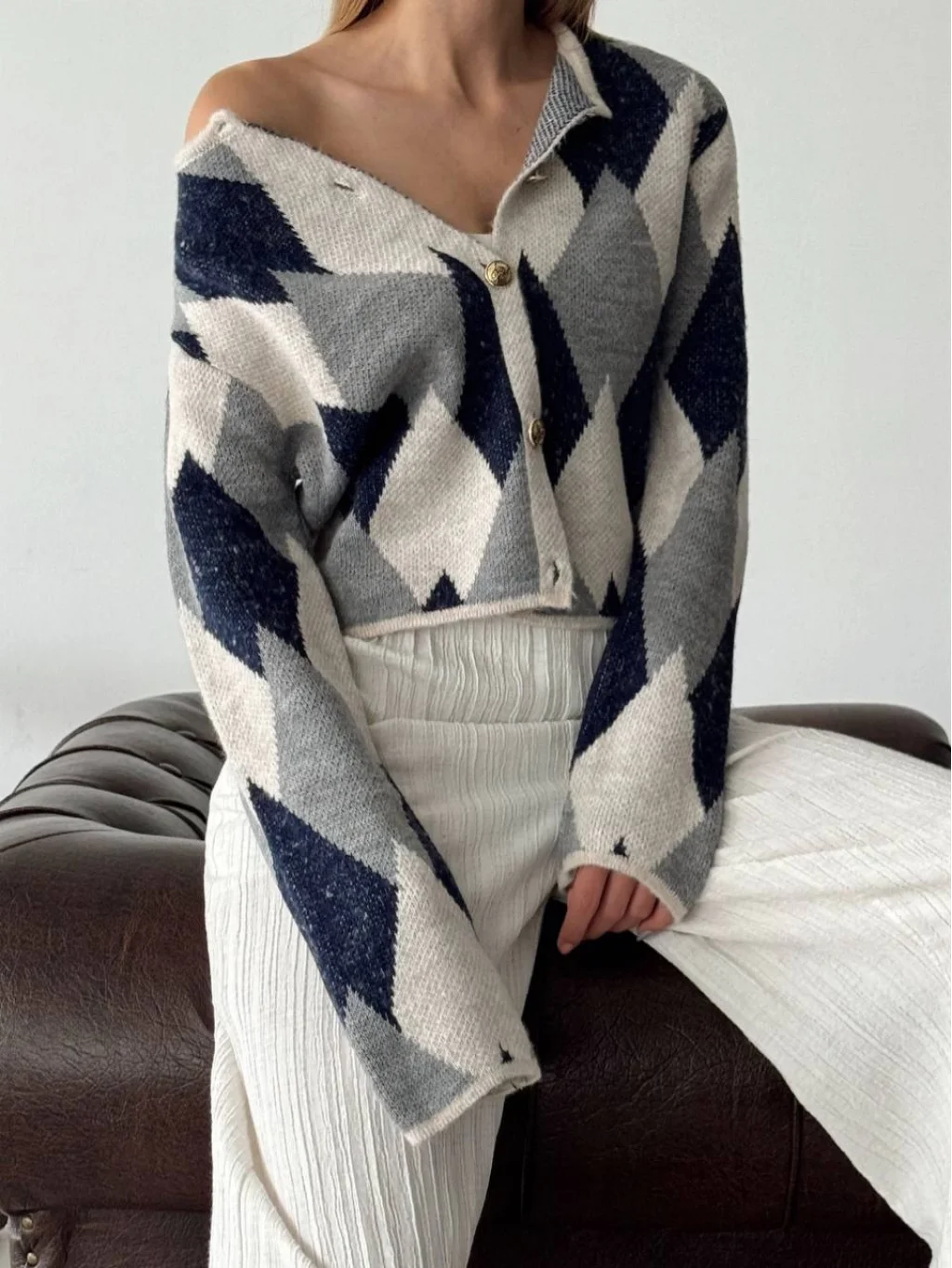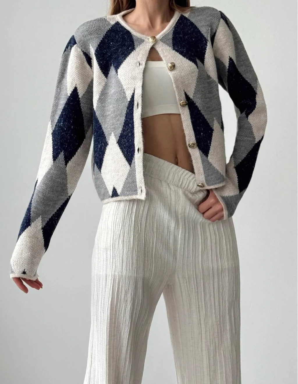 Baklava Desen Kısa Hırka Taş / Lacivert
