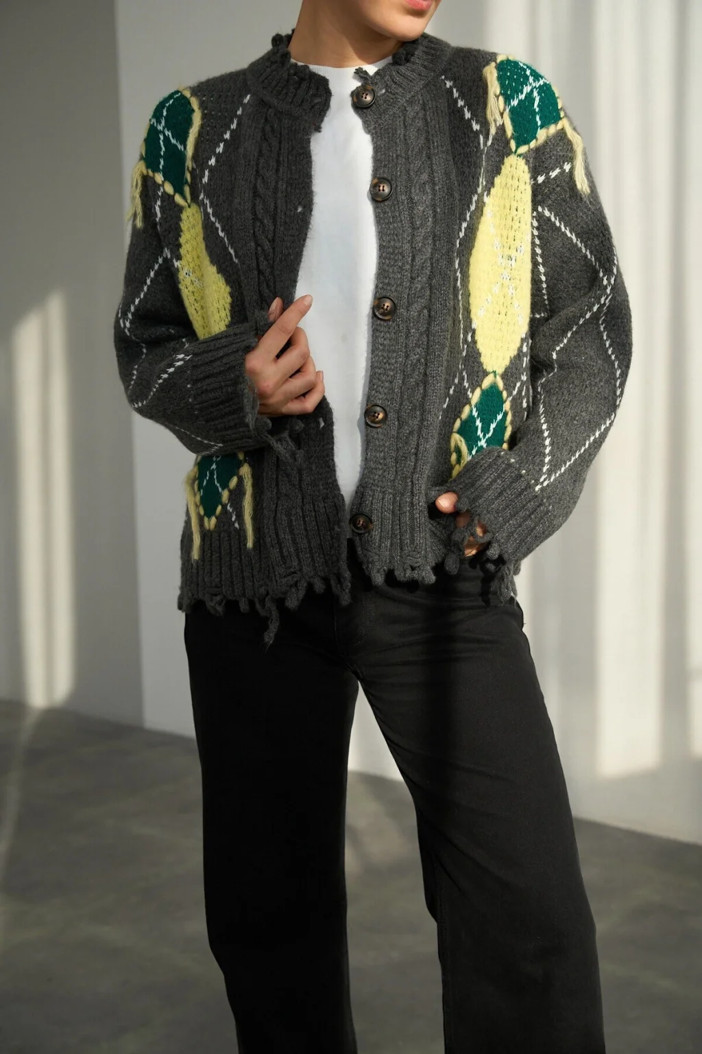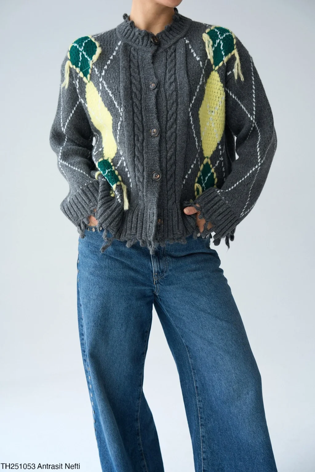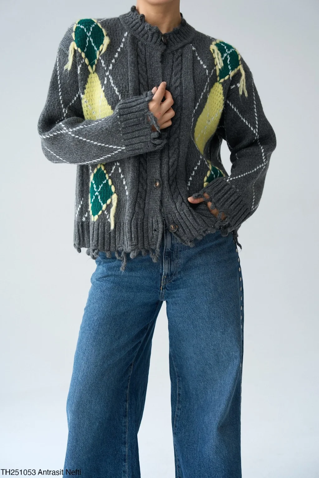 Günlük kombinlere karakter katan bu baklava desenli triko hırka,