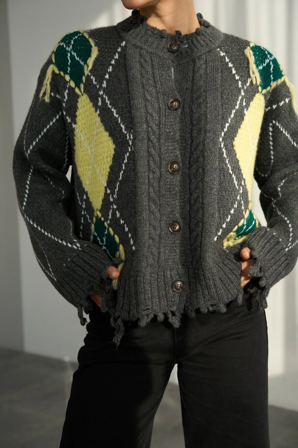 MYRA Baklava Desen Saçaklı Hırka-Gri, kombininize hareket katacak şık ve şık bir seçenektir.