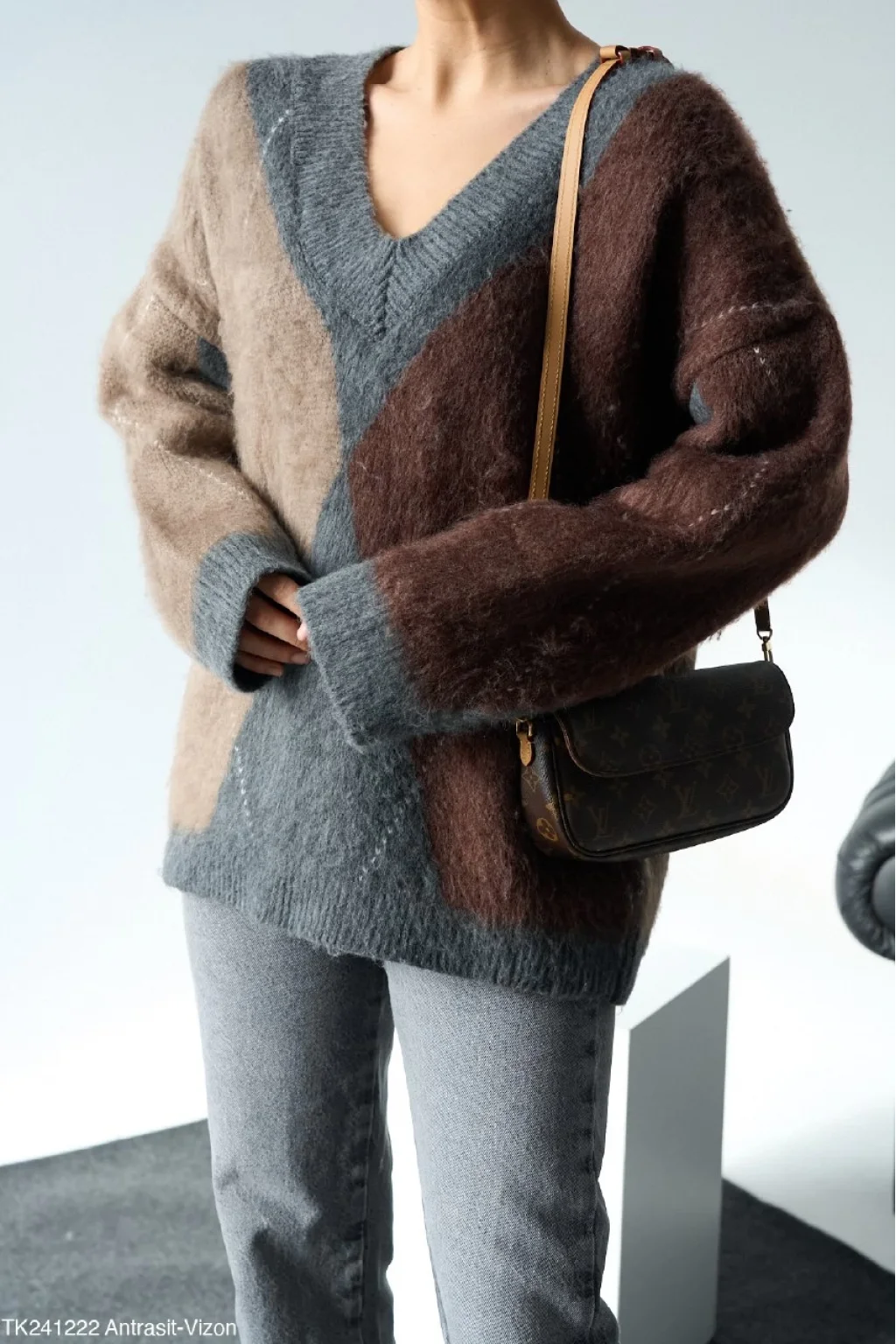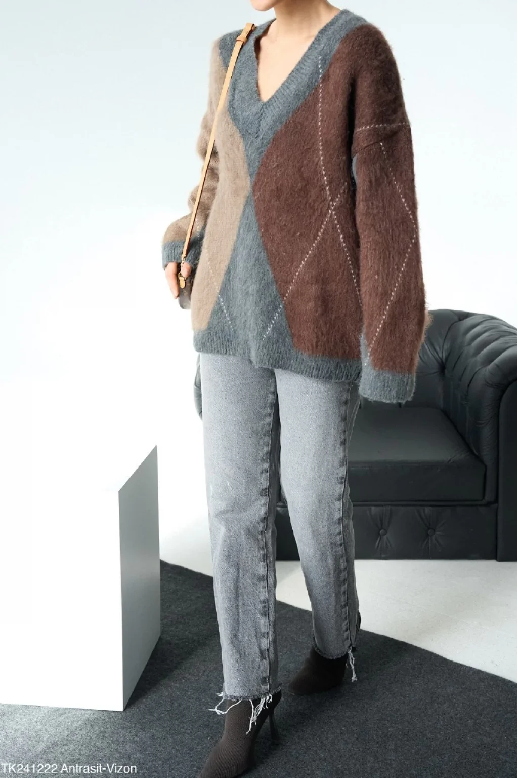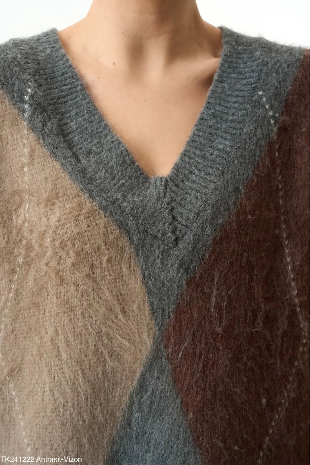 Baklava Desen V Yaka Kazak - antrasit/vizon