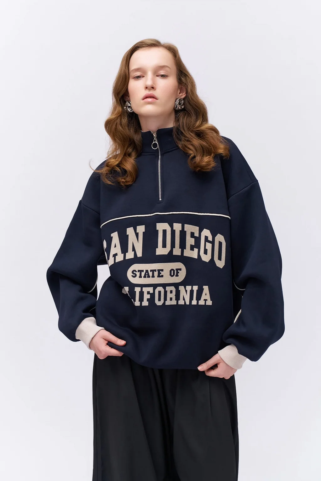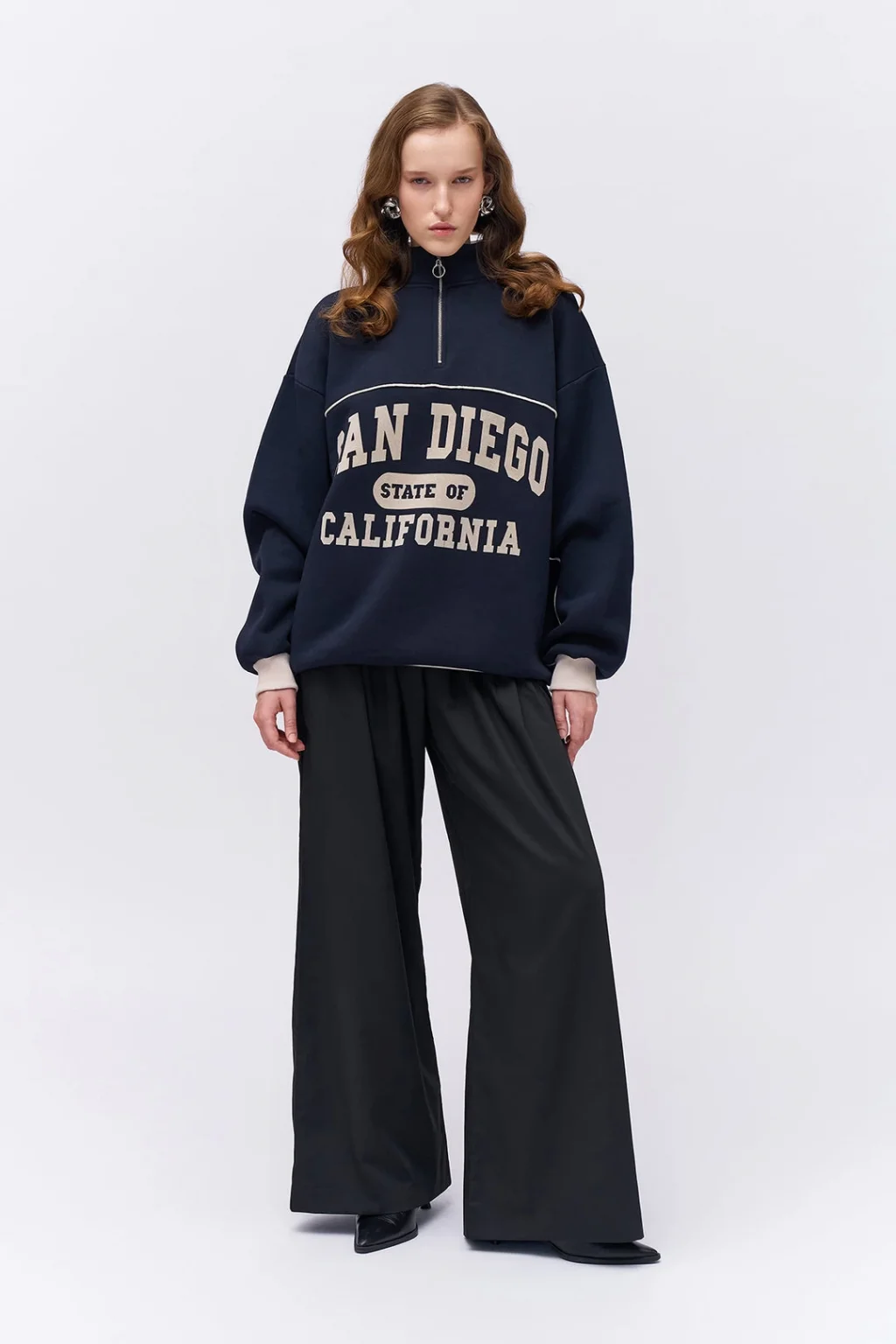 Balıkçı yaka, fermuar detaylı, önünde yazı baskılı, uzun kollu sweatshİrt.