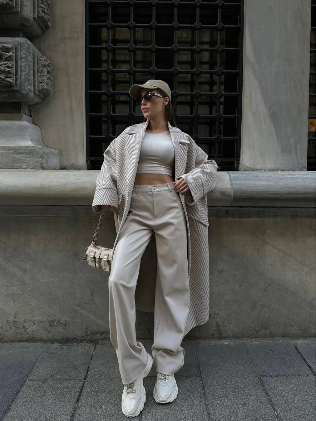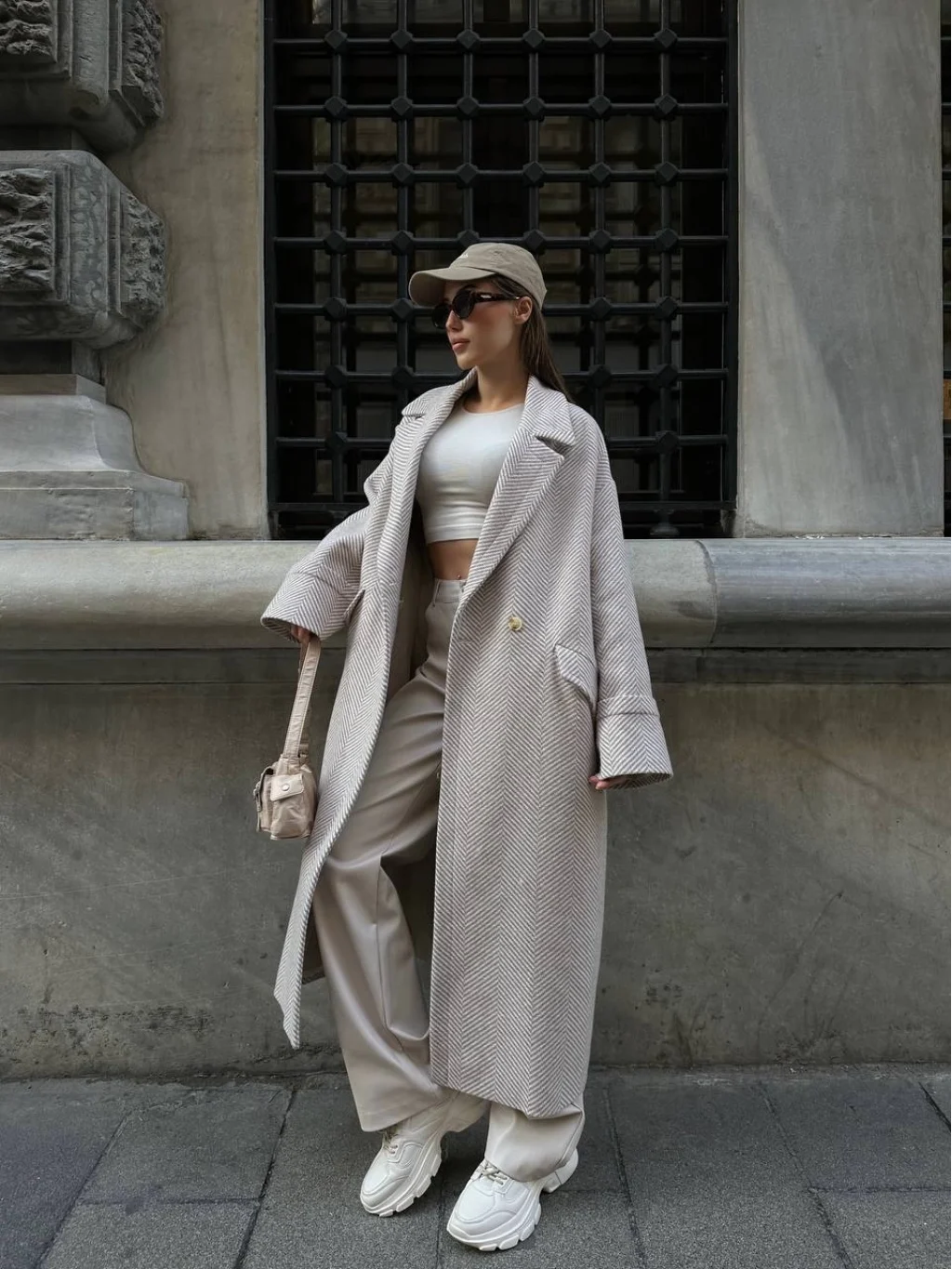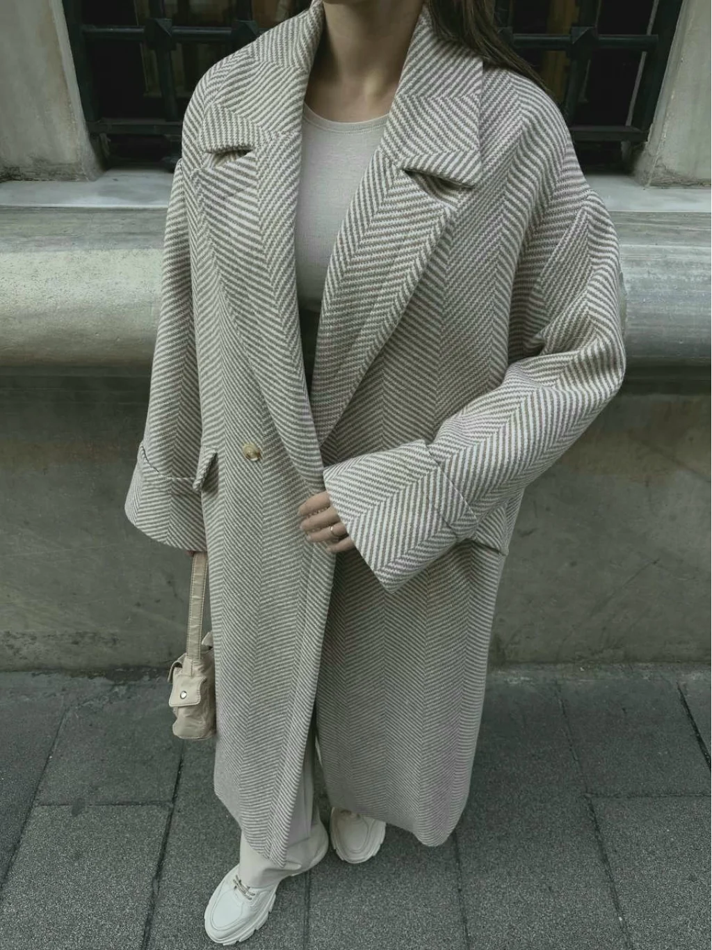 Balıksırtı Oversize Yün Kaban Krem