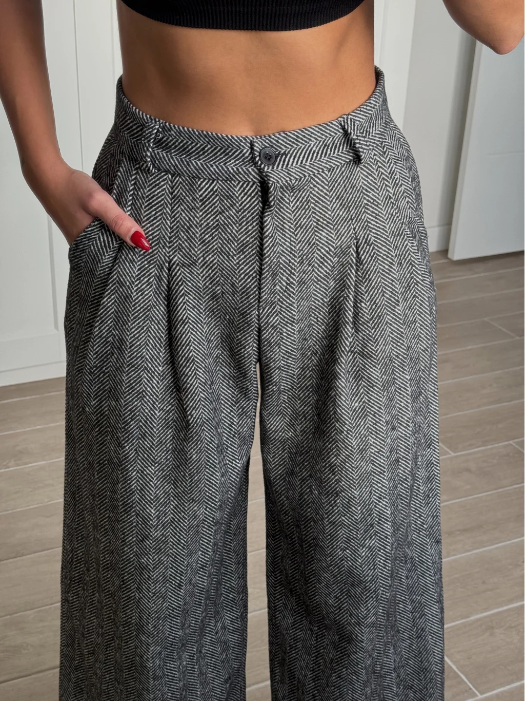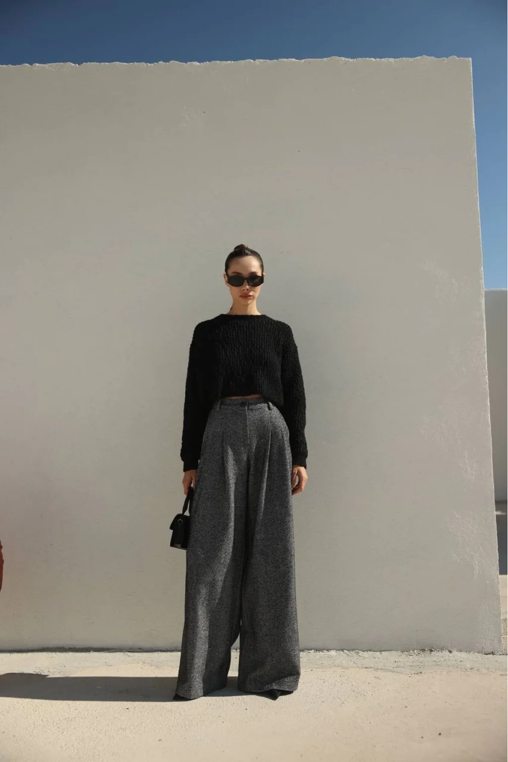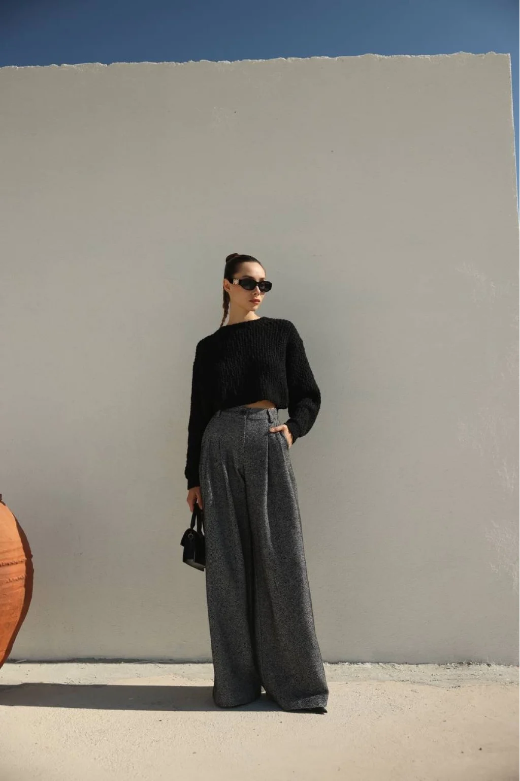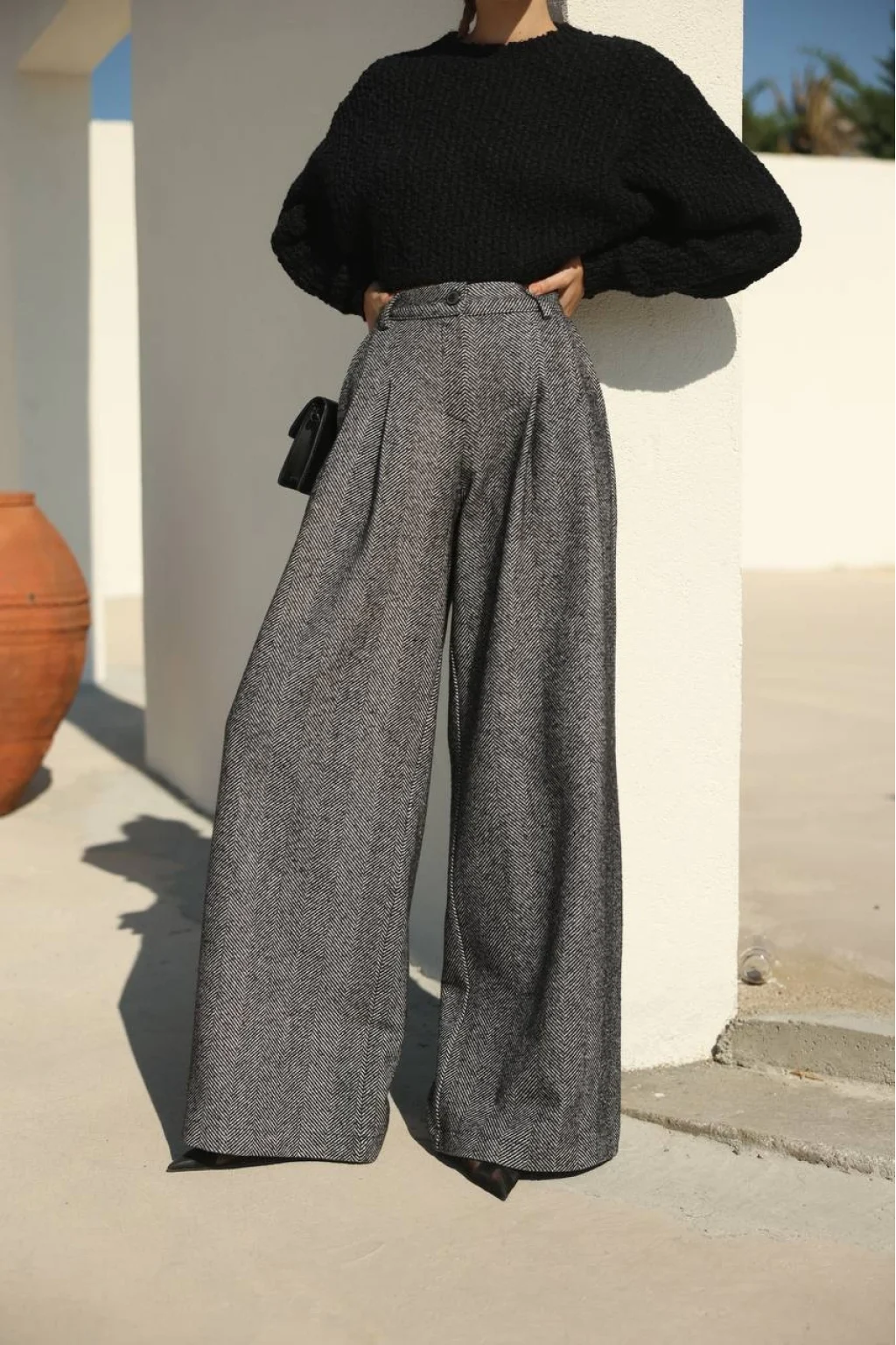 MYRA balıksırtı desenli siyah bol paça kalın pantolon, pamuklu kumaşı ve yüksek bel tasarımıyla şıklığı ve konforu bir arada sunar.