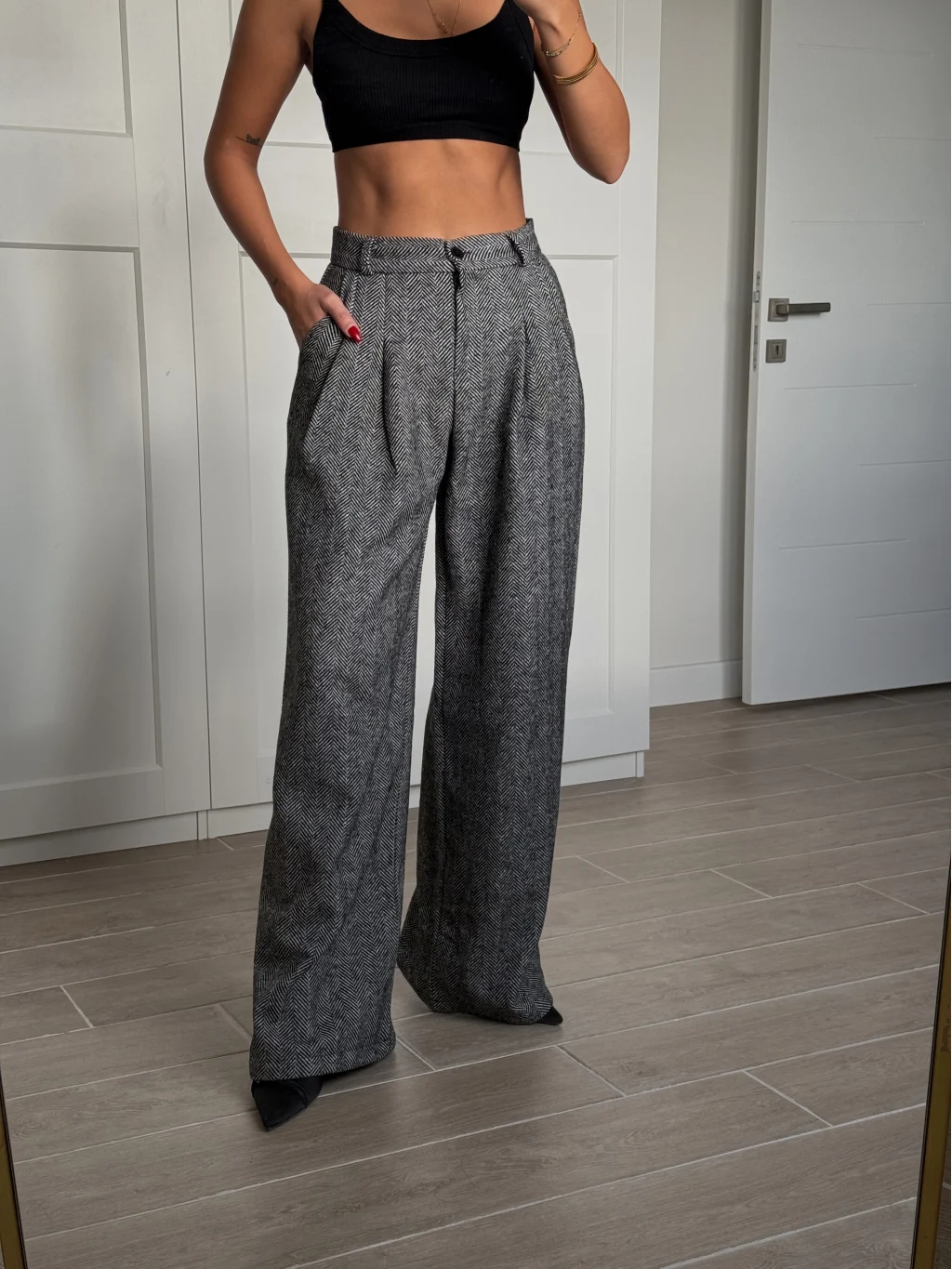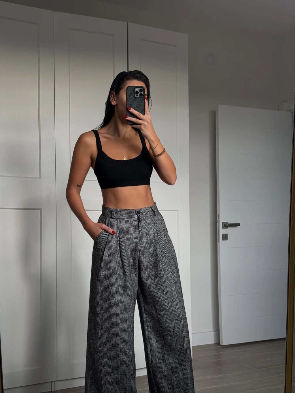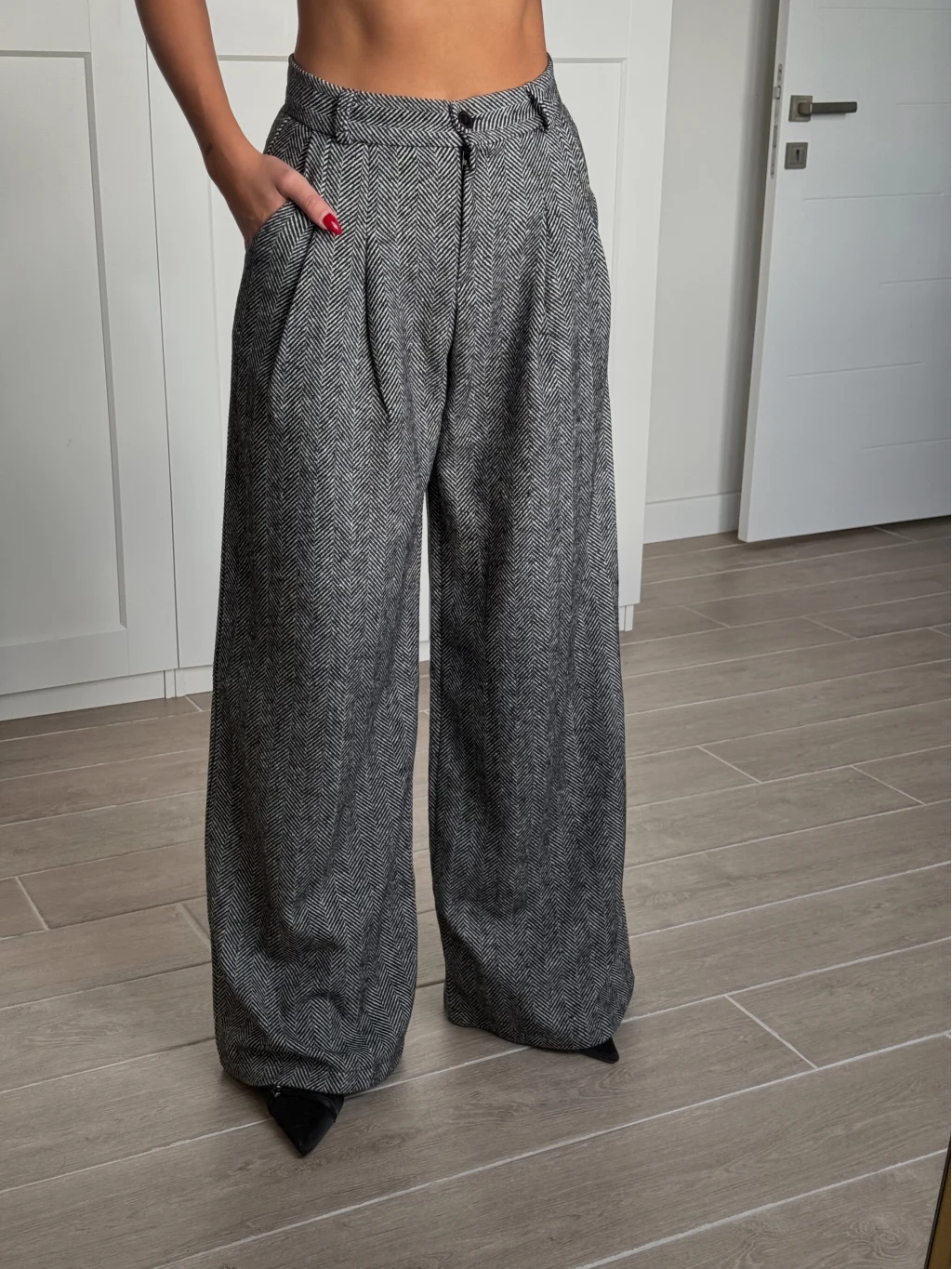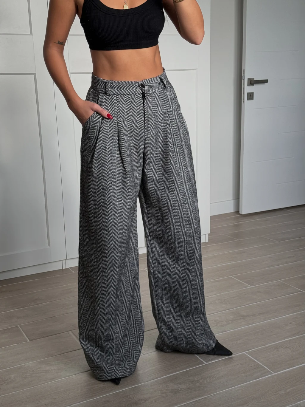 MYRA balıksırtı desenli siyah bol paça kalın pantolon, pamuklu kumaşı ve yüksek bel tasarımıyla şıklığı ve konforu bir arada sunar.