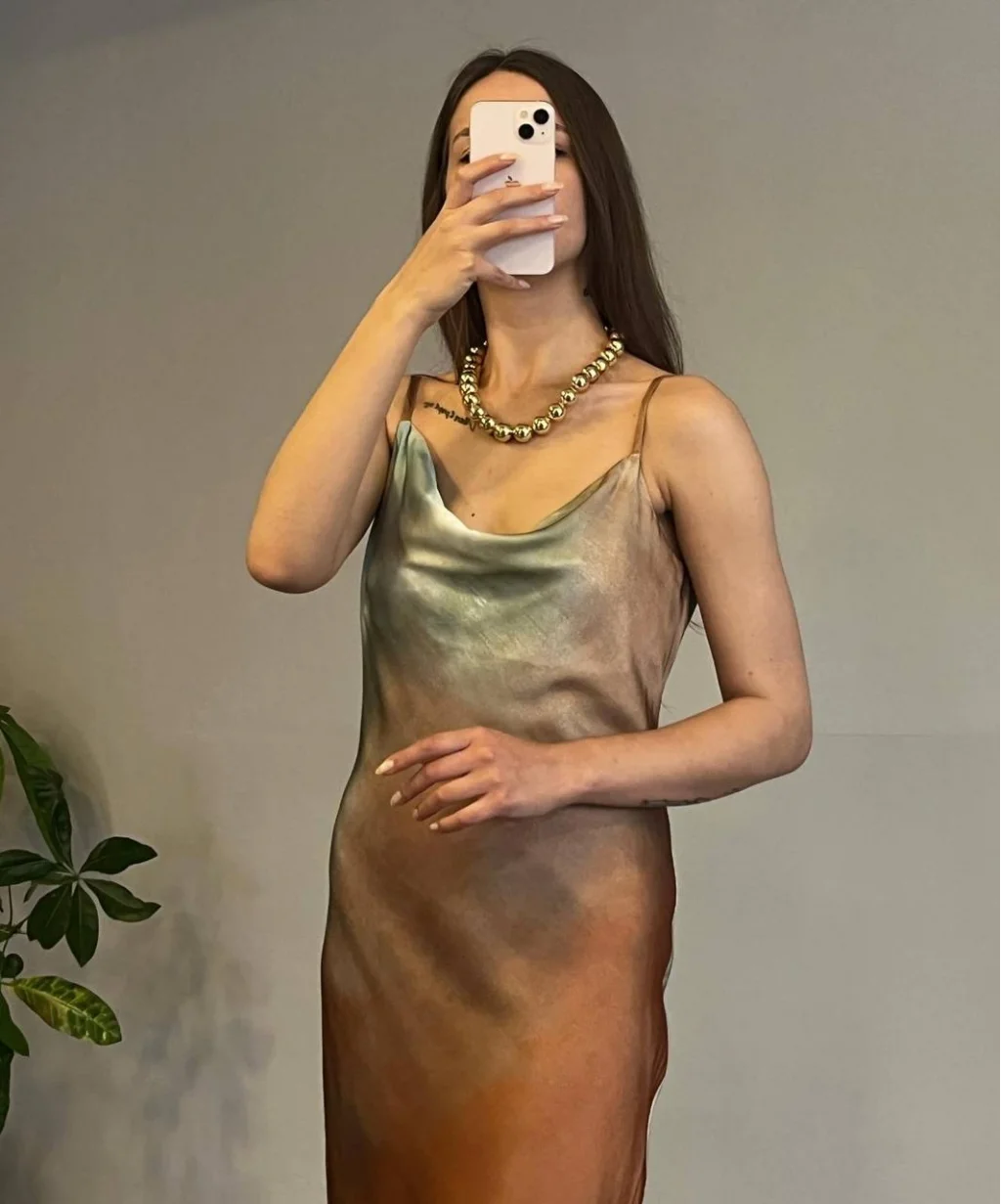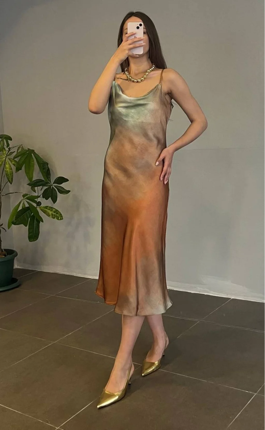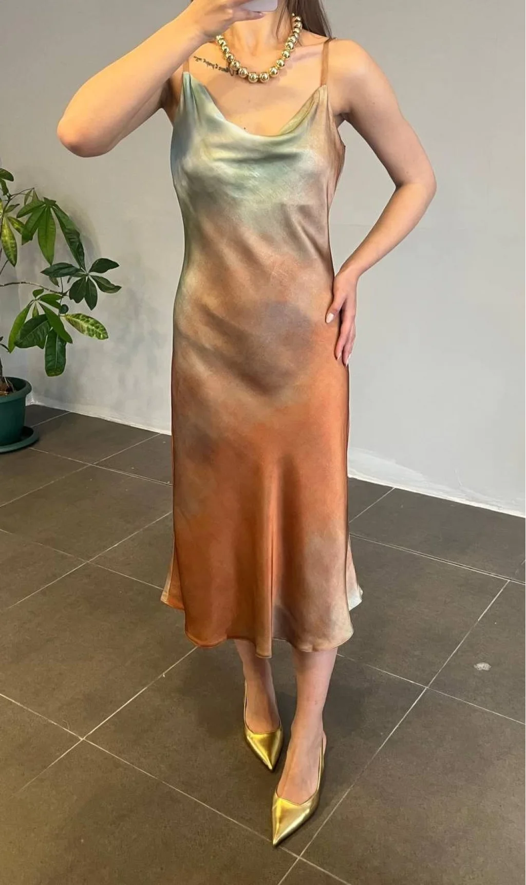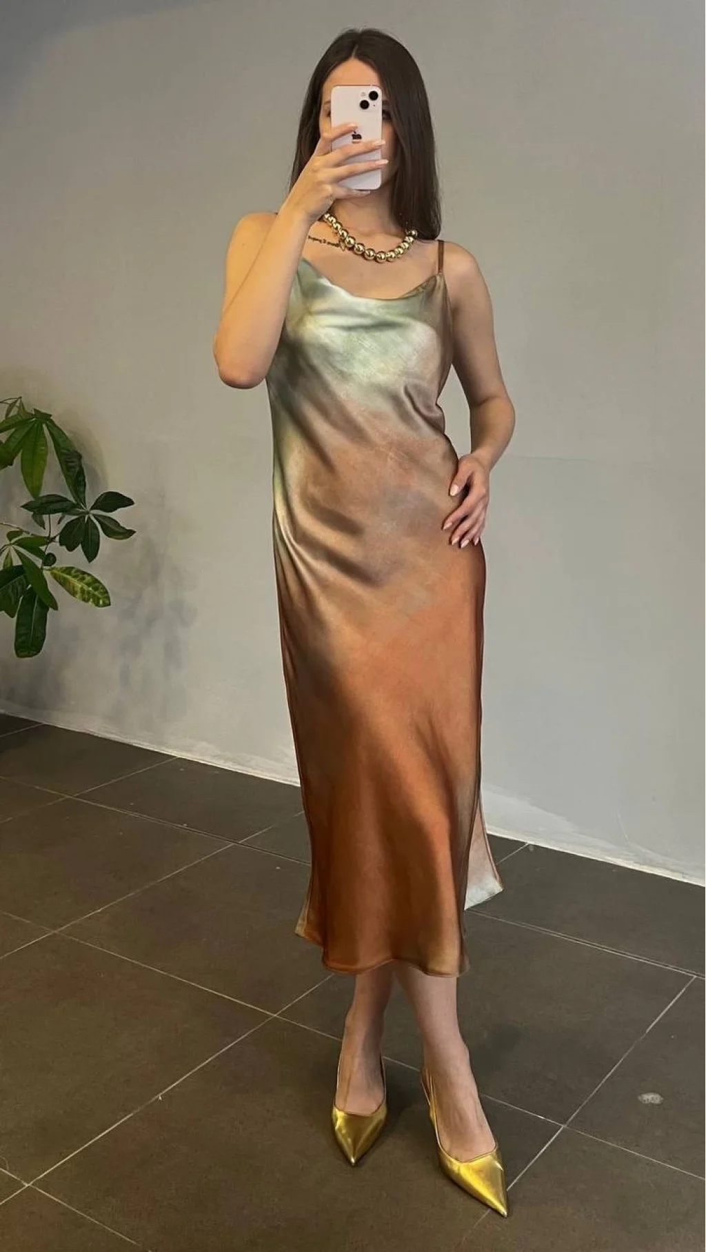İNCE AYARLANABİLİR ASKILI, DEGAJE YAKA, UZUN ELBİSE