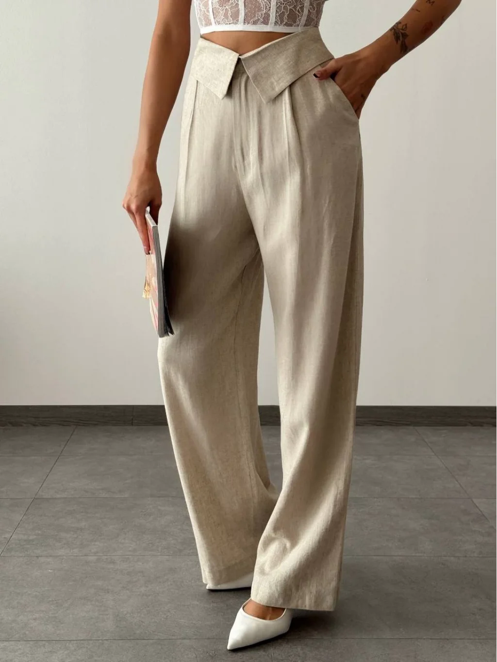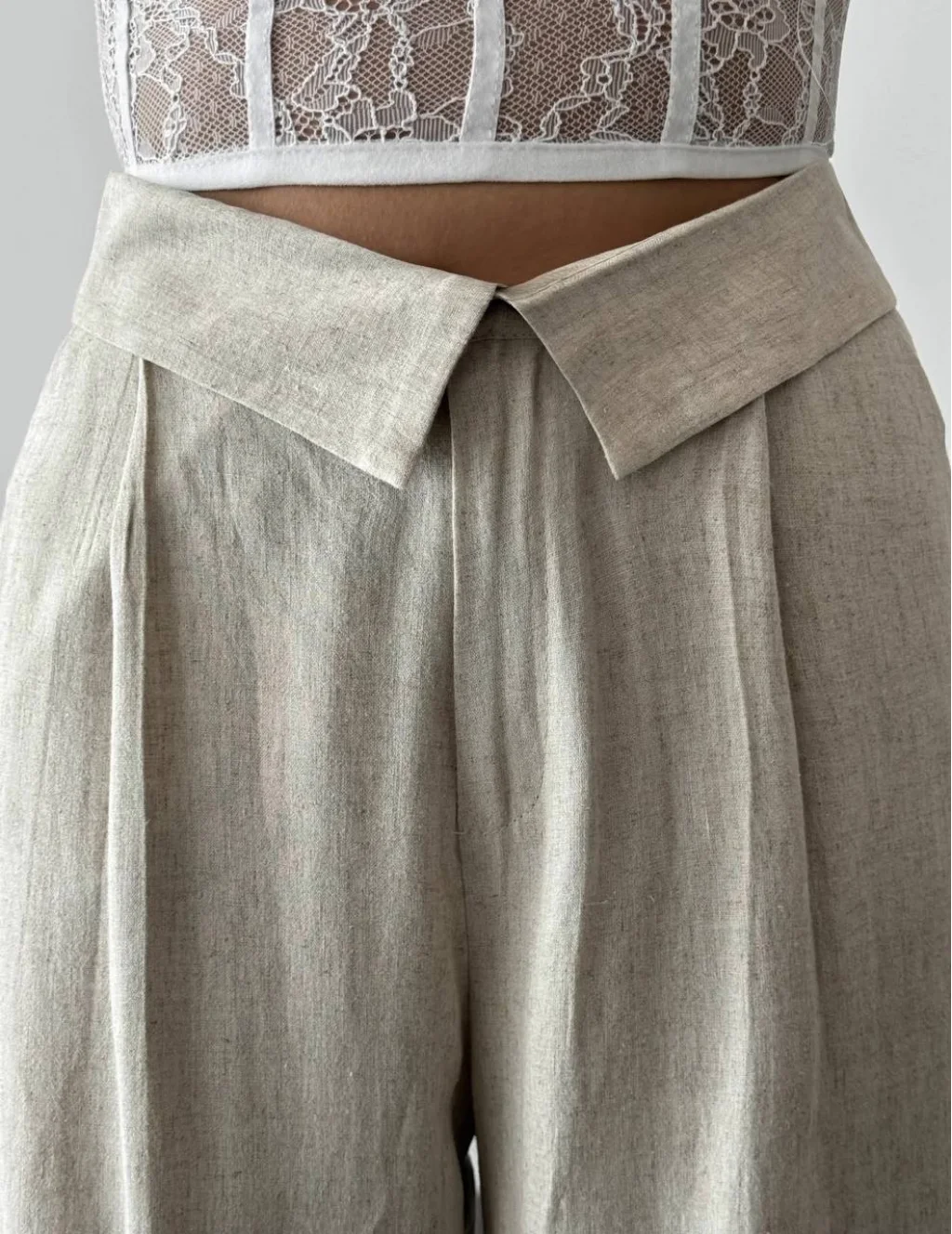 Keten karışımlı, gizli kapama düğmeli, bol paça, yüksek bel, bel detaylı,çift cepli, pantolon.