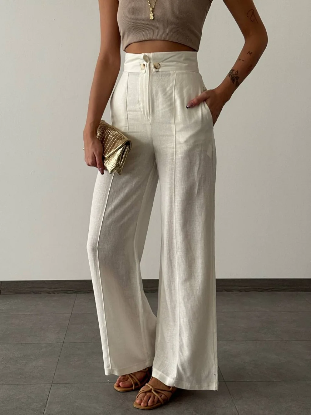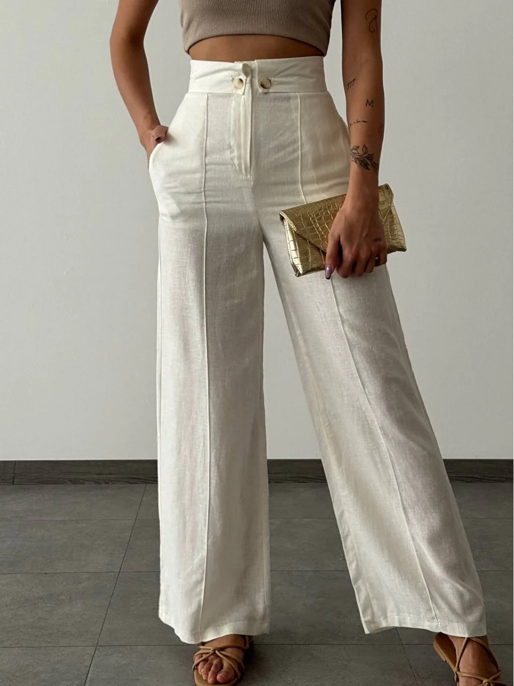 BEL DÜĞMELİ KETEN PANTOLON EKRU