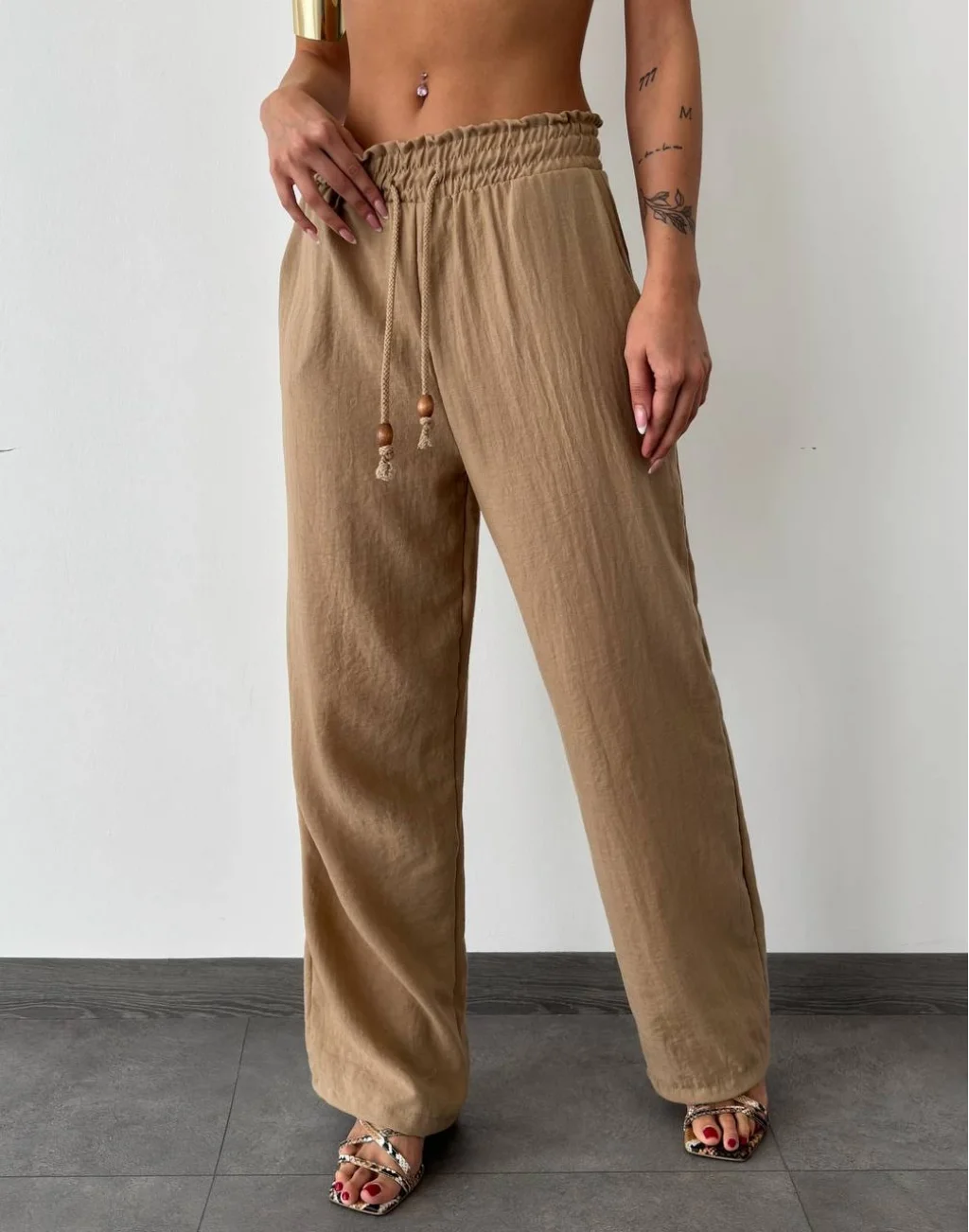 BELİ LASTİKLİ VE İP BAĞLAMALI KETEN PANTOLON KAHVE