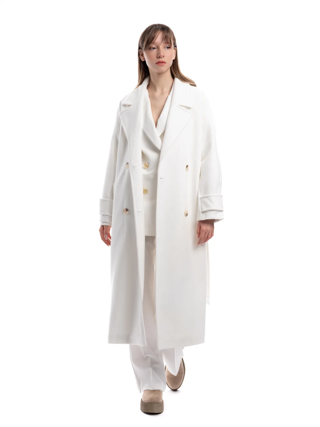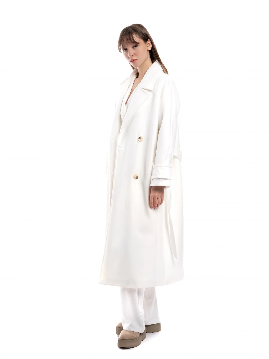 Beyaz Düğmeli Oversize Kaban