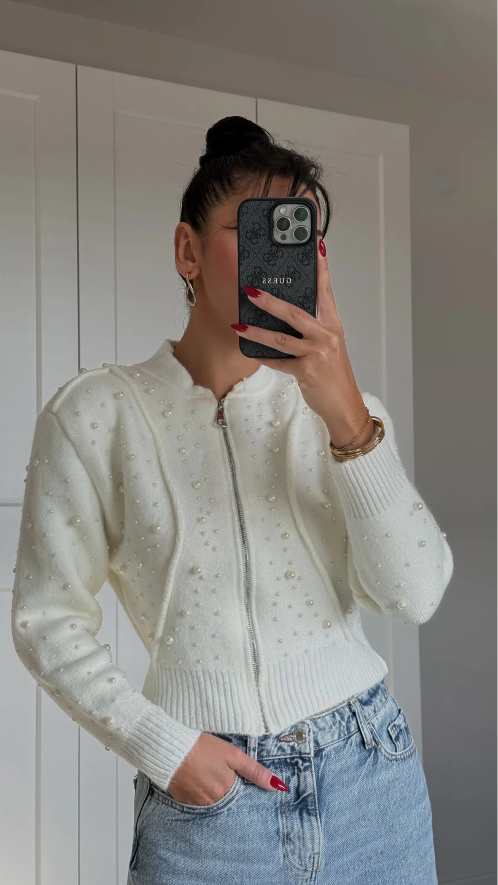 Beyaz Ters Dikiş İnci Detaylı Hırka