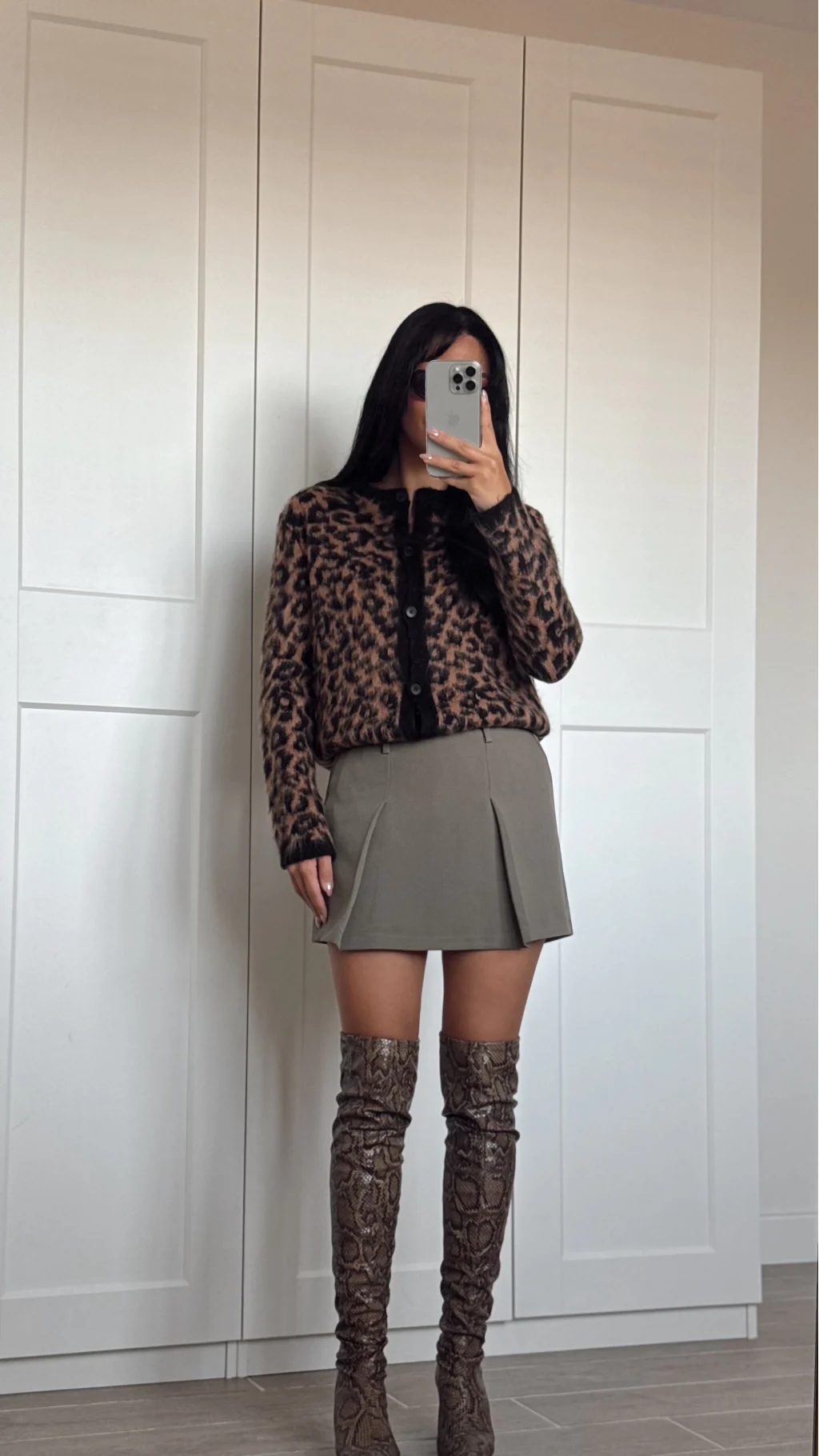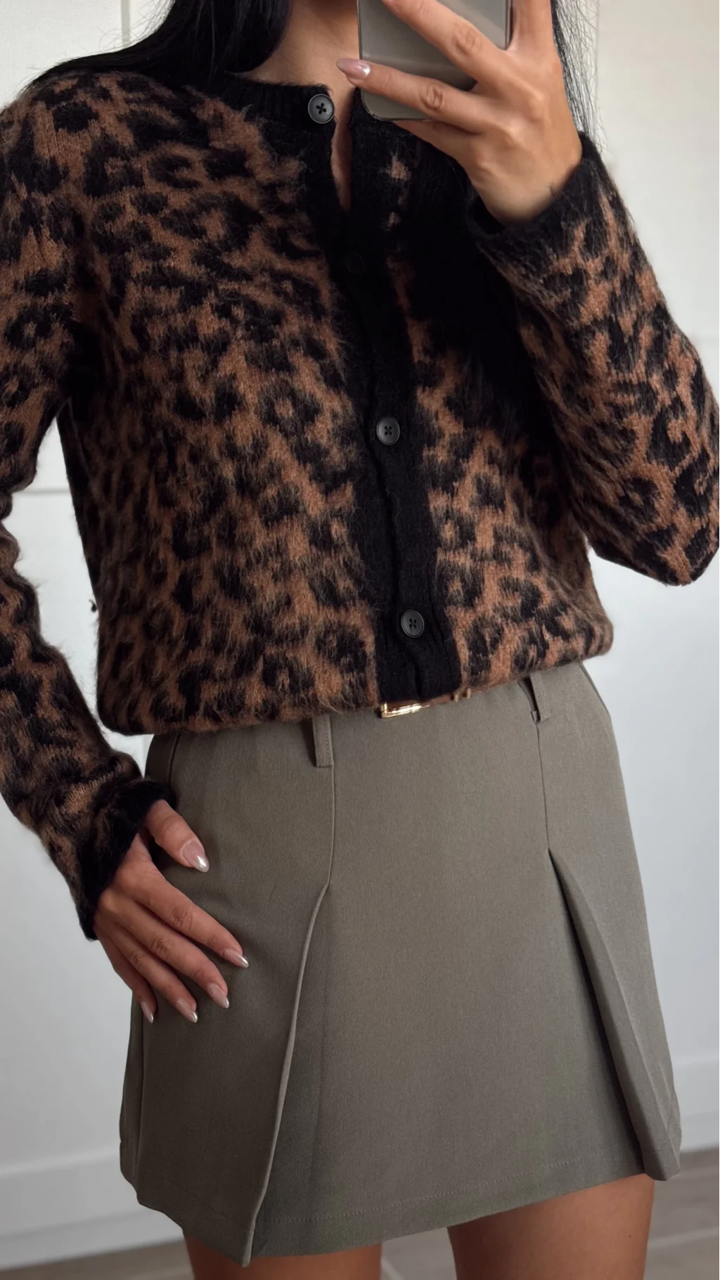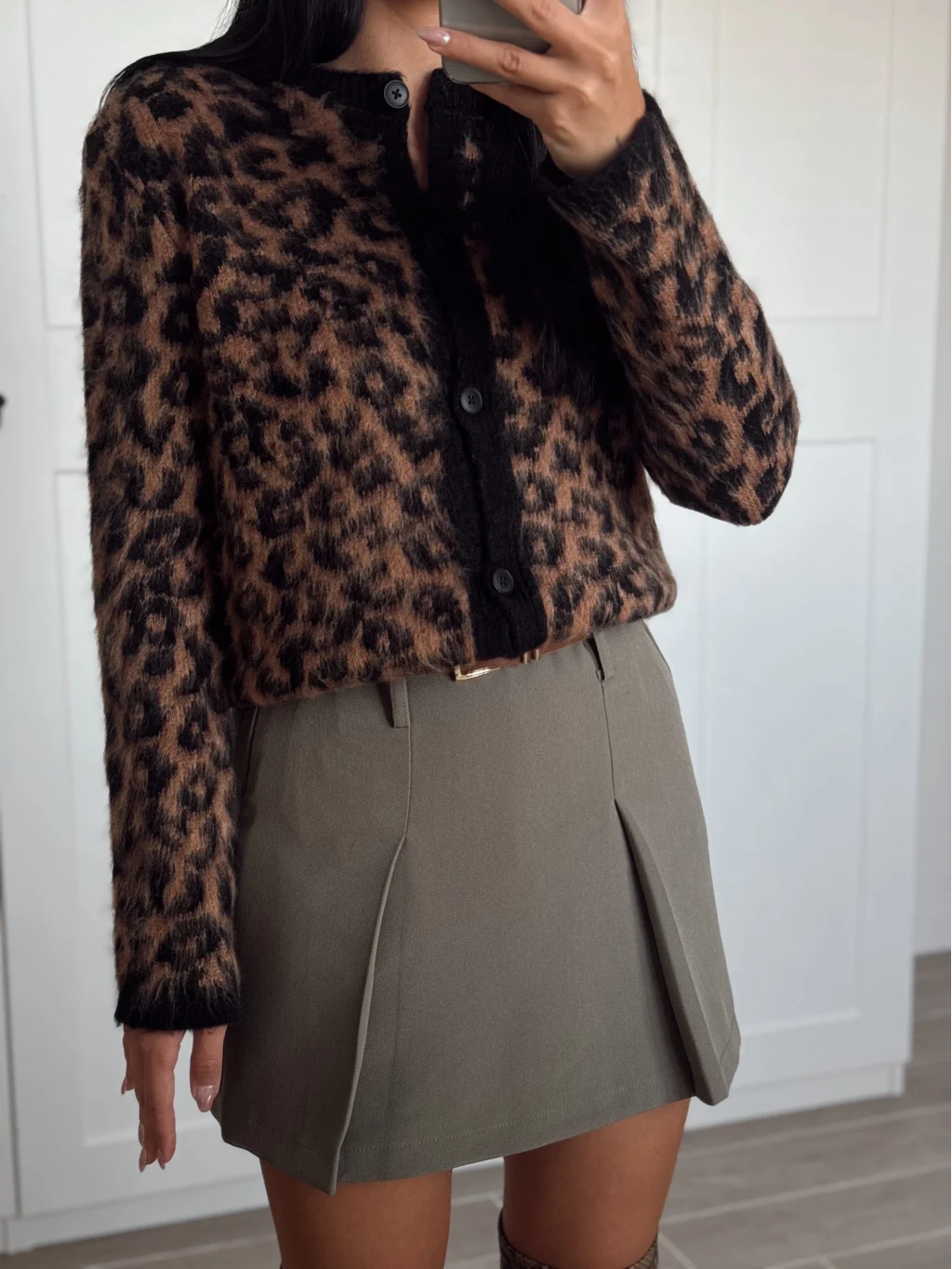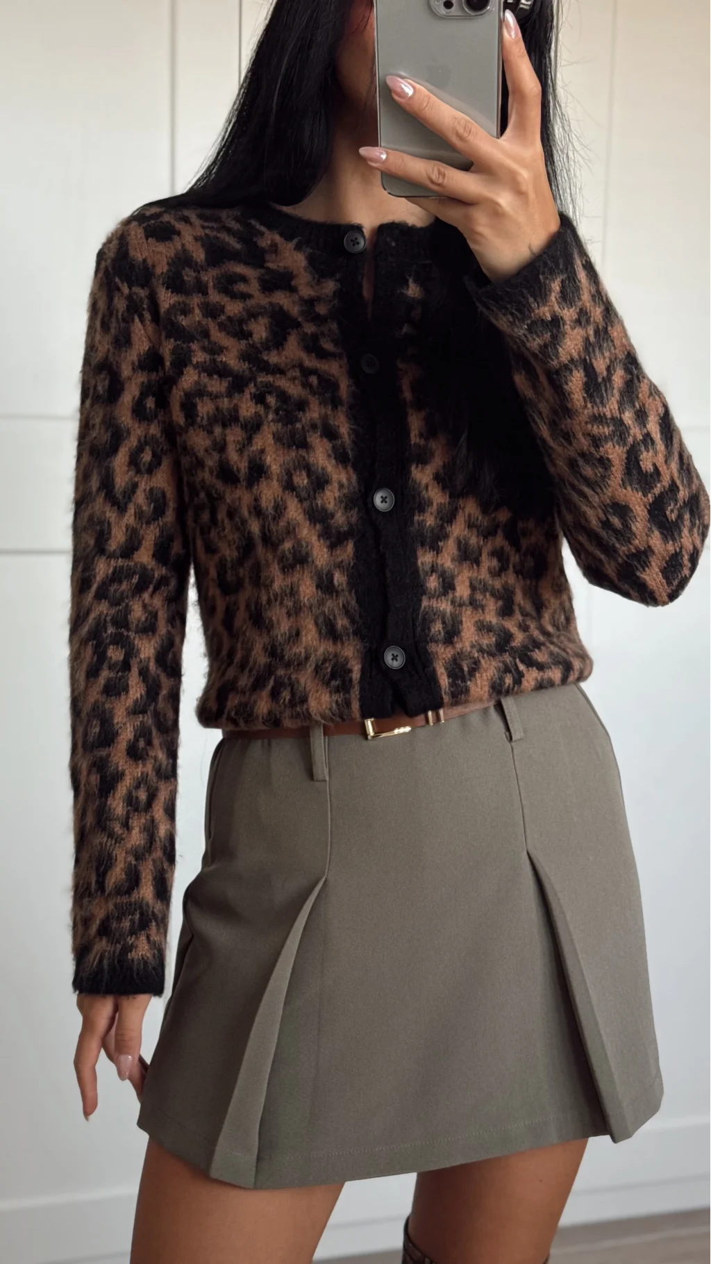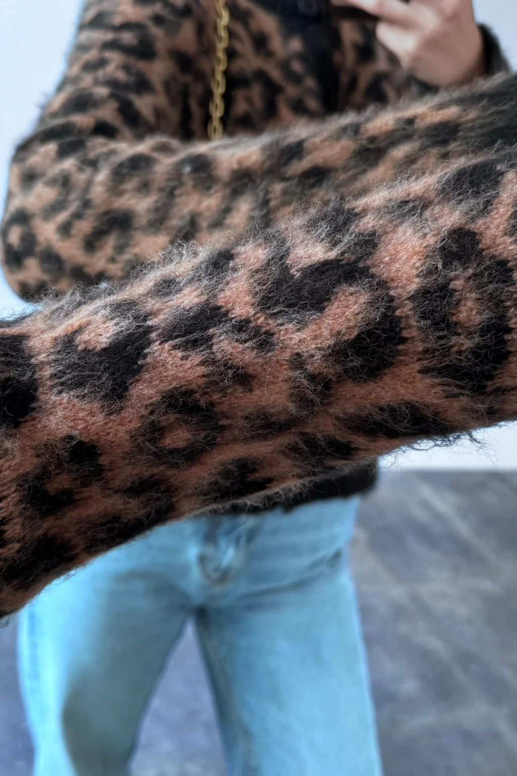 Bisiklet Yaka Kahverengi Leopar Desenli Hırka