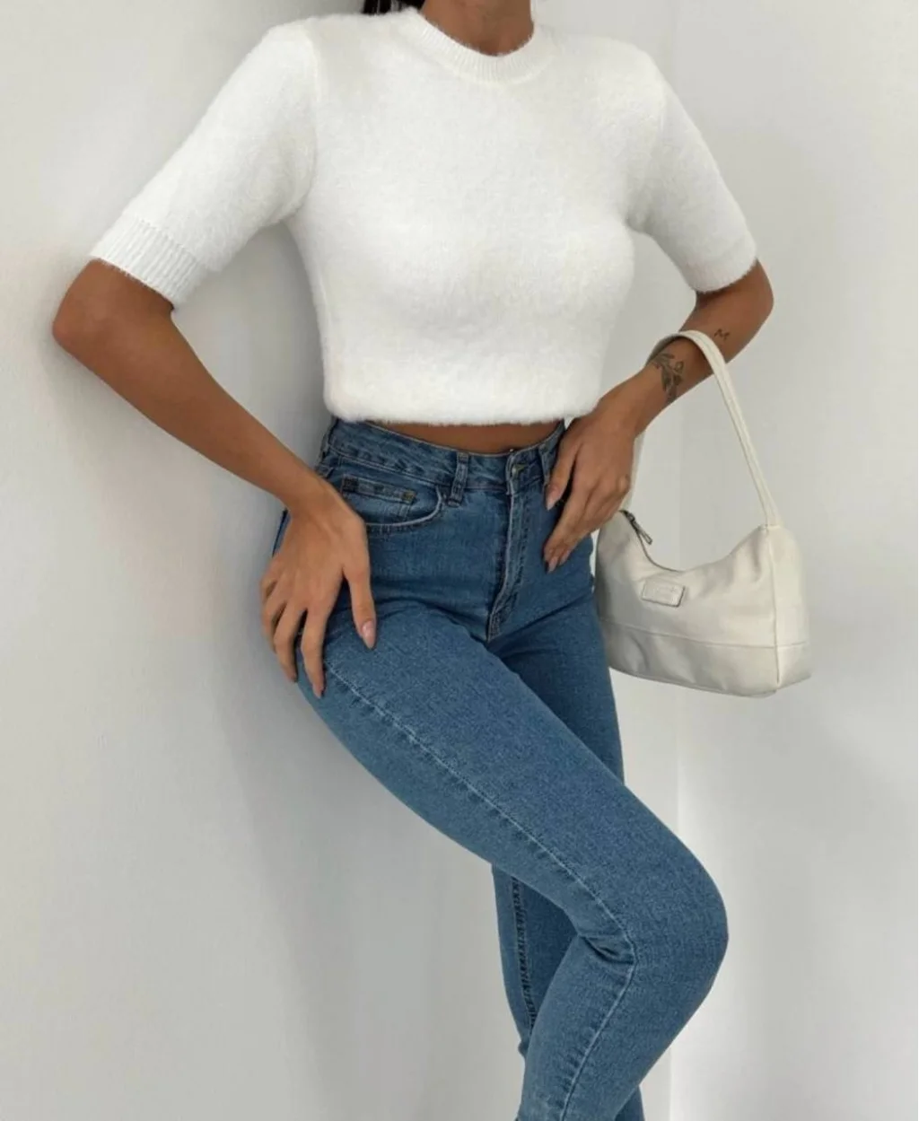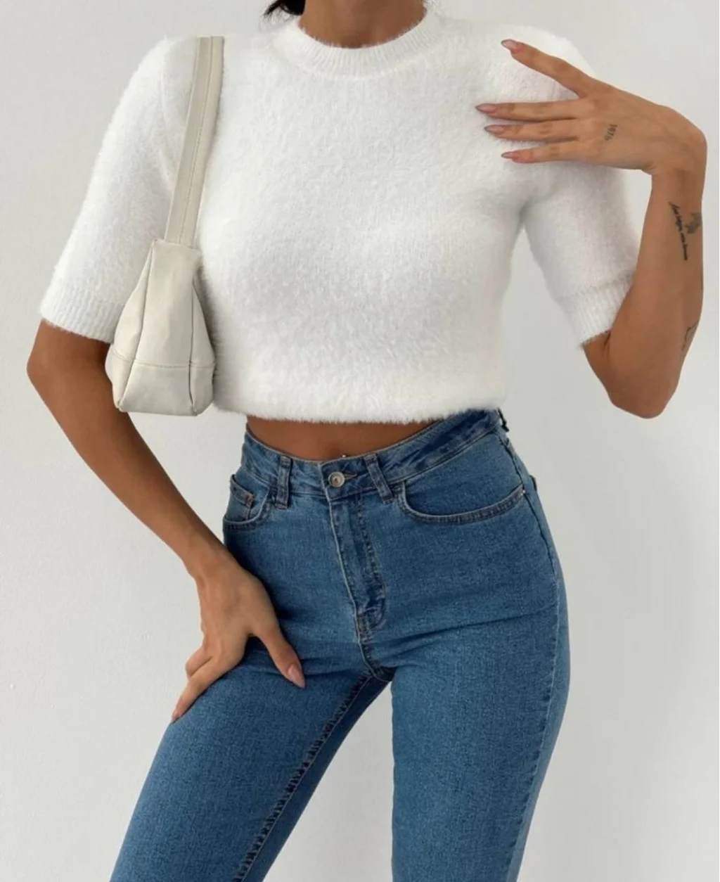 Bisiklet Yaka Kapri Kol Sakallı Beyaz Kazak
