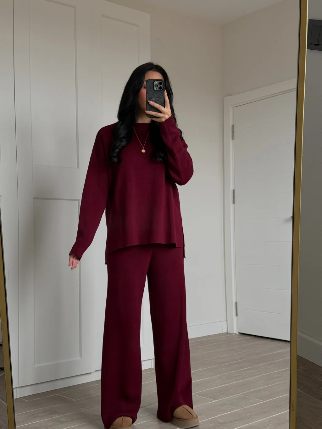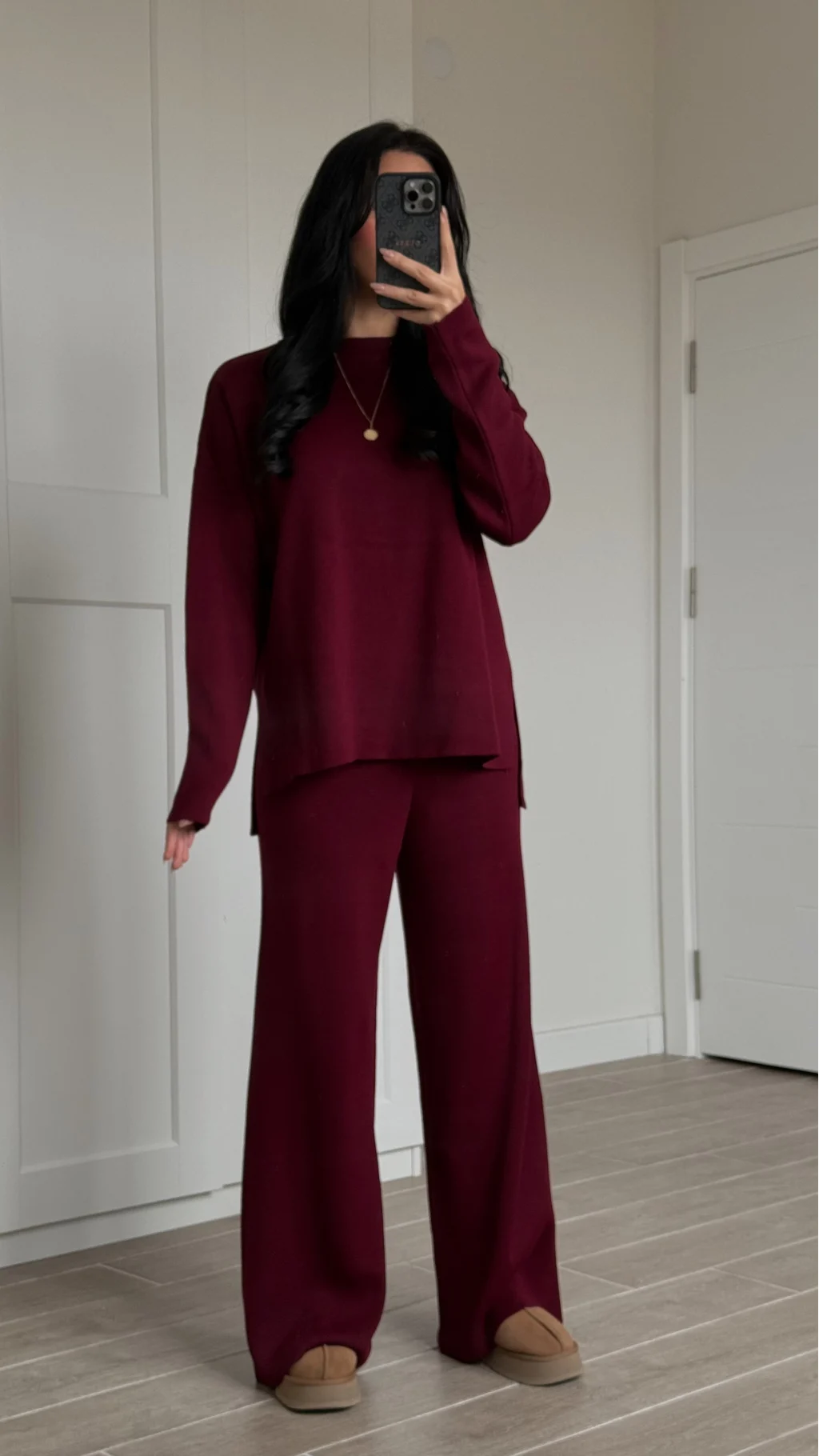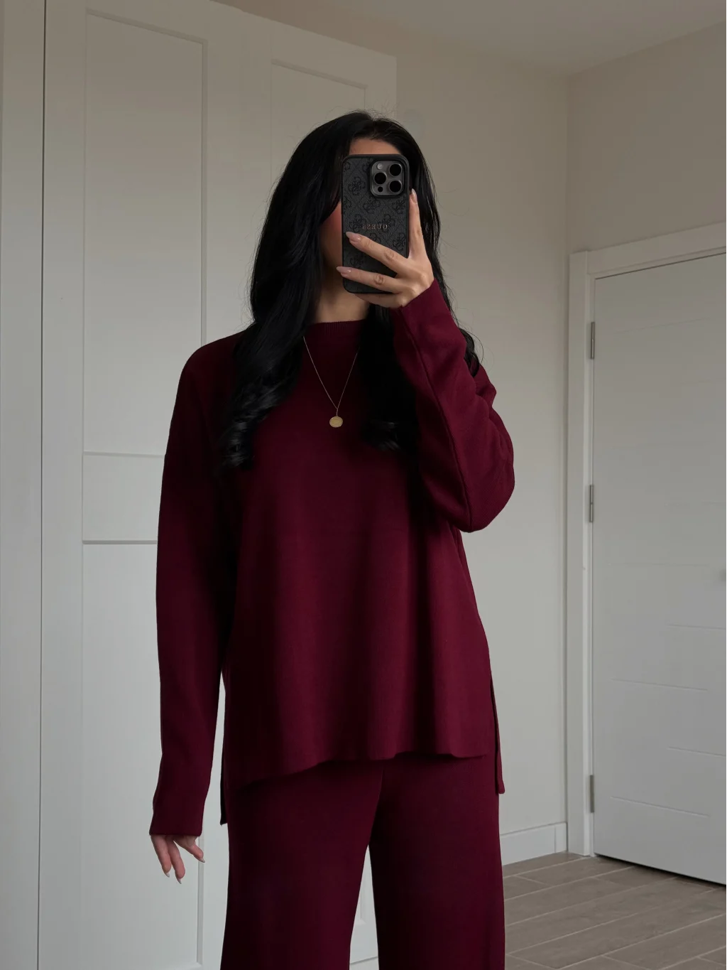 Bisiklet Yaka Yırtmaçlı Bordo Kazak Pantolon Triko Takım