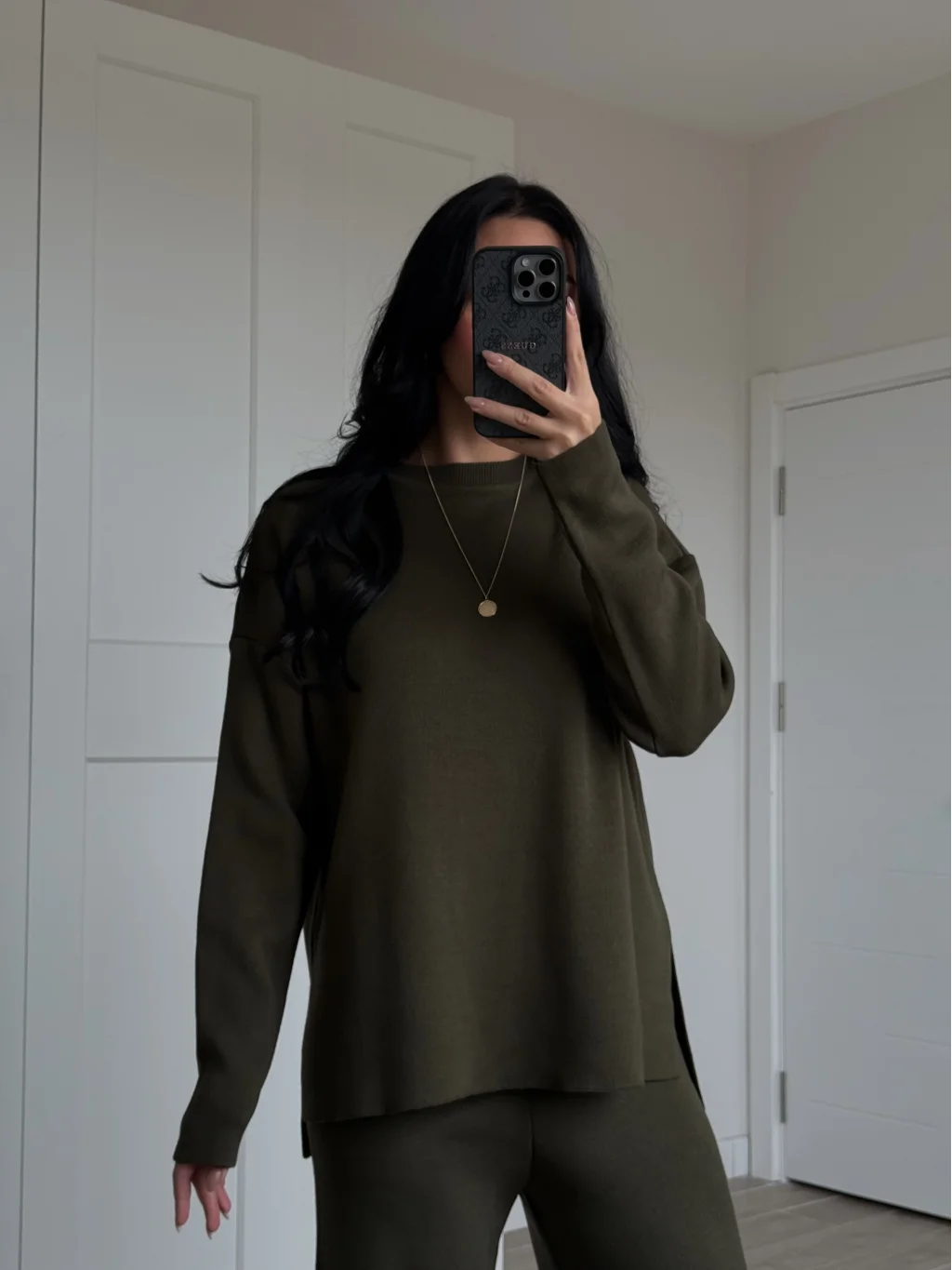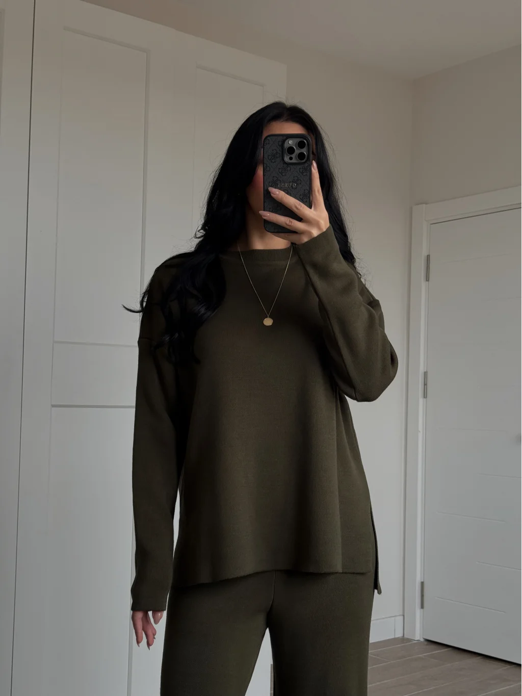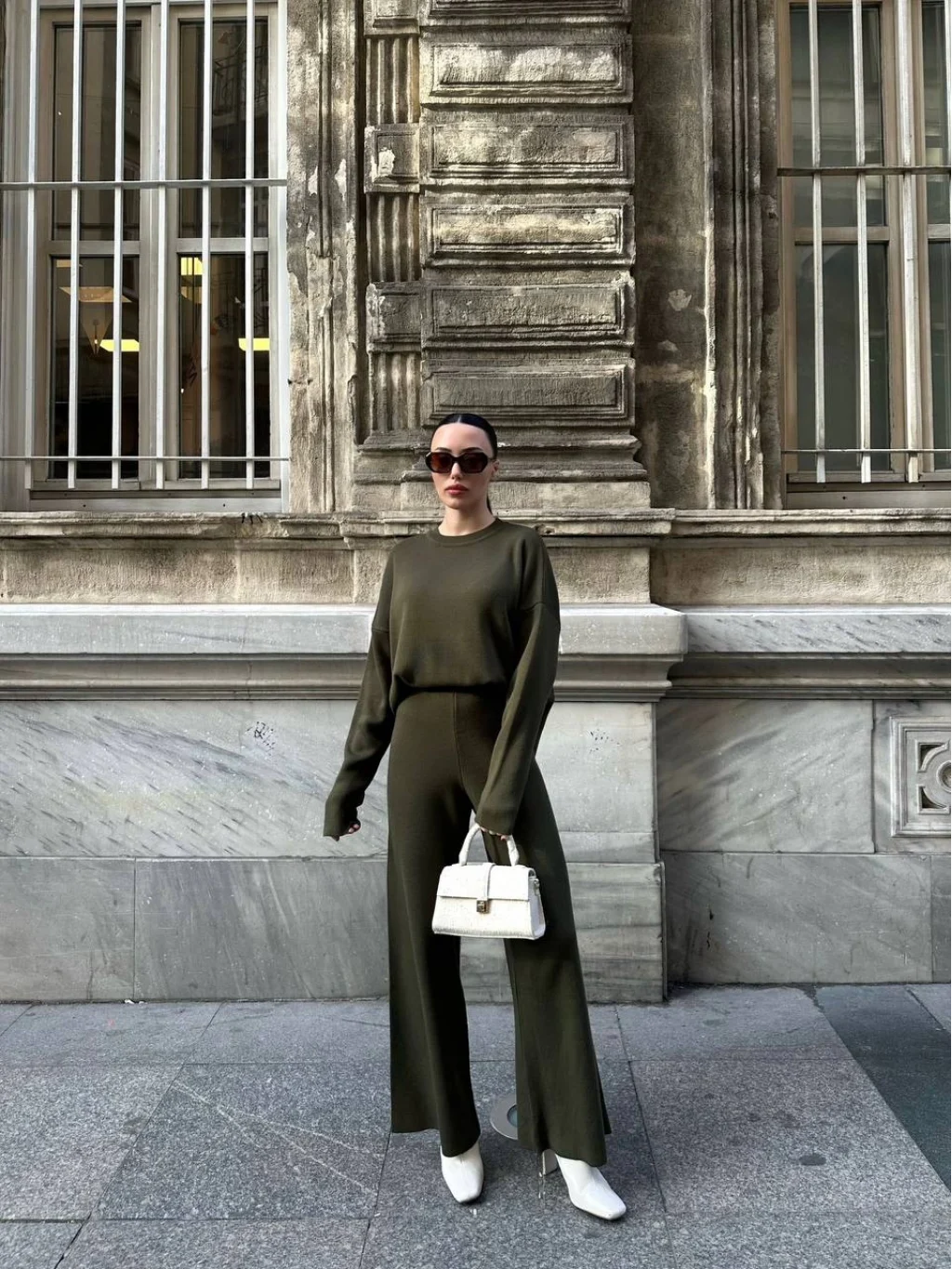 Bisiklet Yaka Yırtmaçlı Haki Kazak Pantolon Triko Takım