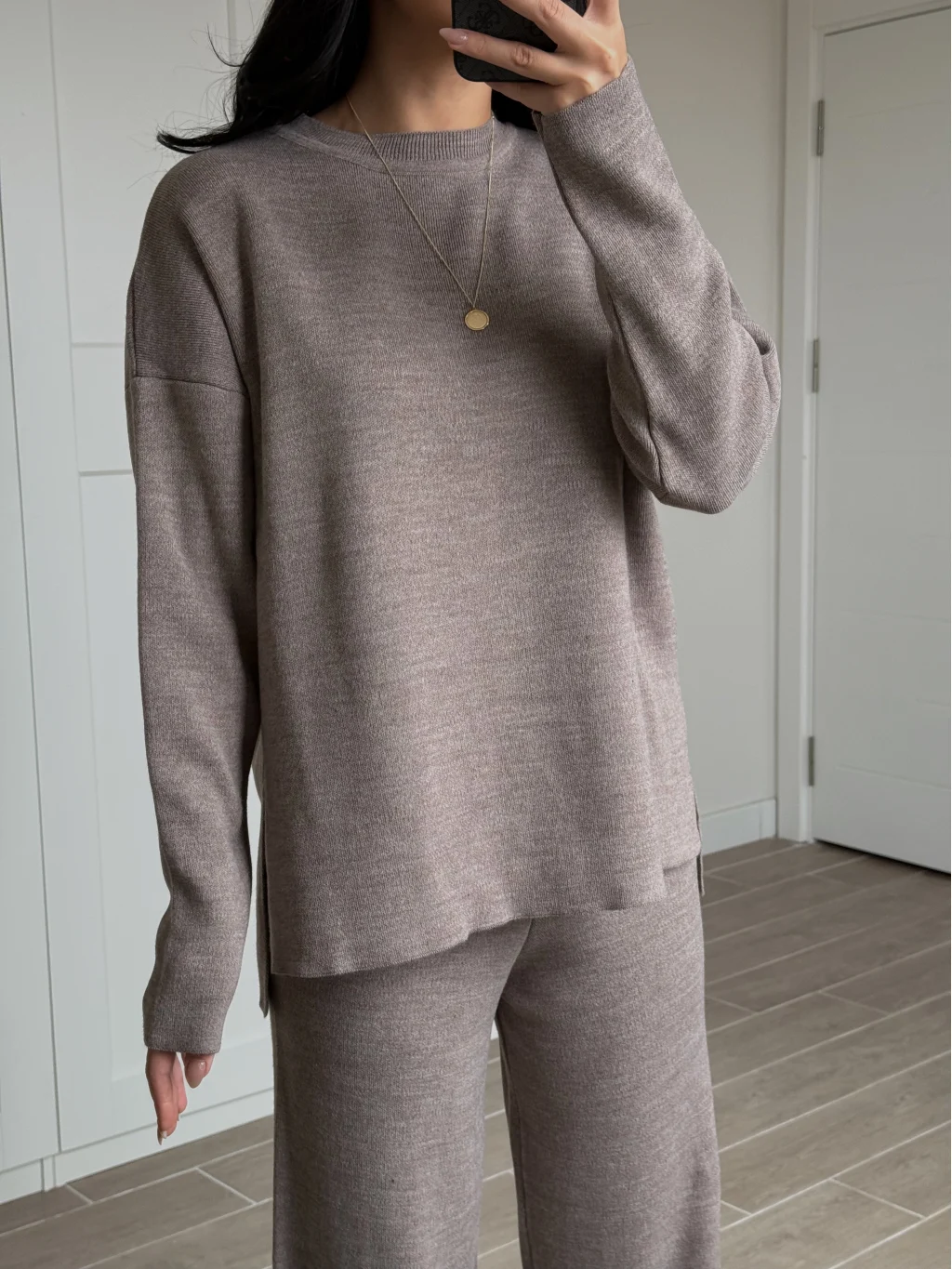 Bisiklet Yaka Yırtmaçlı Vizon Kazak Pantolon Triko Takım