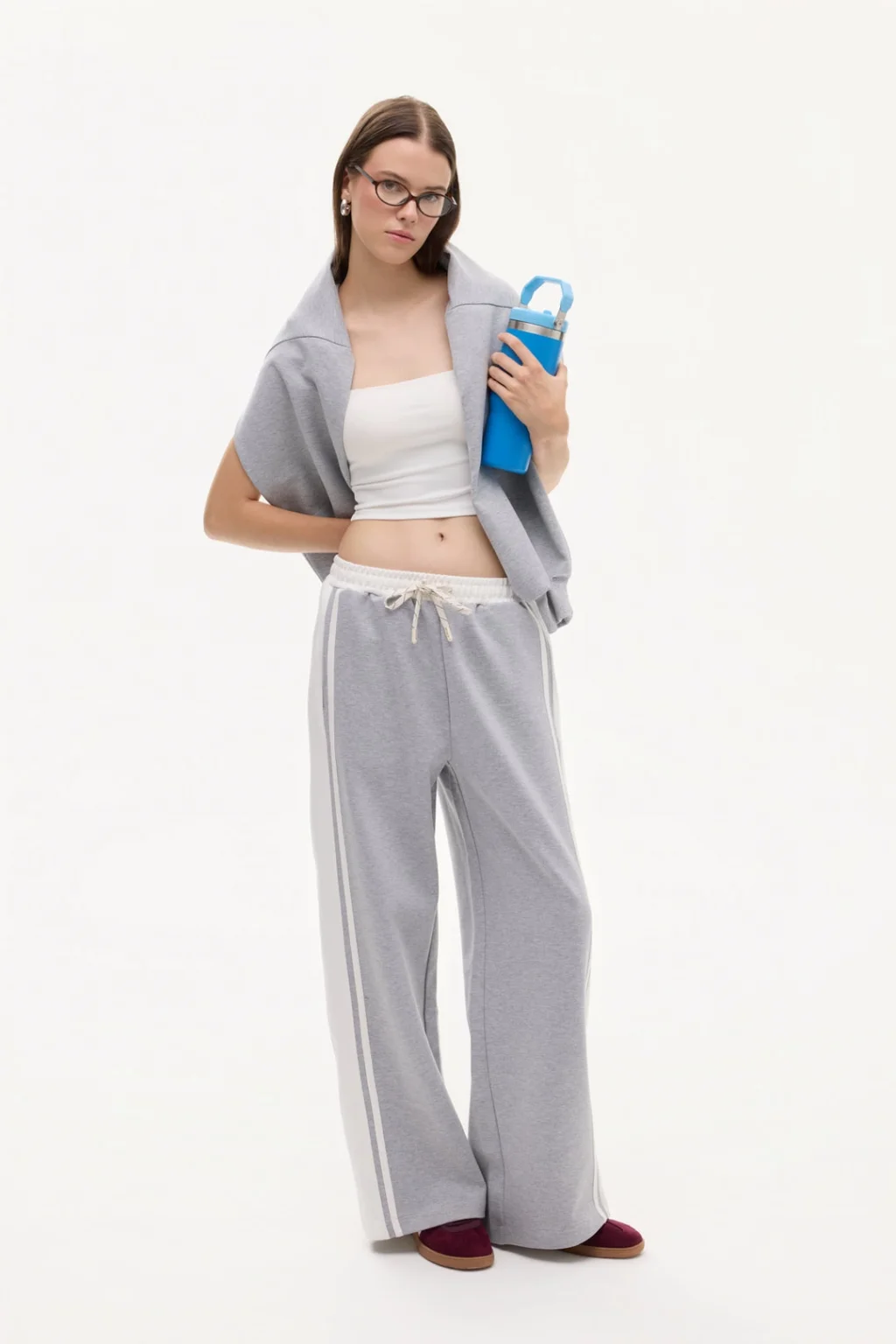 Yanları kontrast renk blok detaylı, beli büzgülü ve bağcıklı, bol paça, yüksek bel, cepli, rahat kesim eşofman altı.