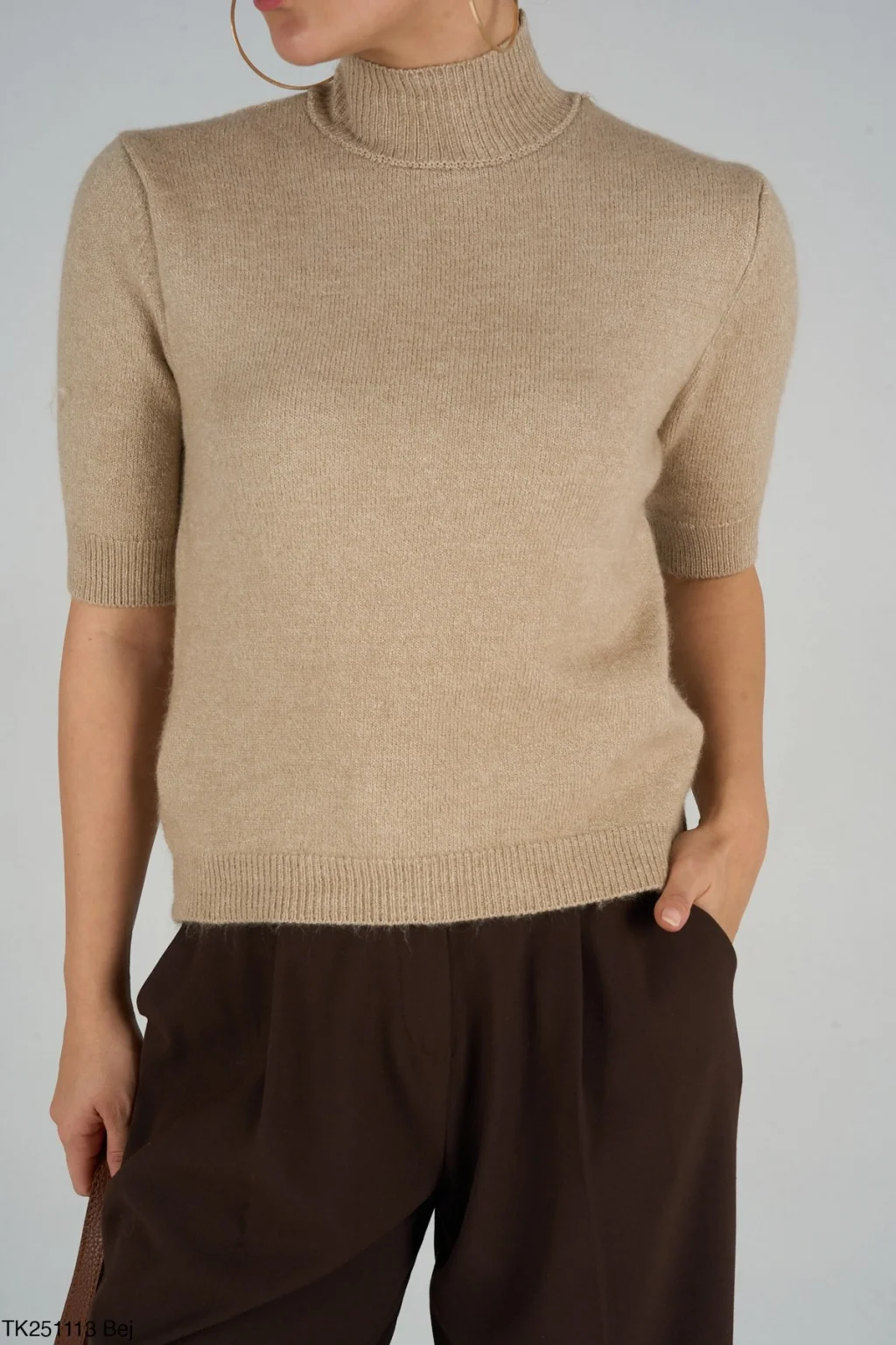 Boğazlı Kısa Kol Triko Kazak-Bej