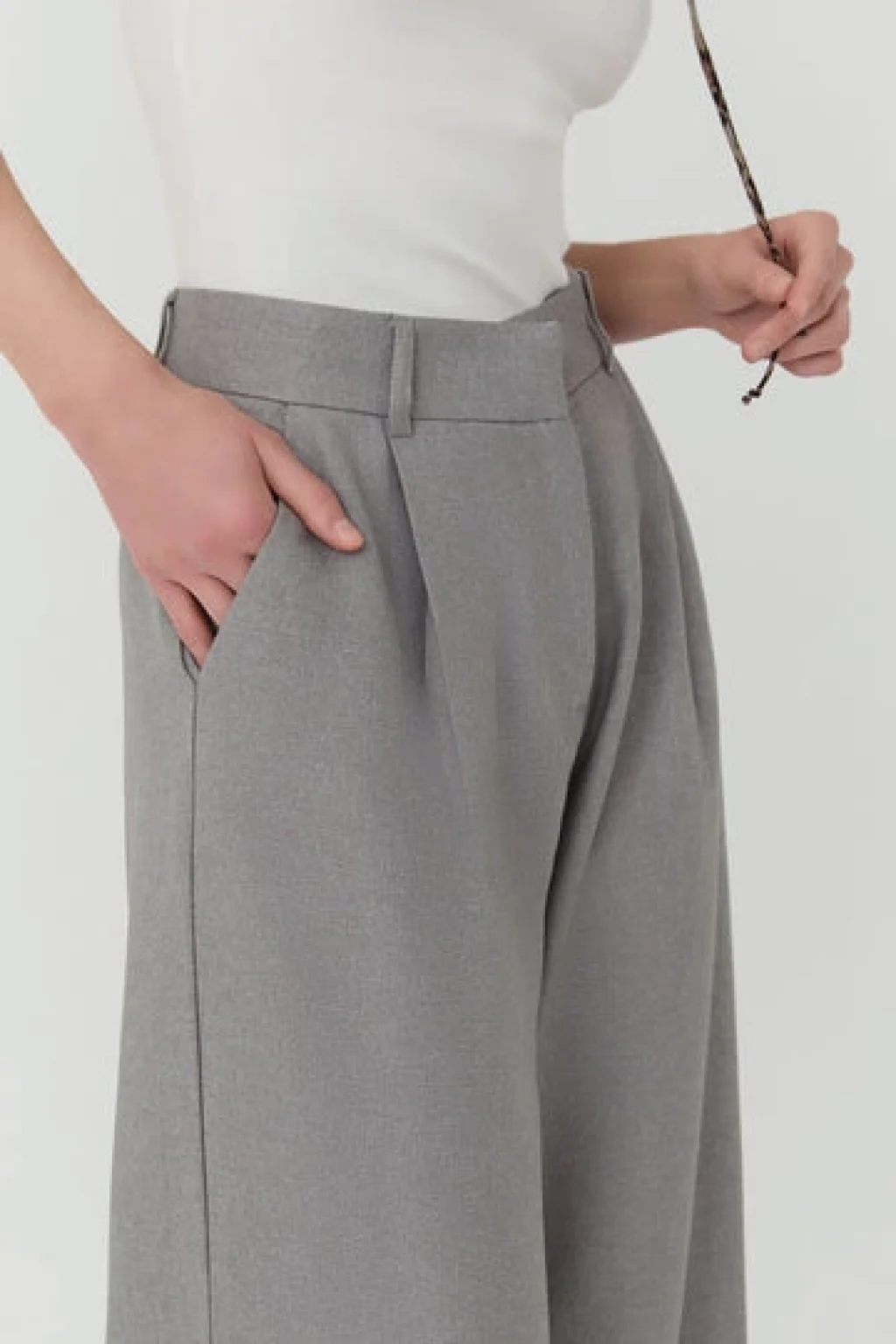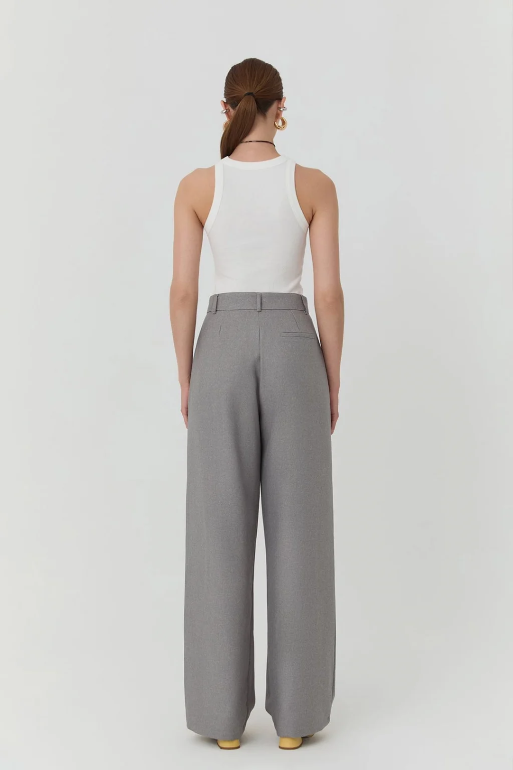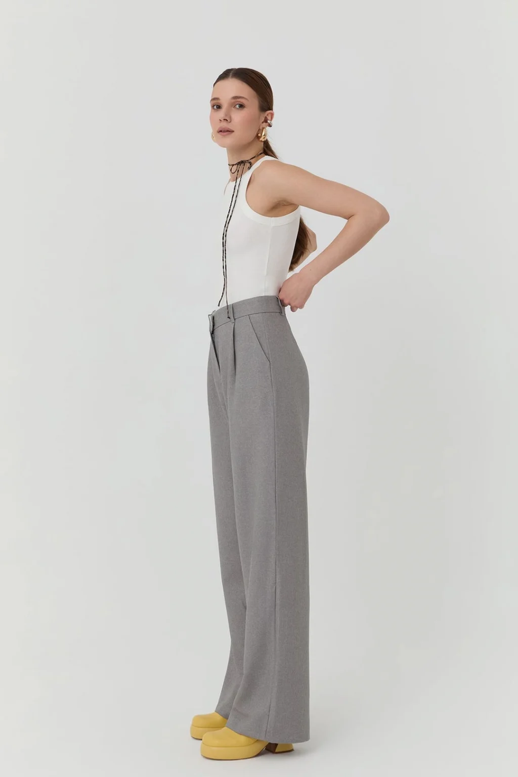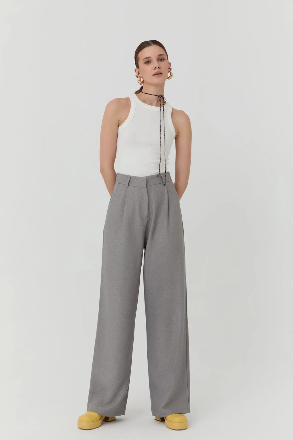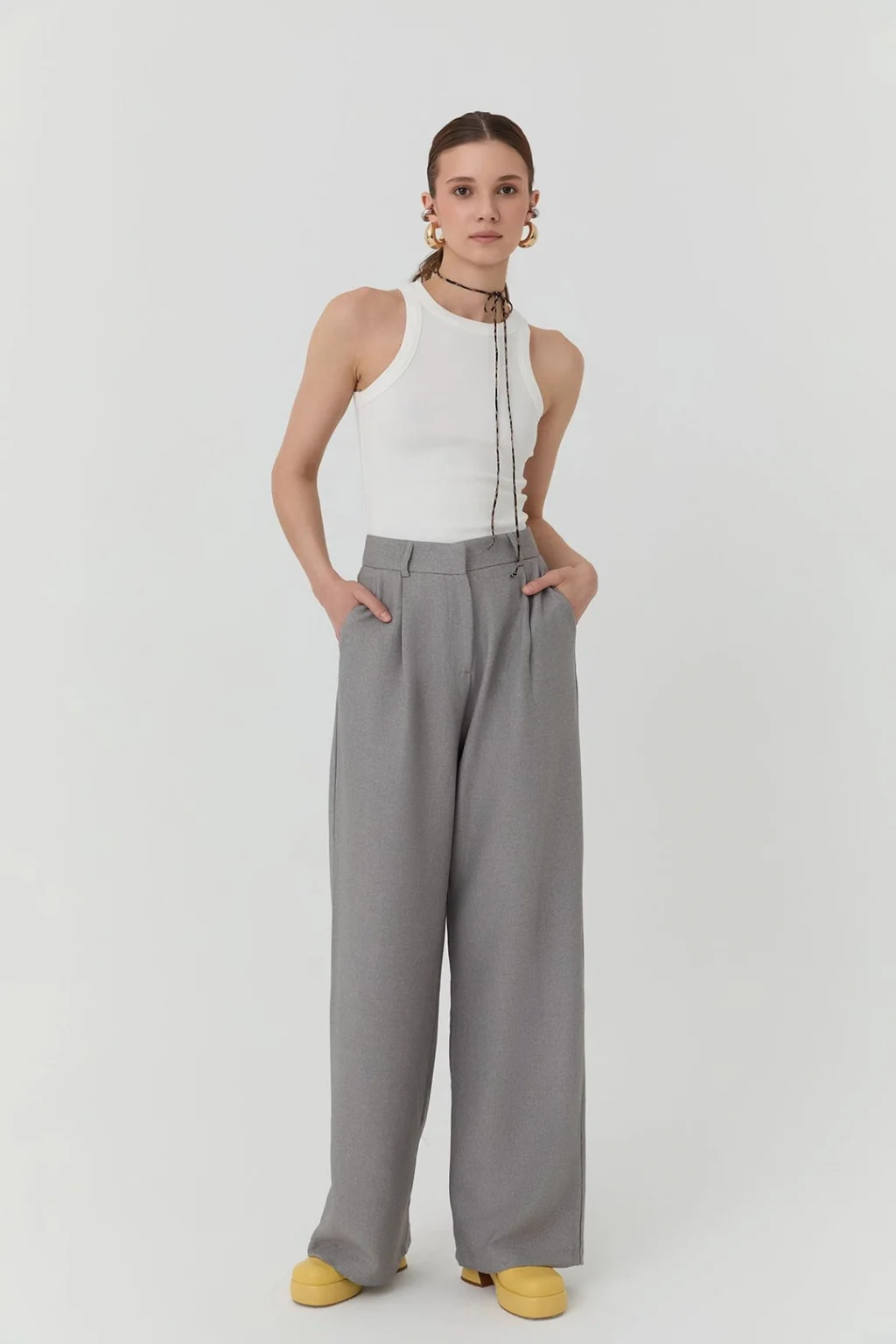 Yüksek bel, çift cepli, gizli kanca kapatmalı, bol paça, kumaş pantolon.