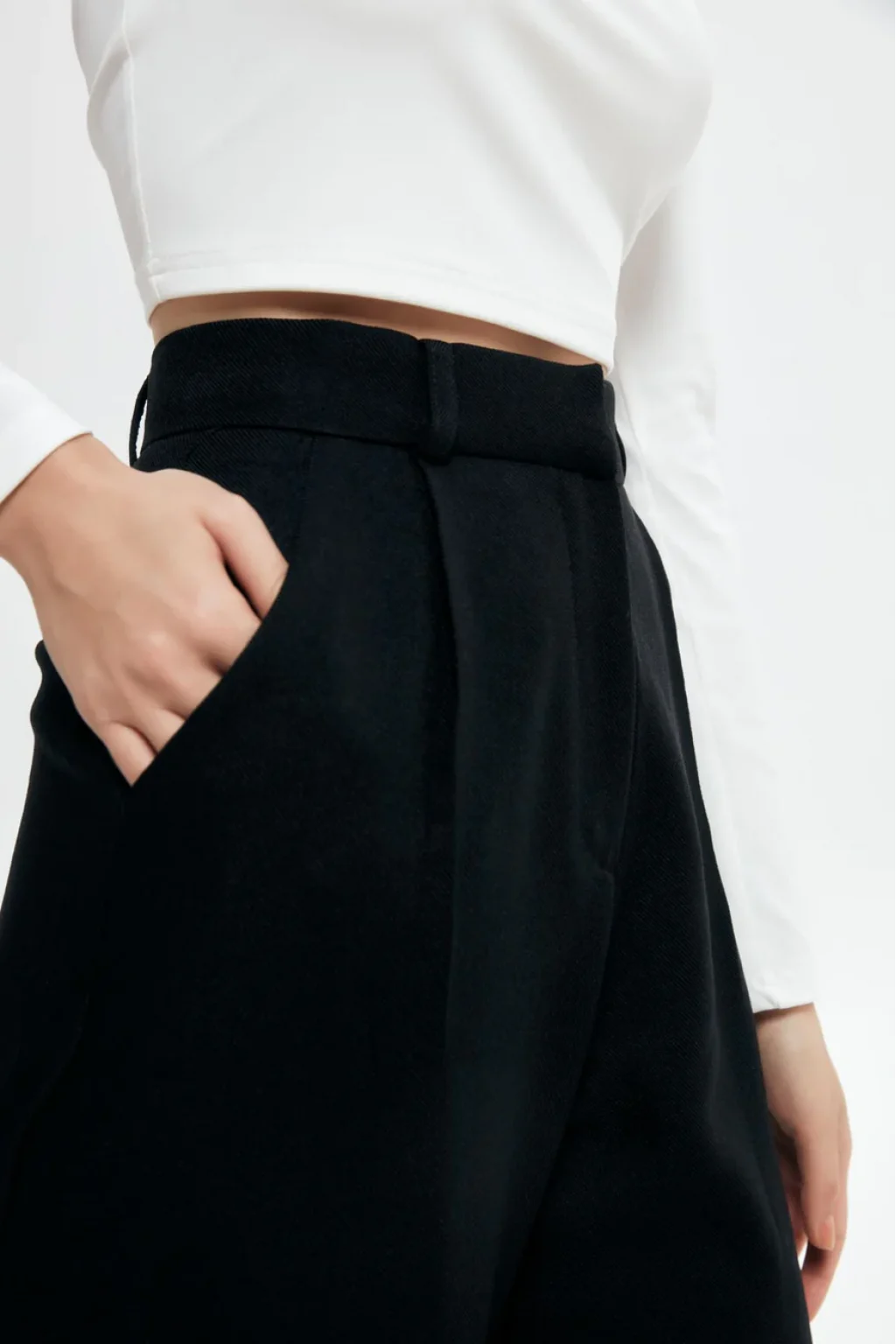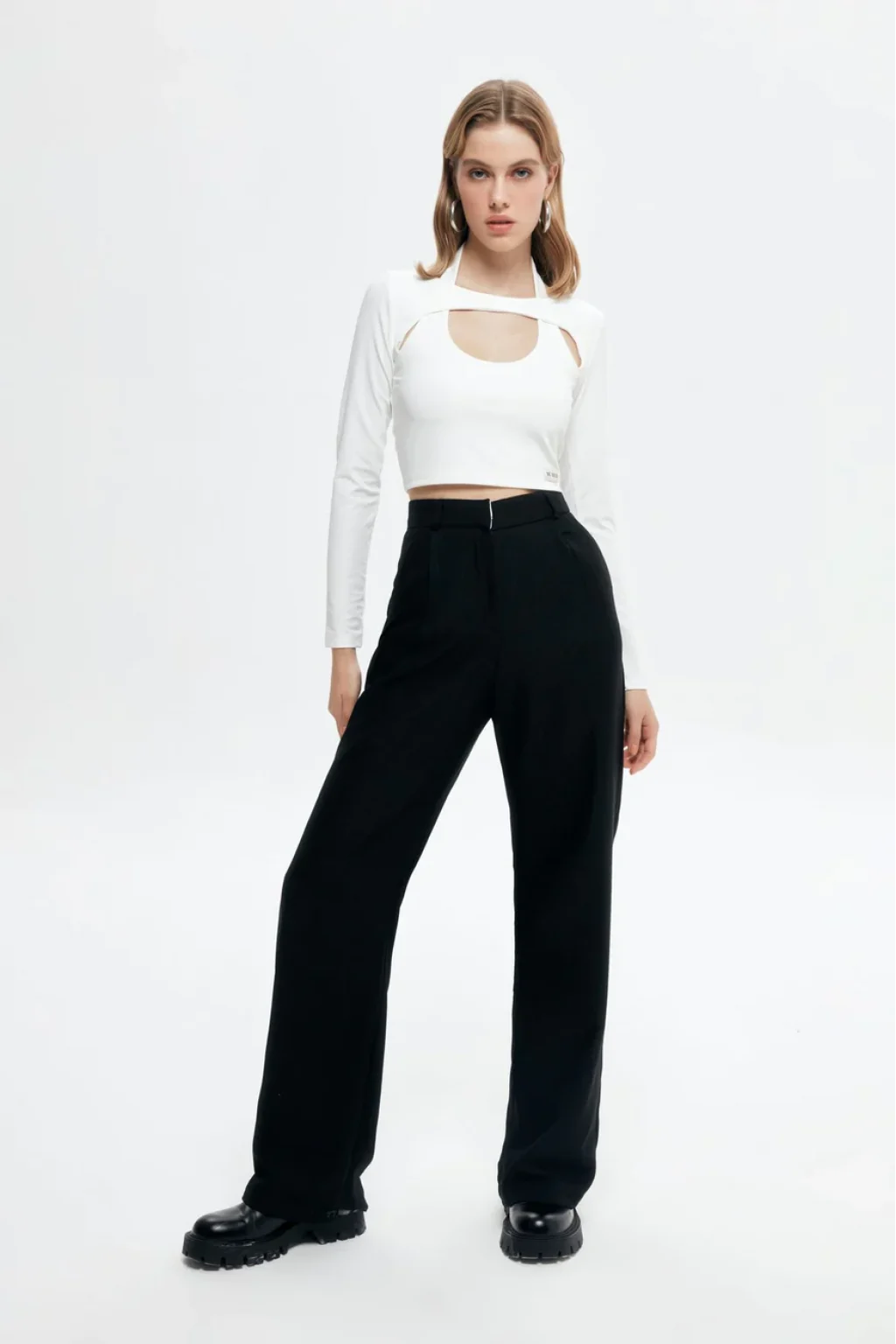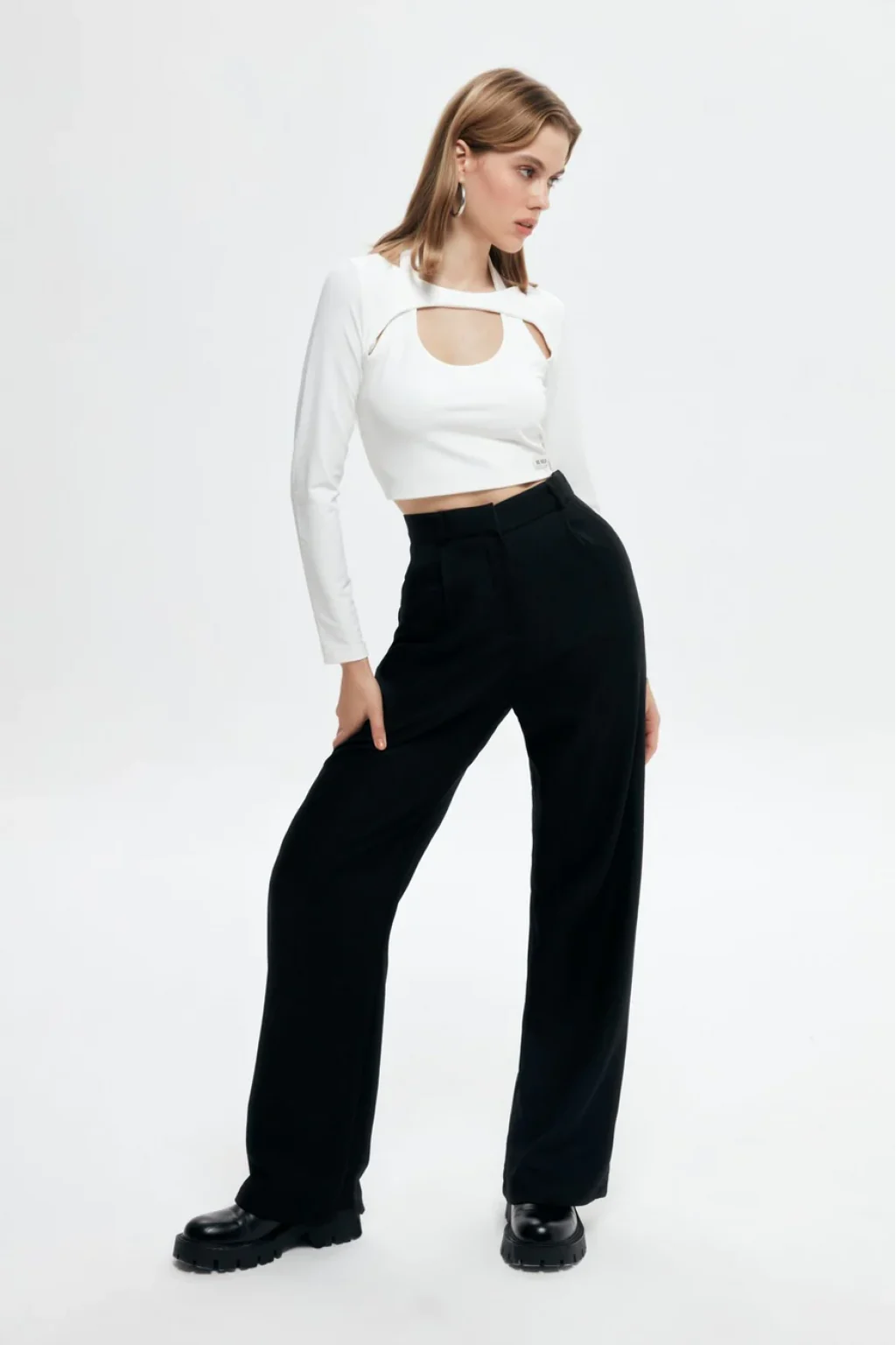 QUZU Marka, Yüksek bel, çift cepli, gizli kanca kapatmalı, bol paça, kumaş pantolon.
