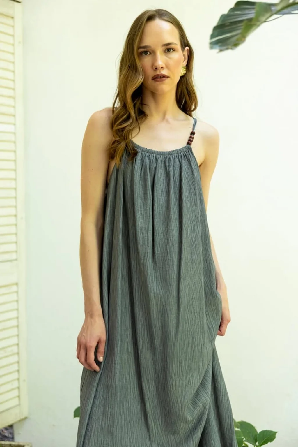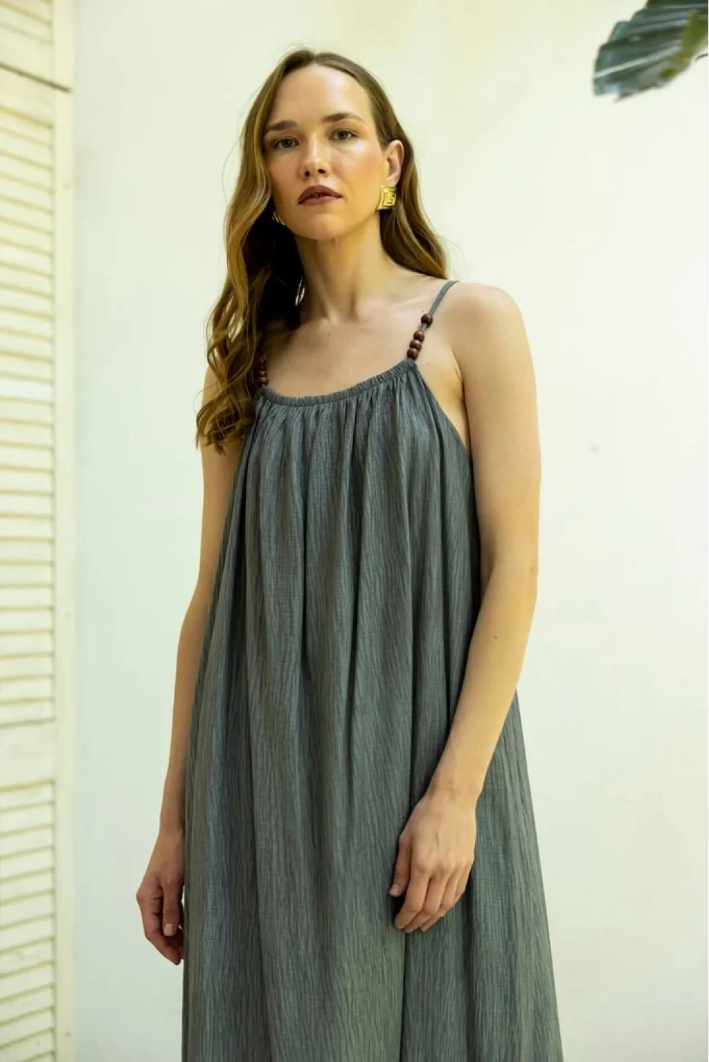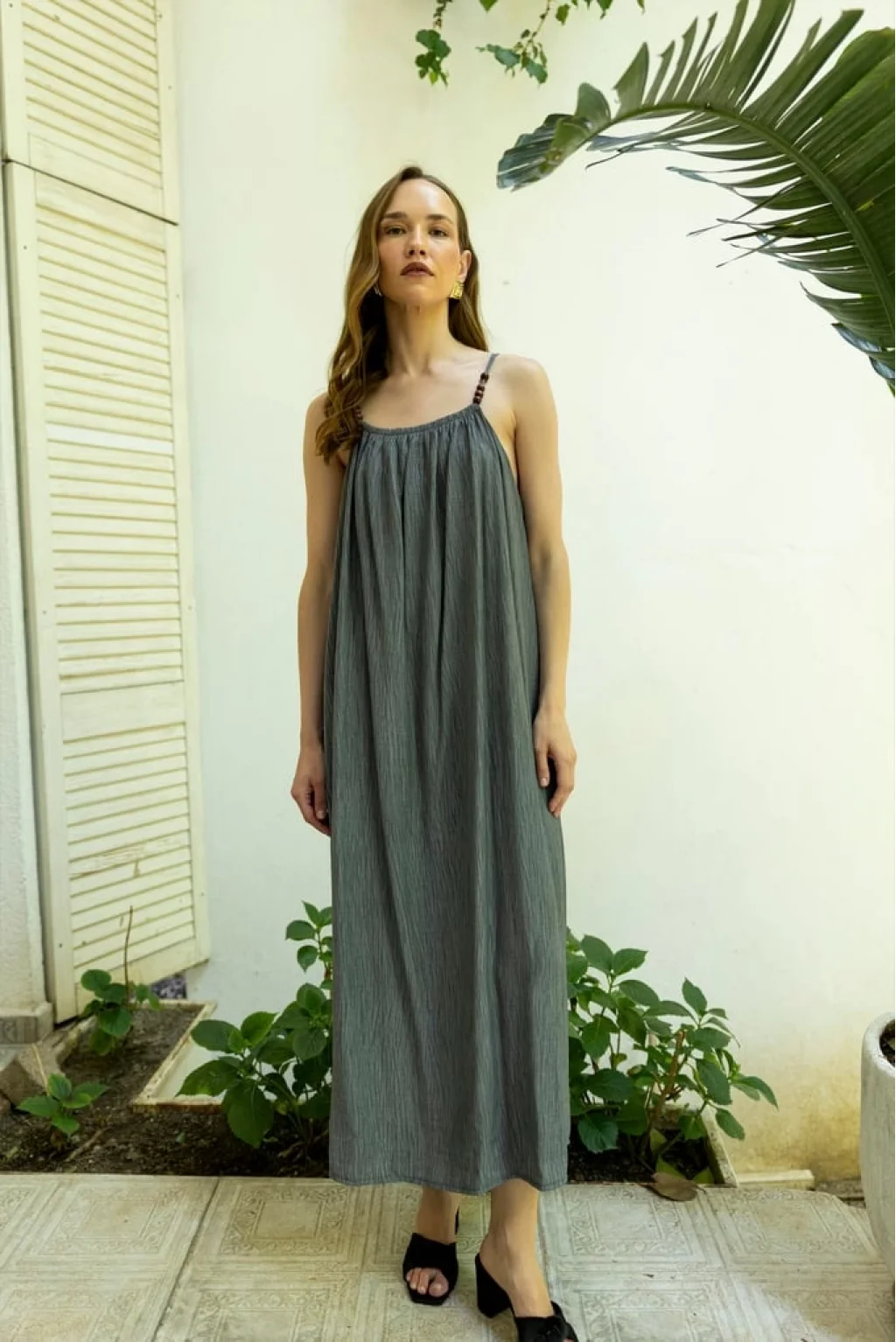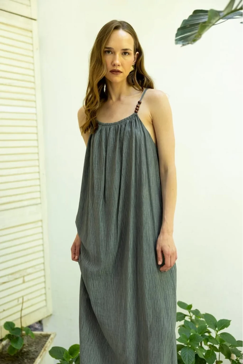 İnce Askılı Standart Beden Boncuk Detaylı İç Astarlı Uzun Antrasit Elbise