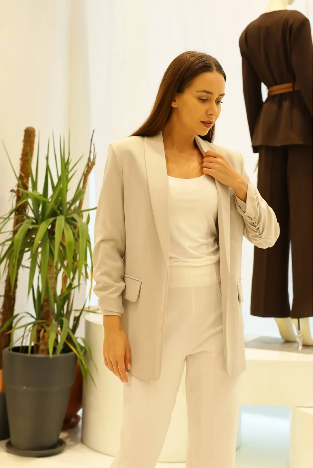Kolları büzgülü , astarlı , şal yaka kahverengi blazer ceket