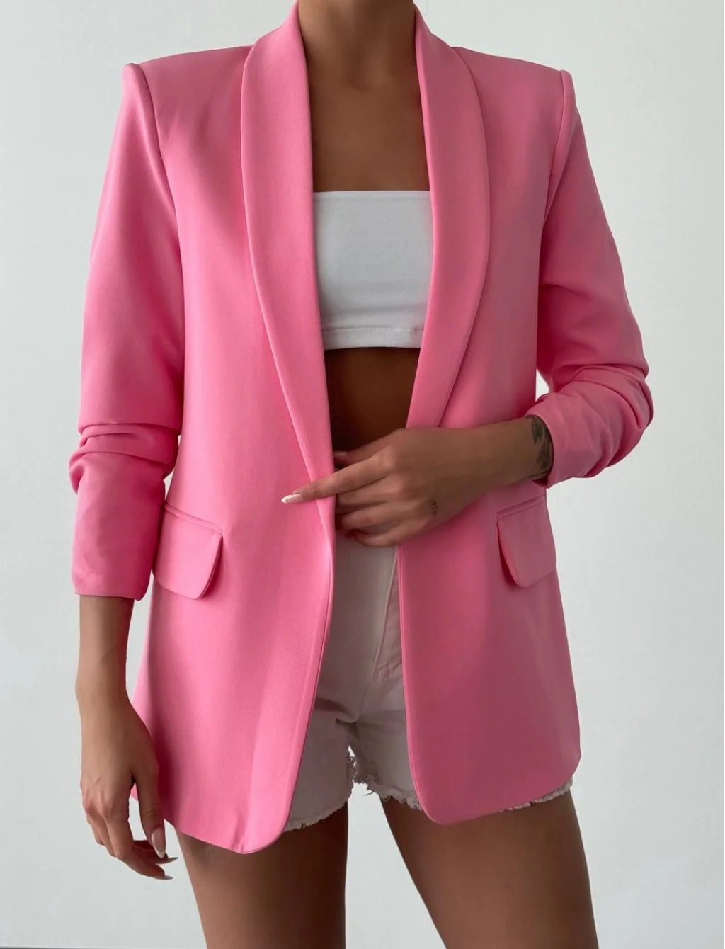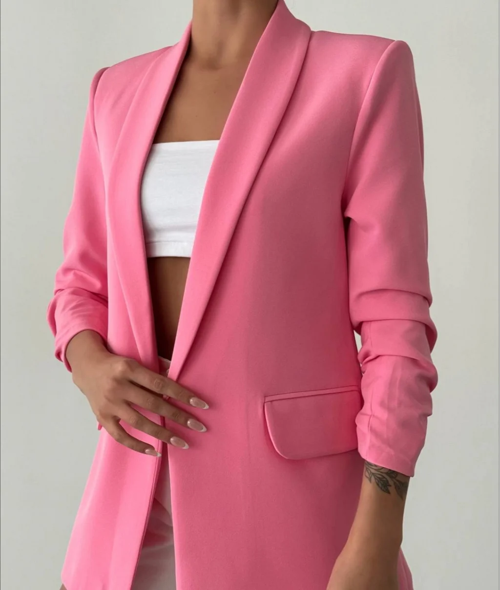 • Zarif fırfırlı kol detayları, bu pembe blazerin eşsiz görünümüne katkıda bulunur.
