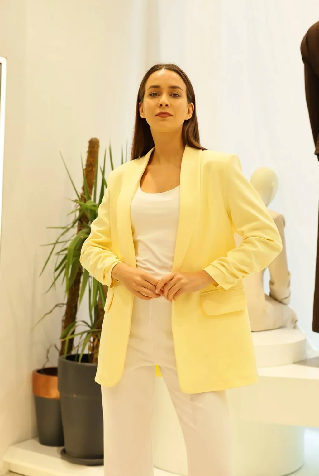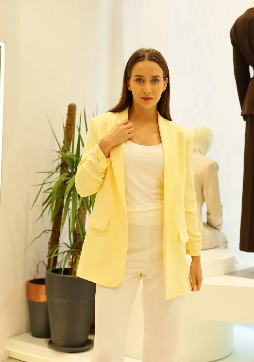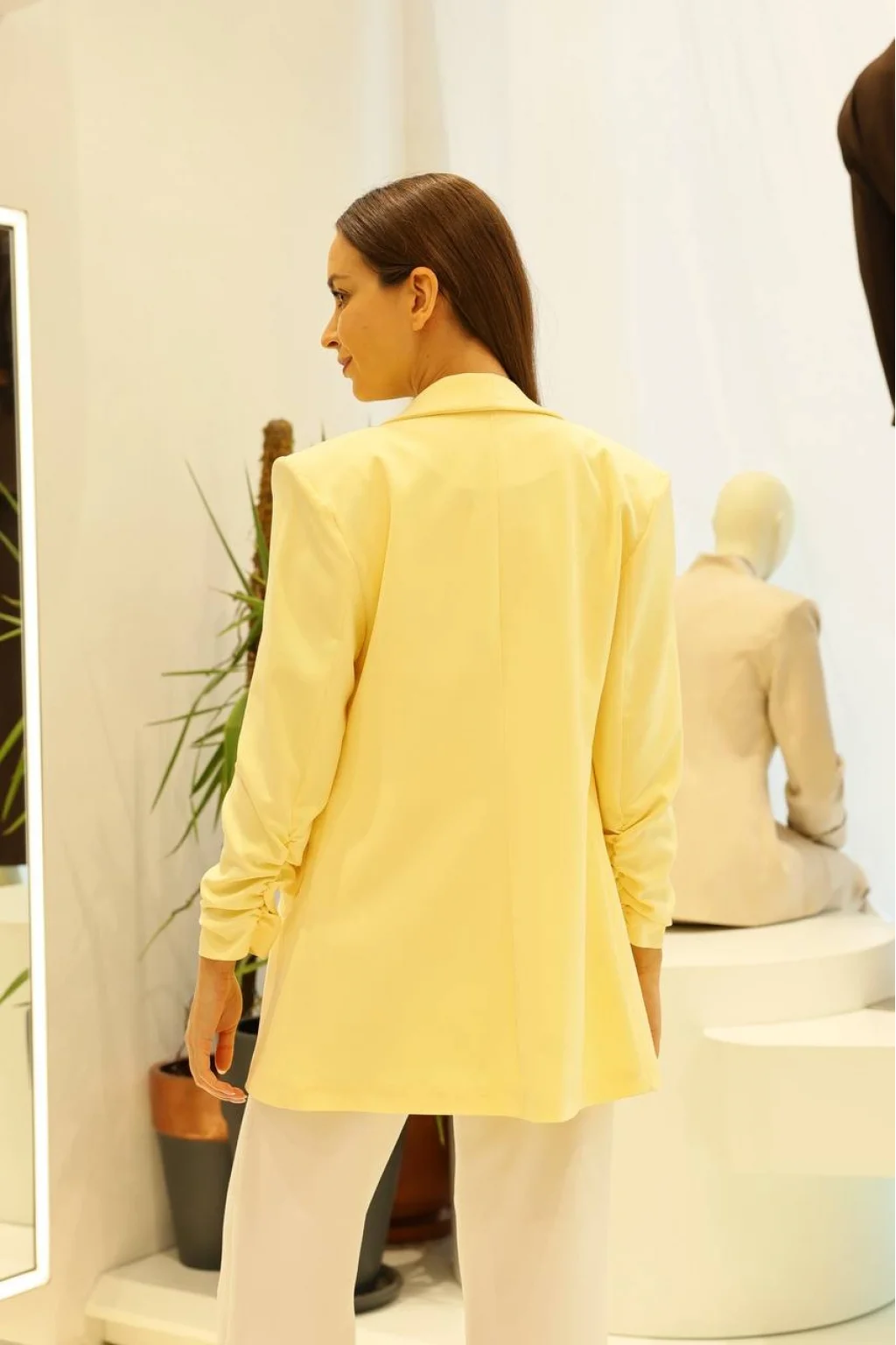 Zarif fırfırlı kol detayları, bu sarı blazerin eşsiz görünümüne katkıda bulunur.