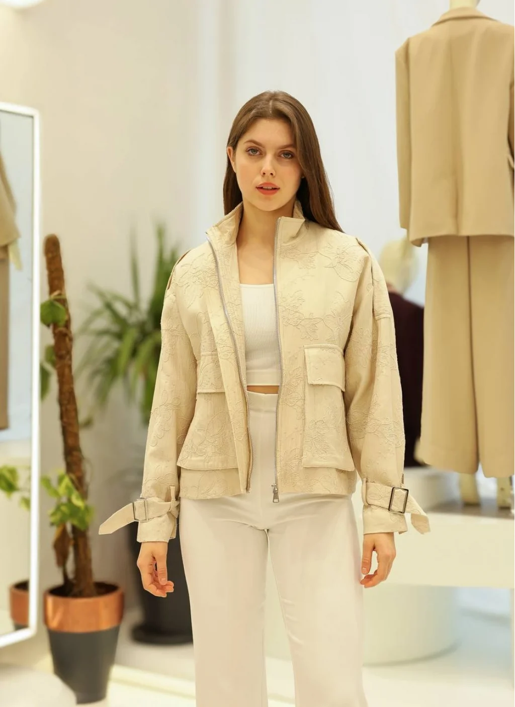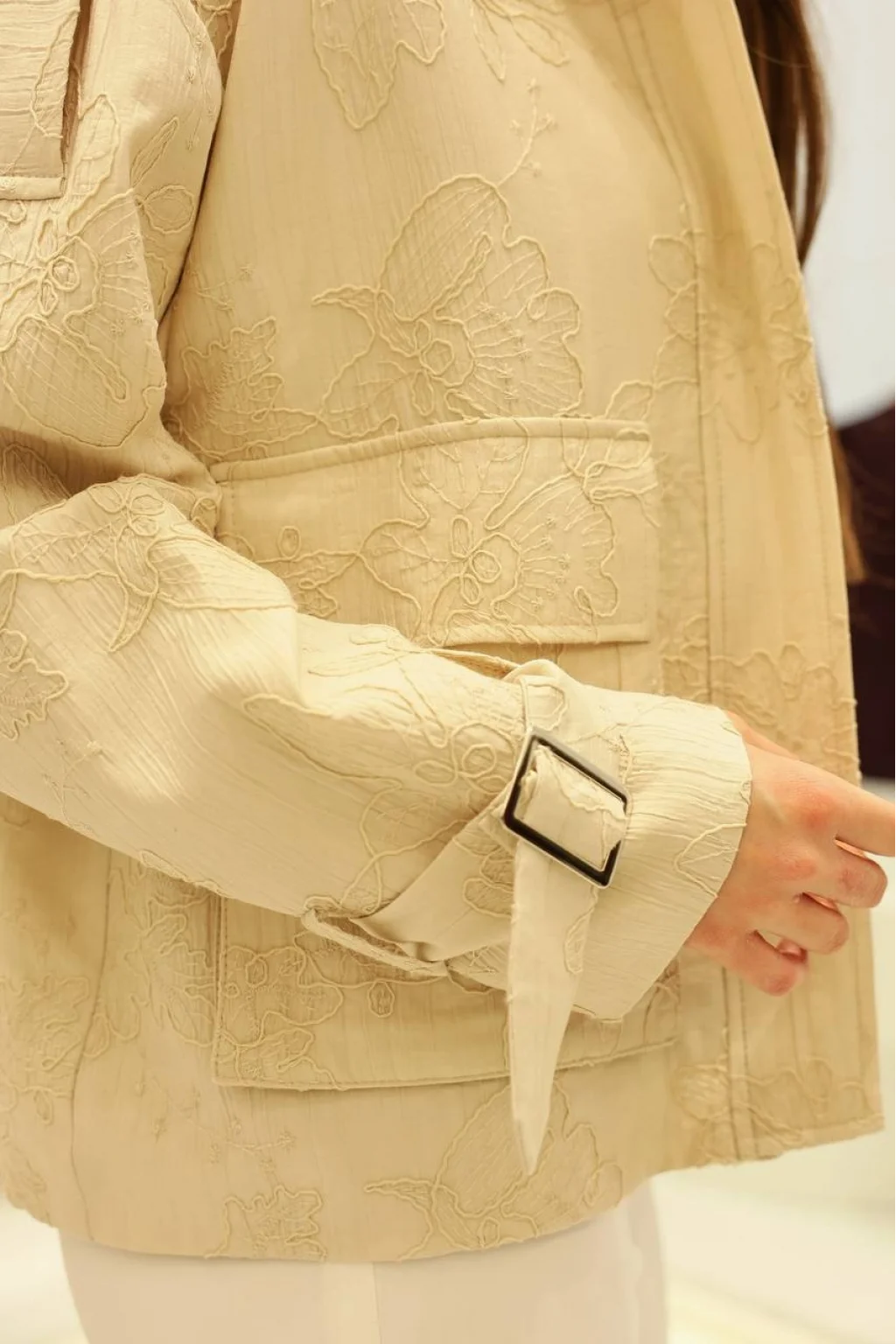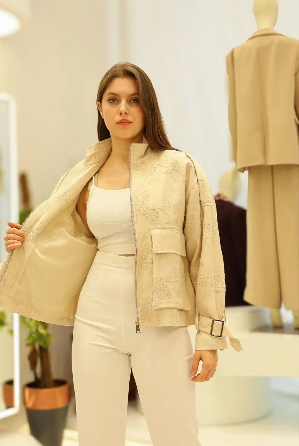• Çiçek Nakışlı Kol Kemerli Ceket -Taş, şıklığıyla göz kamaştıran bir seçenektir.